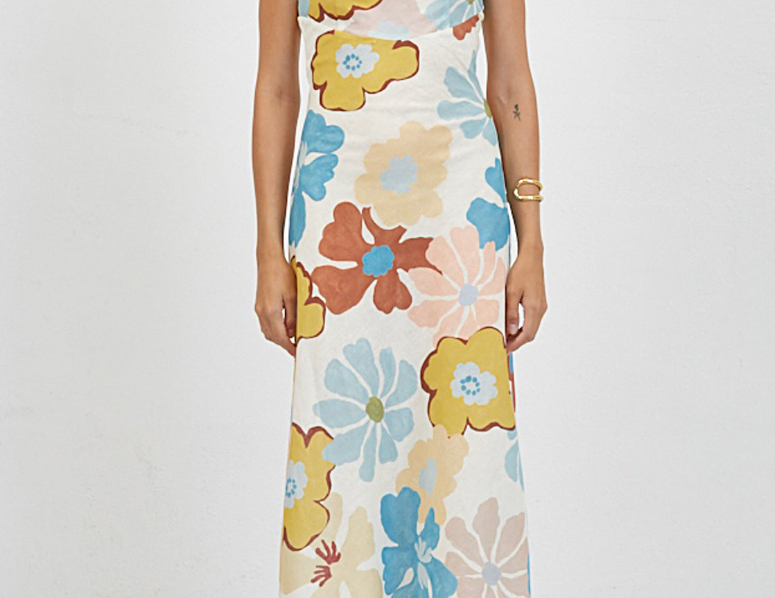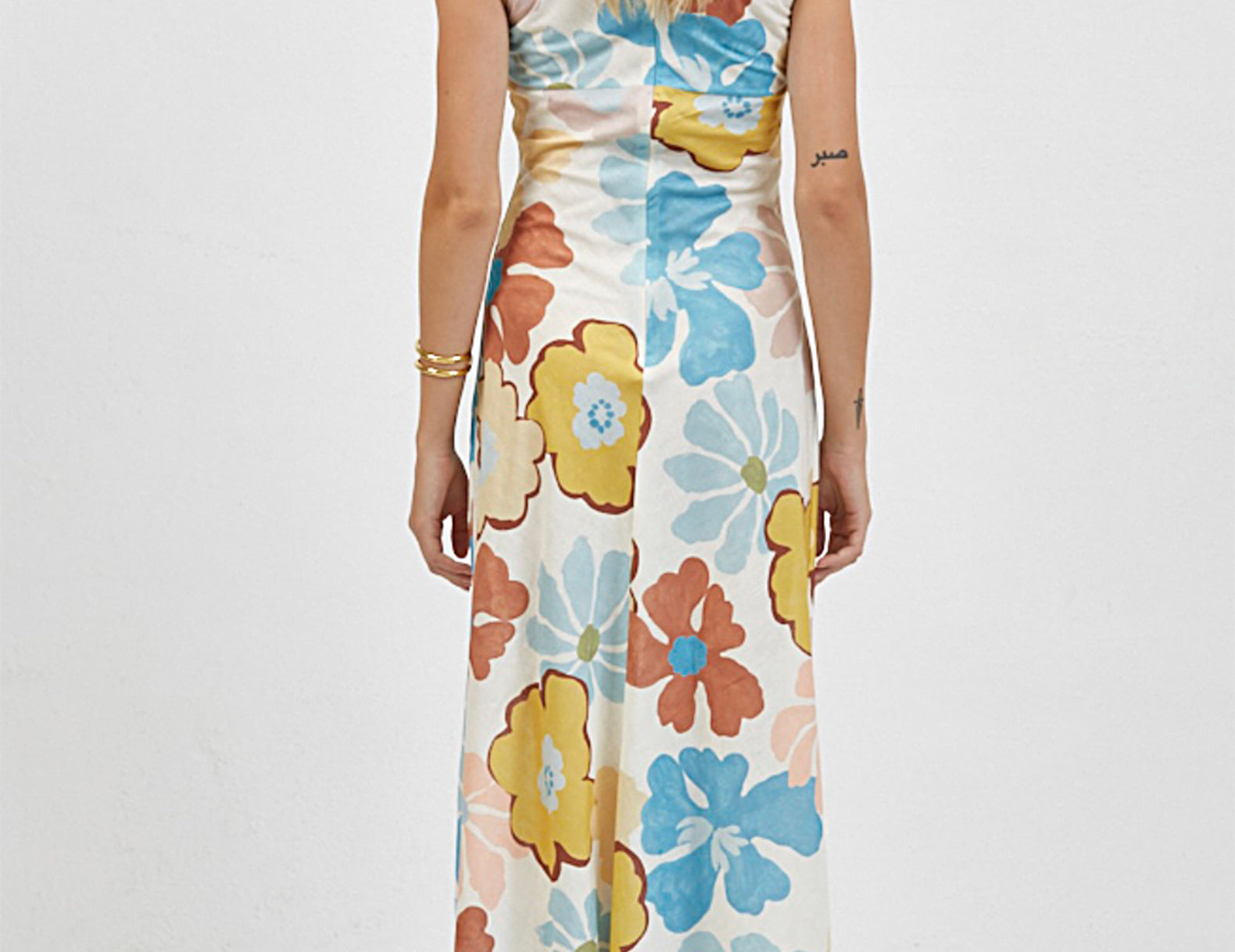 Pair the floral maxi dress with mesh flats and stacked bangles on sunny days.