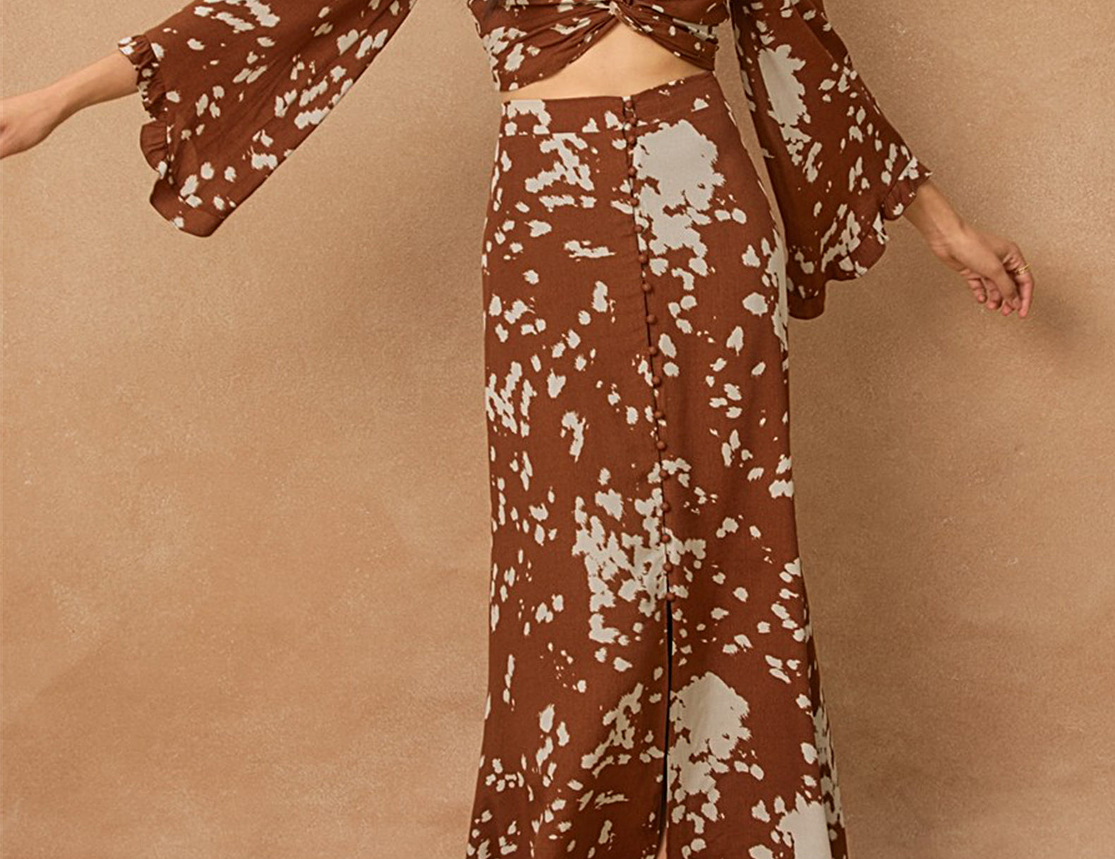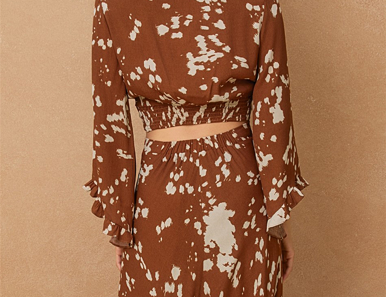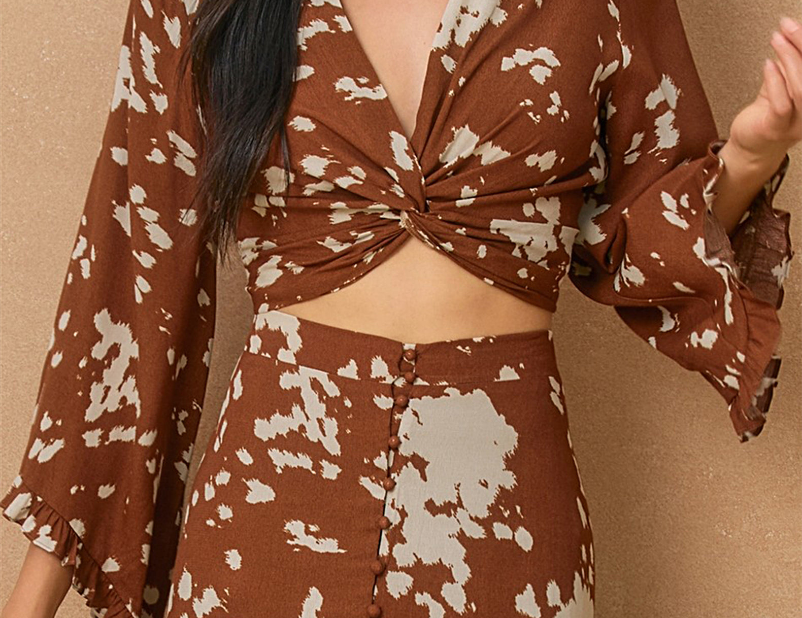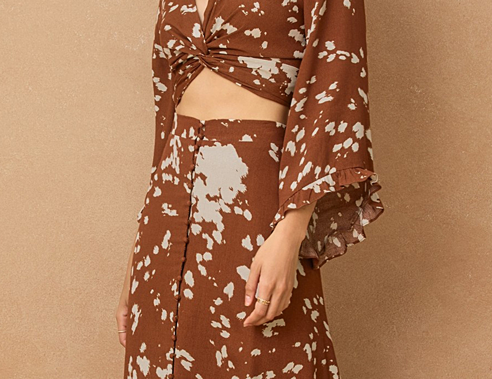 Soft and slinky in an abstract speckled print, the Macie top is cut to a unique shape with a fitted bodice and wide, flowing sleeves. It's twisted at the center, below a deep-V neckline, leaving a just-right peekaboo at the midrift. The wrist-length bell sleeves are finished with a subtle ruffle detail. Pair this artful top with wide-leg trousers, straight-leg jeans, or make it a set with the Macie Spotted Button Midi Skirt.