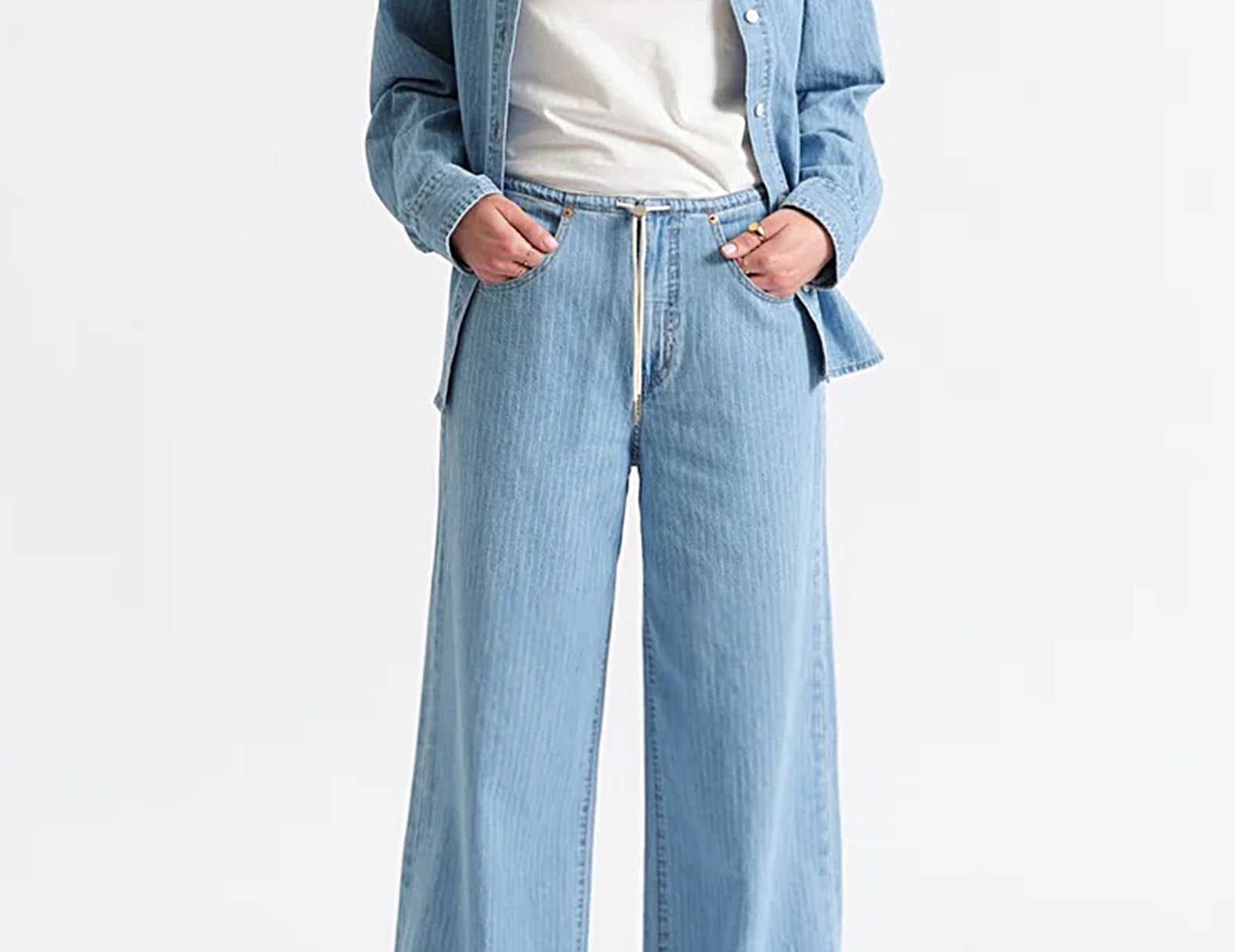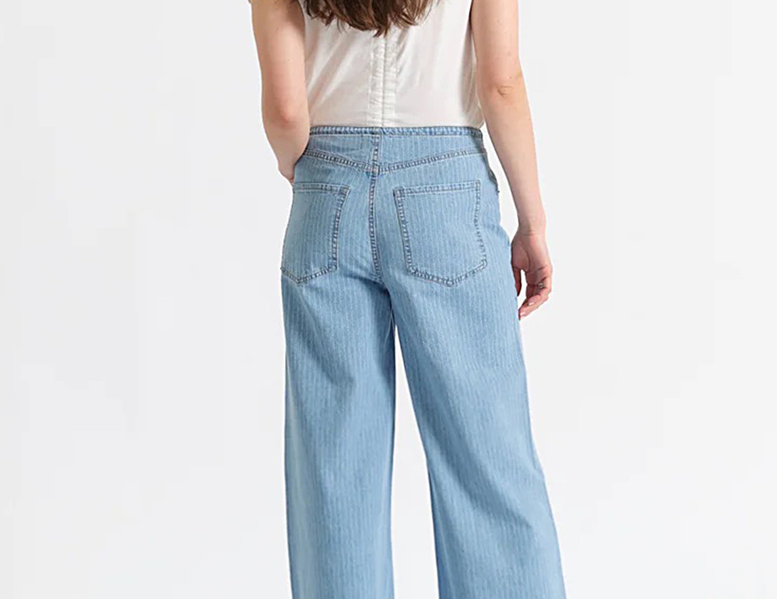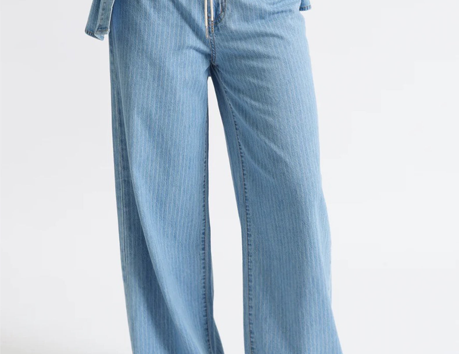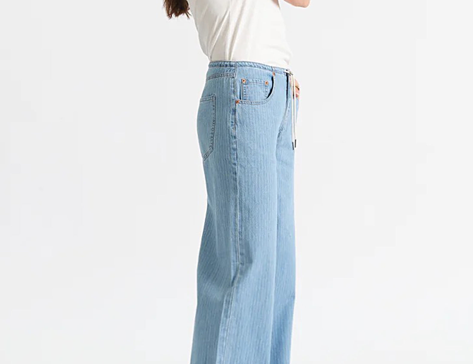 Relaxed in a soft, mid-rise denim, the Madison jeans are low on structure but high on style. The legs are cut wide below a drawstring waist. The 100% cotton denim is finished with a delicate, vertical railroad stripe throughout.