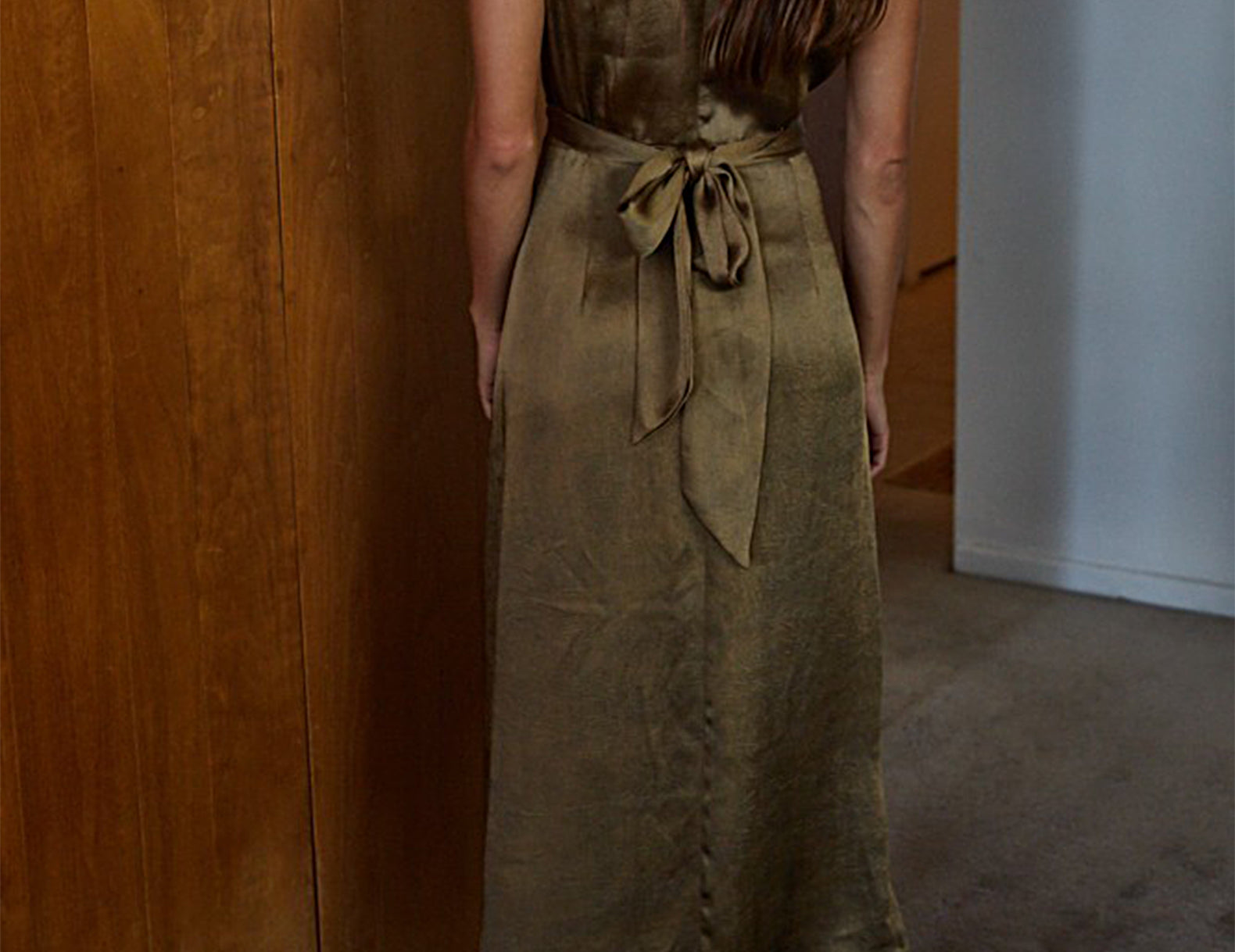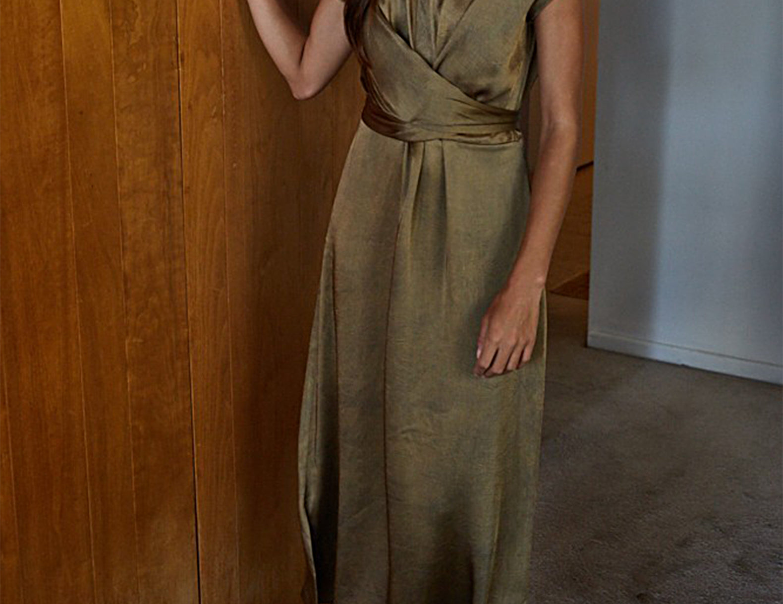 In a unique, wrapped bodice design, the Maelle satin dress is both eye-catching and easy to wear. It's cut from weighted, liquid satin in a rich, olive-toned gold hue. The bra-friendly bodice features a high, scooped neck, cap sleeves, and wide fabric panels that wrap around the waist, tying at the back. Pair this event-ready dress with tall, black leather boots and stacked gold bangles.