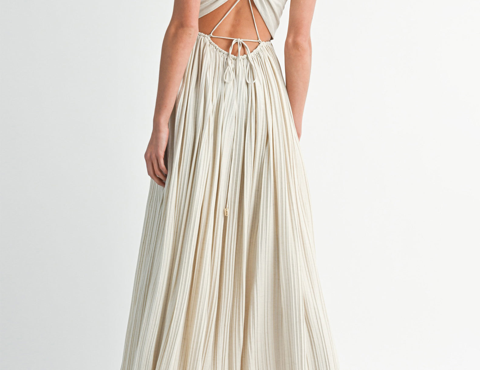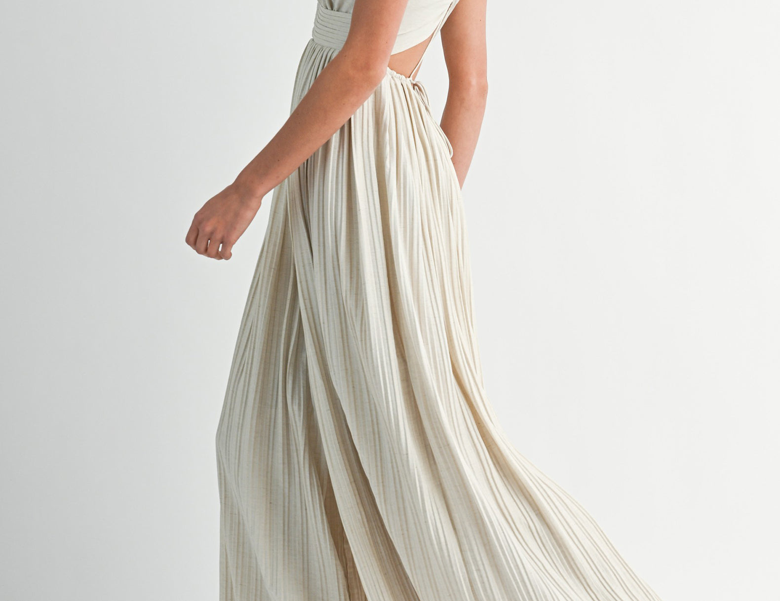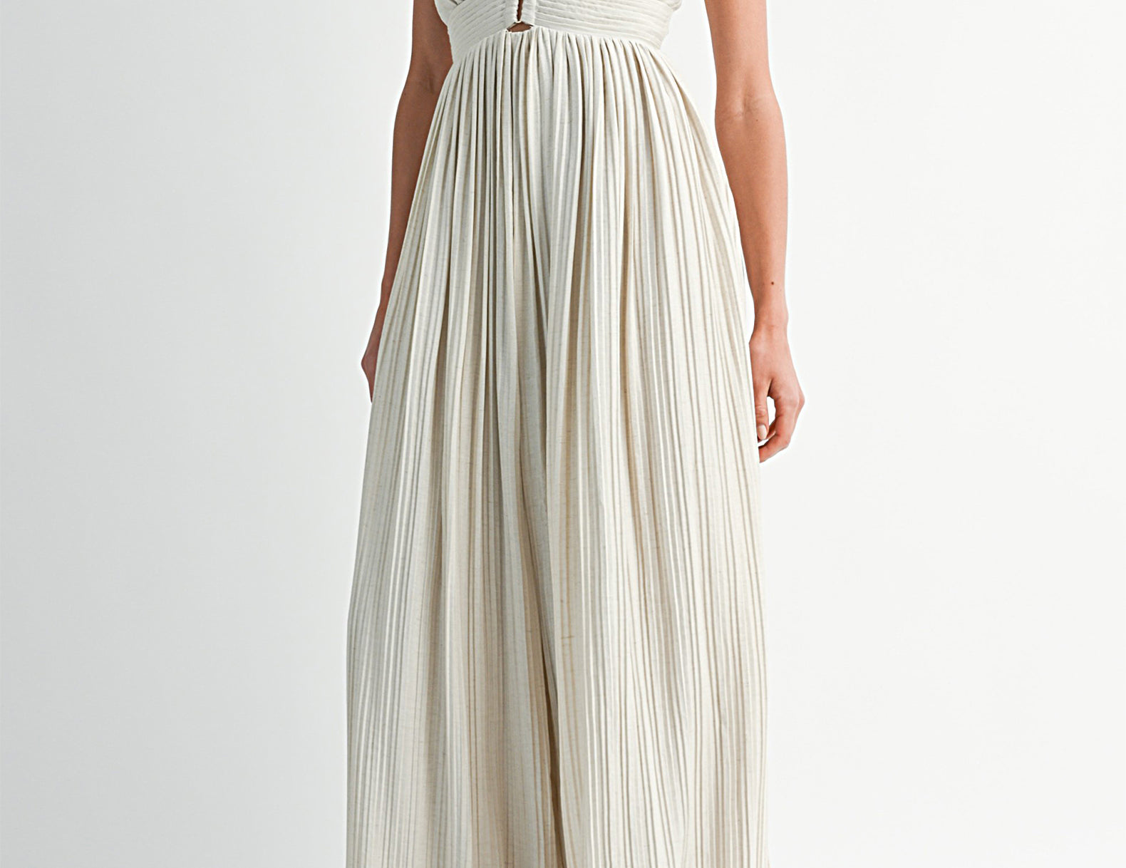 In a textural linen blend fabrication, the Maeve jumpsuit isn't loud, but it makes a statement. Below a triangle-cut bust, beautiful pleating defines the empire waist. Barely-there straps criss and cross at the back, intricately connecting the bottom to the top, and voluminous legs swish like a full, gathered skirt. Choose a bright lip and gold ballet flats for an elevated finish.