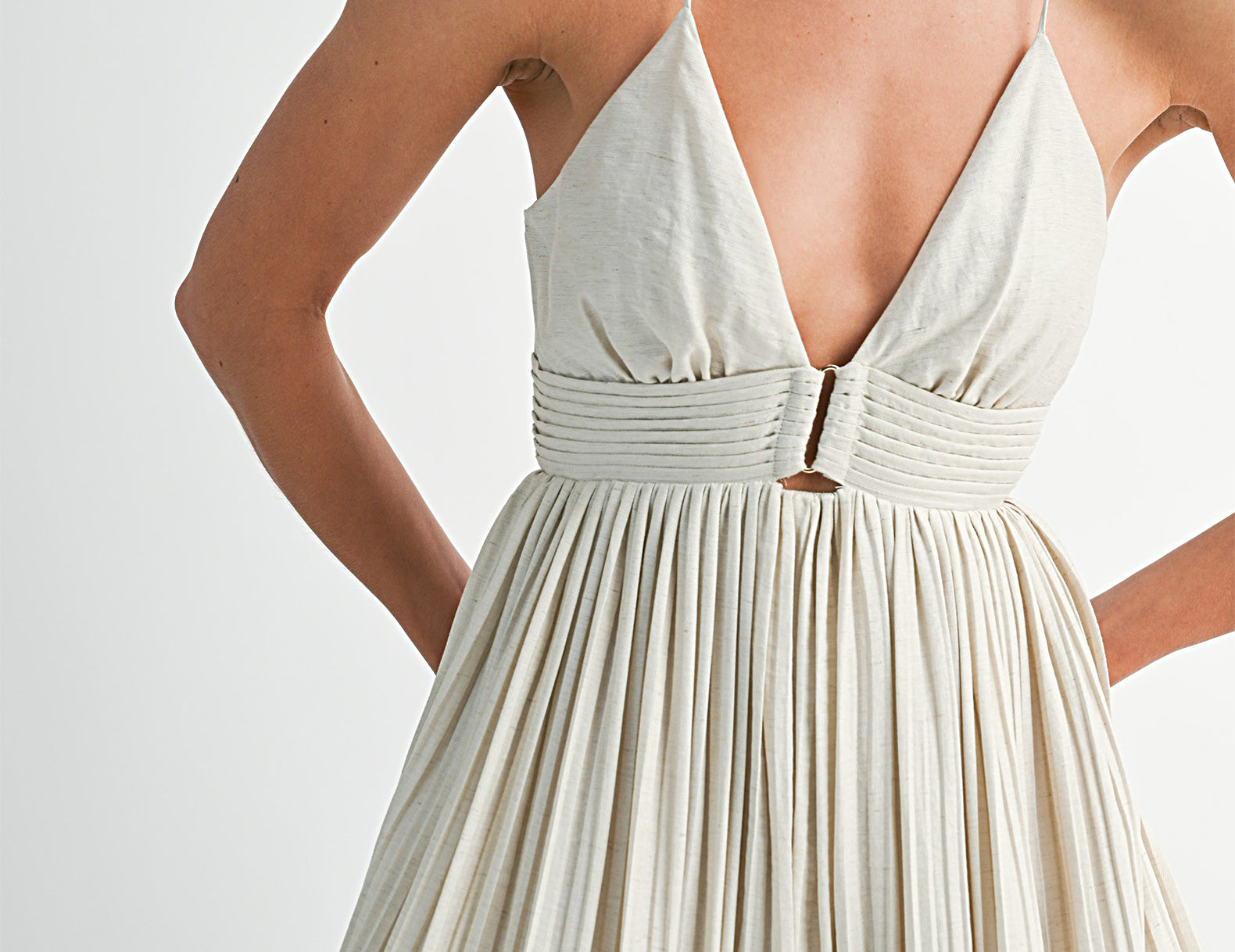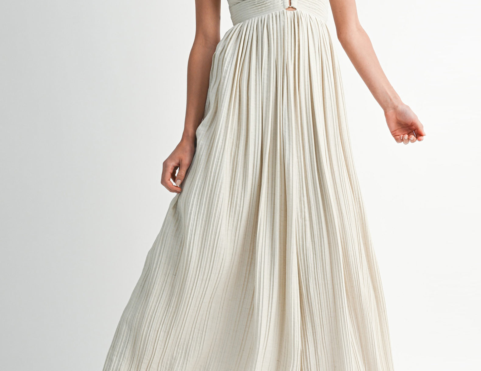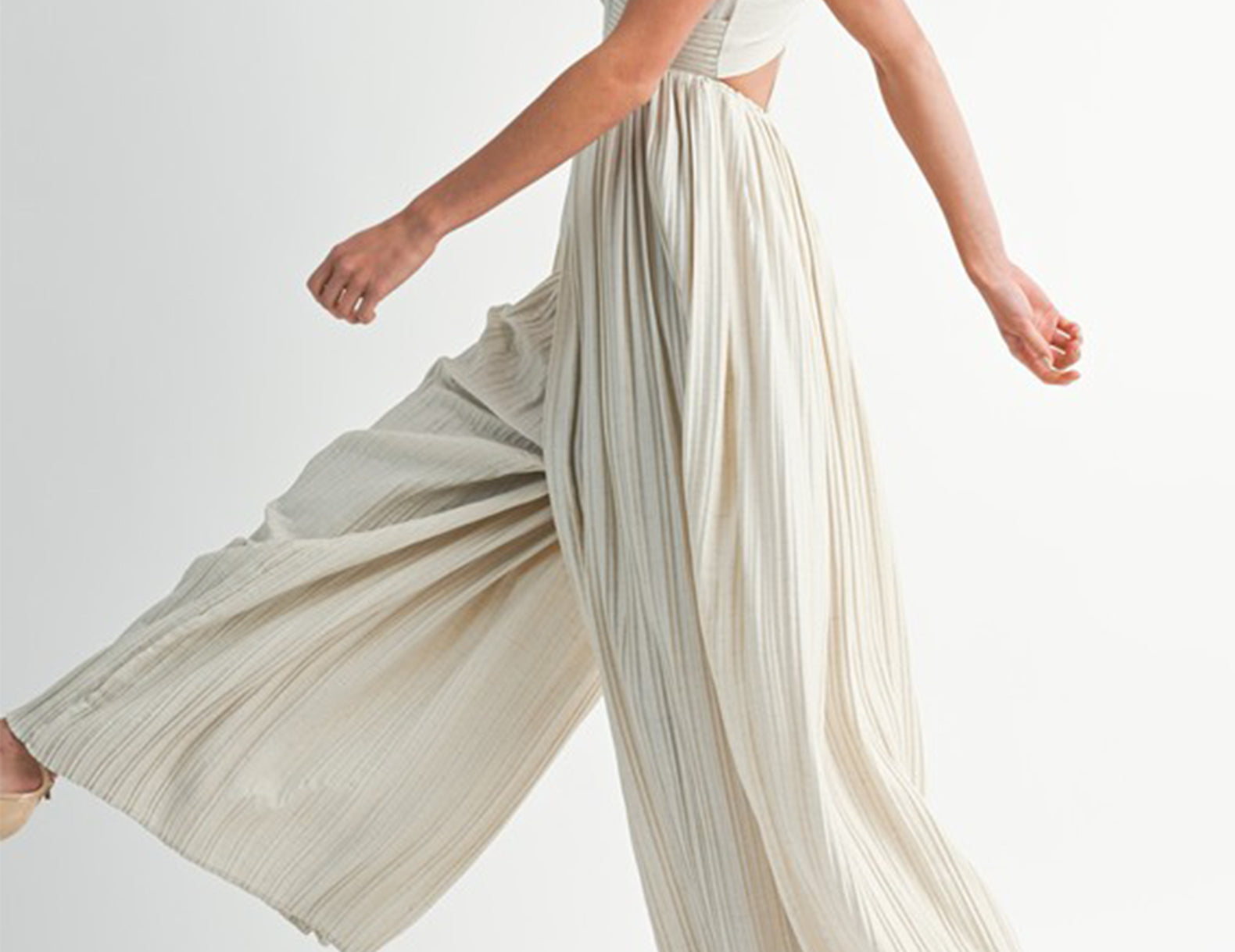 In a textural linen blend fabrication, the Maeve jumpsuit isn't loud, but it makes a statement. Below a triangle-cut bust, beautiful pleating defines the empire waist. Barely-there straps criss and cross at the back, intricately connecting the bottom to the top, and voluminous legs swish like a full, gathered skirt. Choose a bright lip and gold ballet flats for an elevated finish.