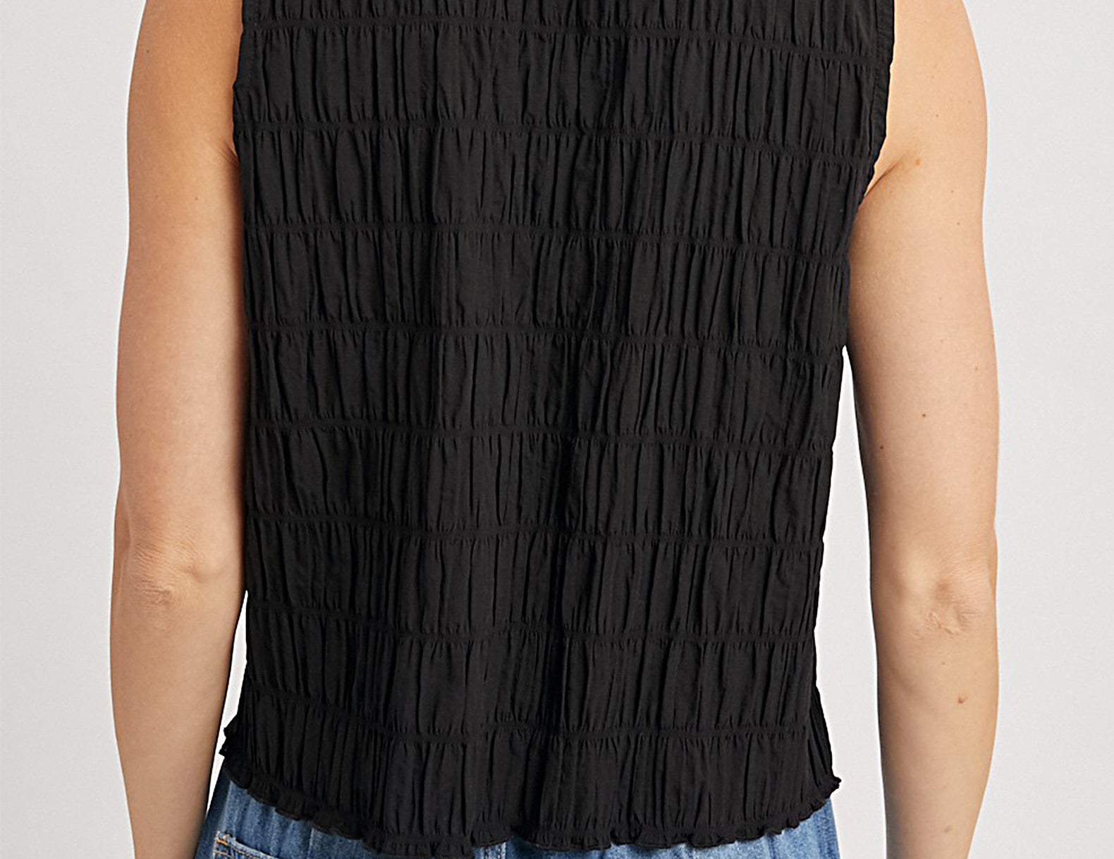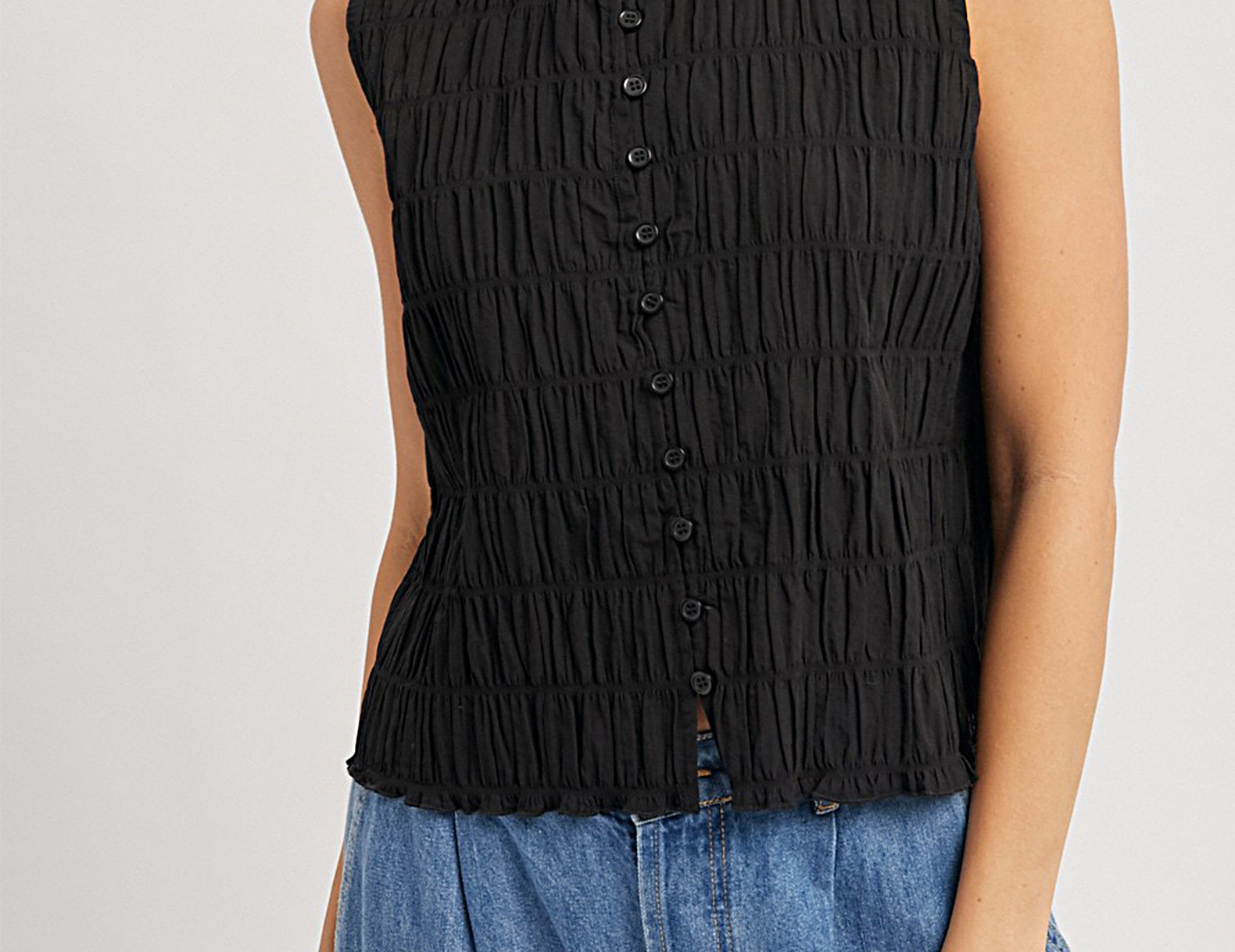 Texture-rich in gathered black cotton, the Mairead sleeveless top has a boxy cut that's relaxed but not too oversized. A high-cut neckline sits above a button-down front, finishing with a hip-length hem. Try this easy-to-style top with linen balloon pants or wide-leg denim.