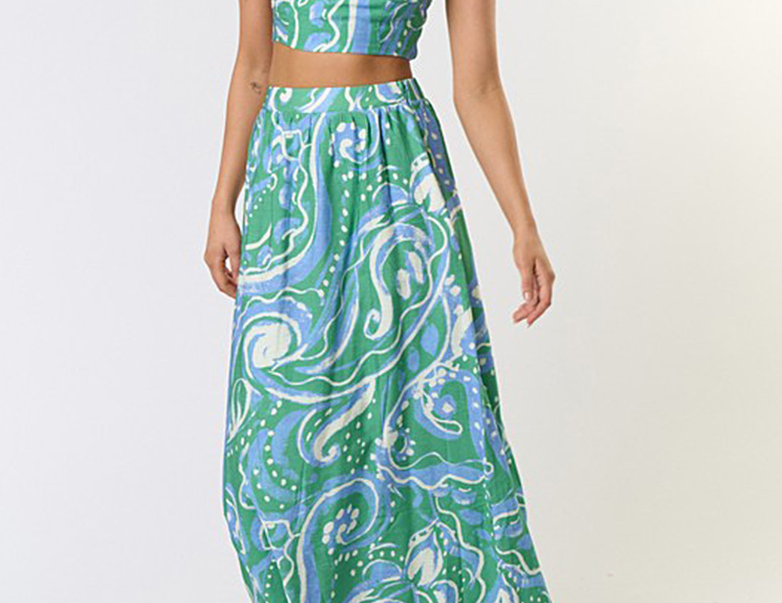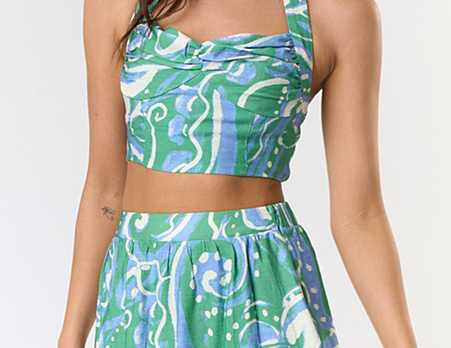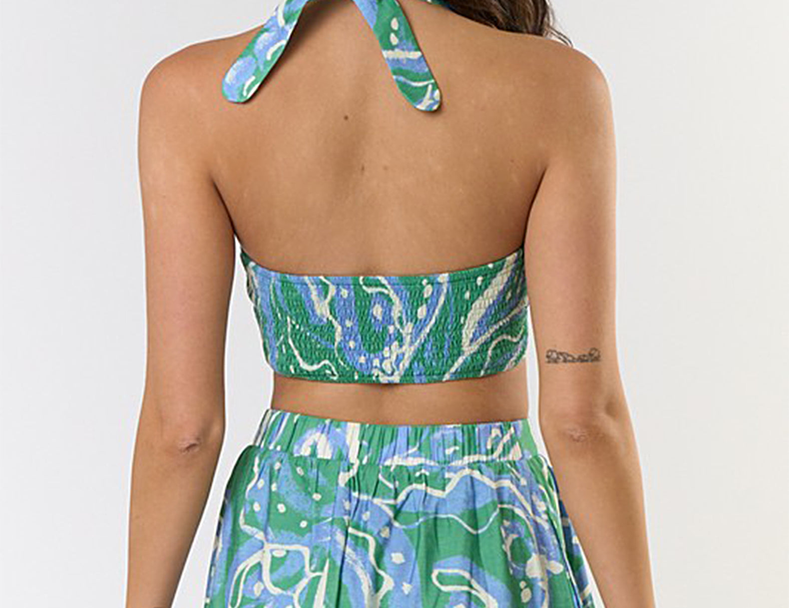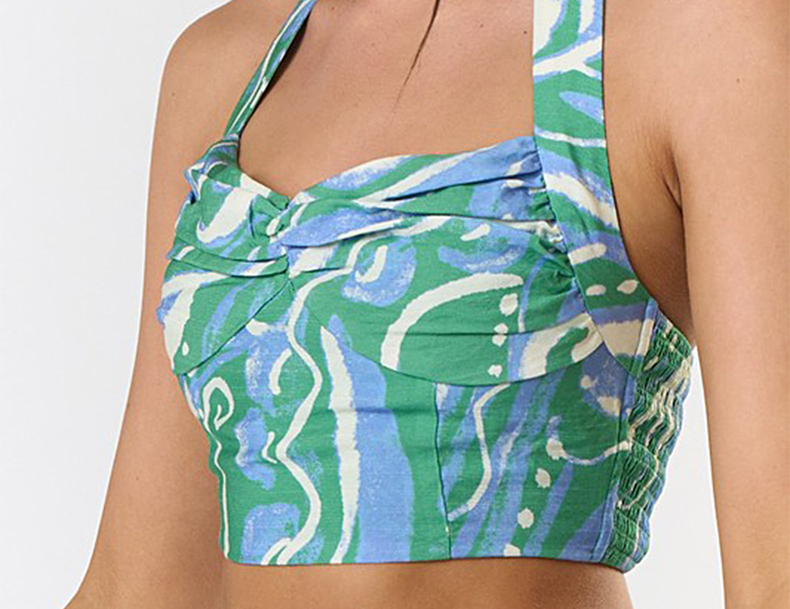 Warm weather ready in a bare-shoulder design, the Majorca flatters in a slim, waist-length silhouette with a ruched + gathered sweetheart neckline and wide halter straps that can be tied to taste. In an artful wave print against an ocean-inspired palette, this halter top is a fresh favorite with shorts and skirts, or add the matching Majorca Wave Print Midi Skirt for a special summer one-and-done.