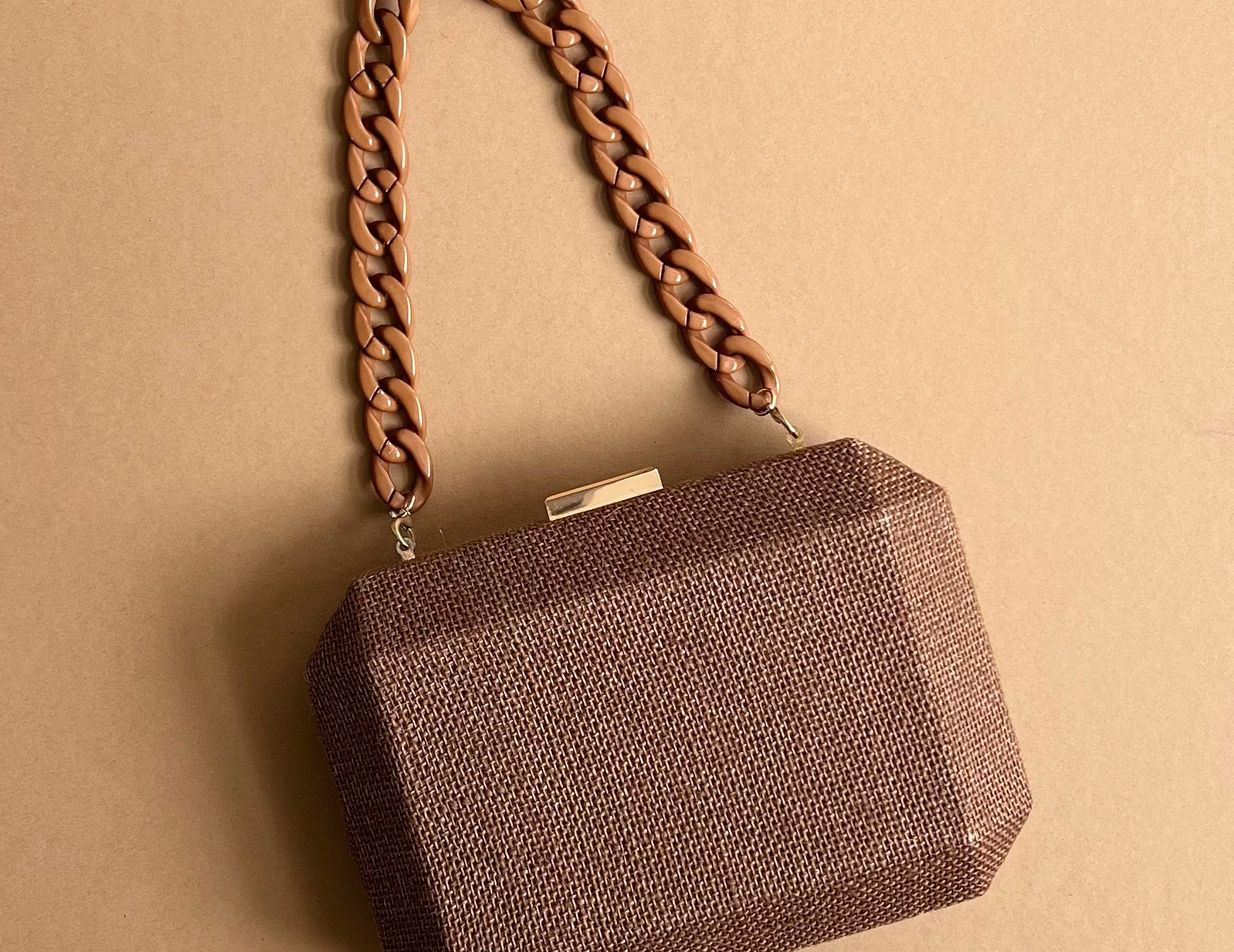 A fresh take on mid-century trends, the Manon purse is crafted in woven linen that wraps a hard-shell case for a structured, geometric finish. This box purse is suspended from a chunky resin chain strap that can be tucked into the interior or seamlessly swapped for a long, gold tone shoulder chain. Perfect for day or night, Manon adds texture and charm to any outfit.