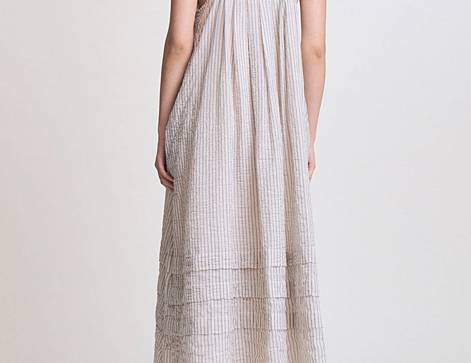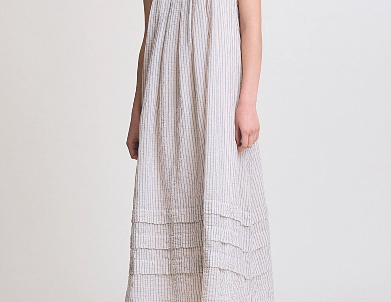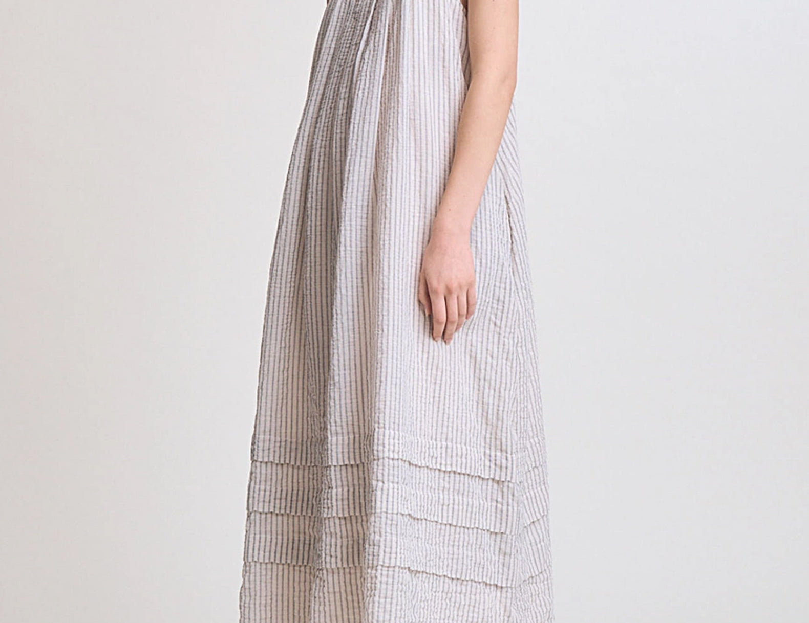 Airy in charcoal-striped ecru cotton seersucker, the Mariposa tent dress hangs loosely from barely-there shoulder straps, draping to a voluminous A-line silhouette. Three wide tuck pleats trim the floor-grazing skirt for a simple yet eye-catching finish. An easy choice for off-duty days or brunch with friends, try this flowy dress paired with a large jute tote and square sunglasses.