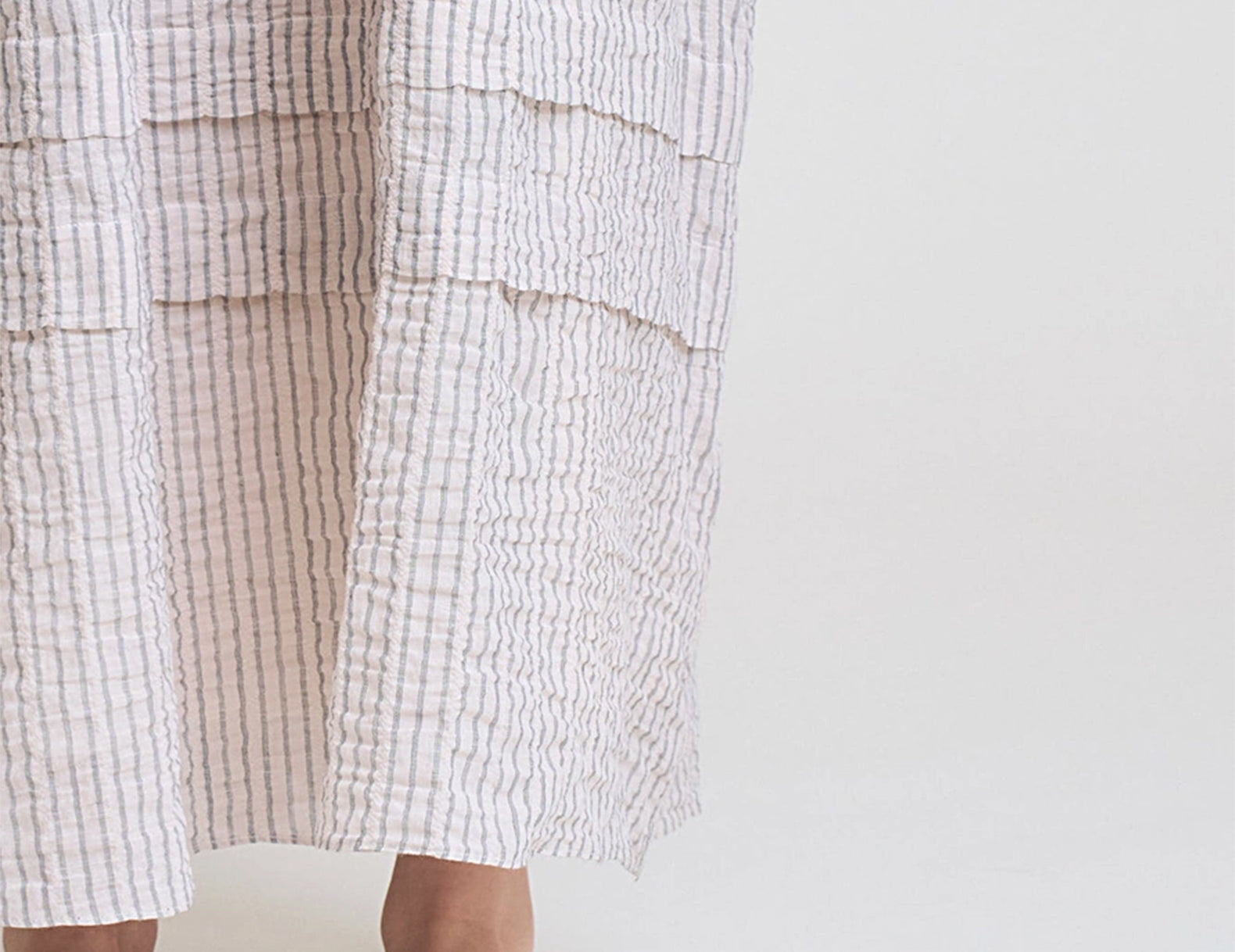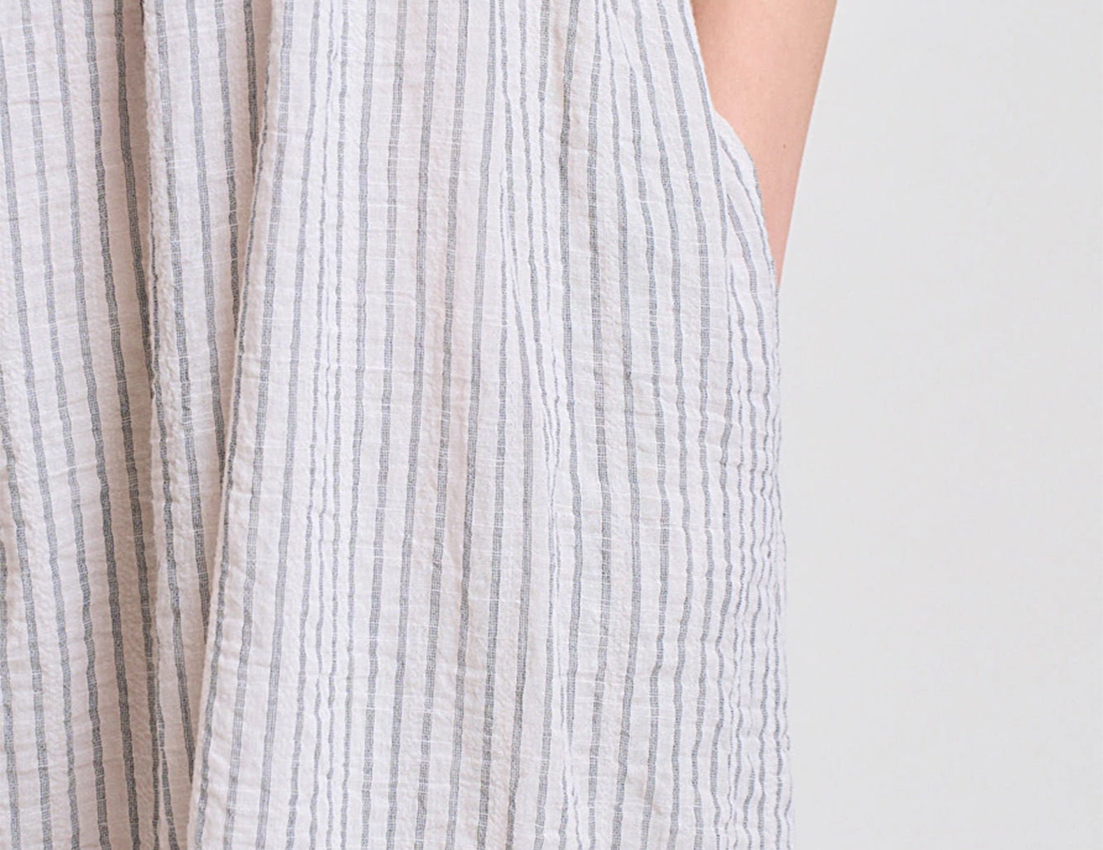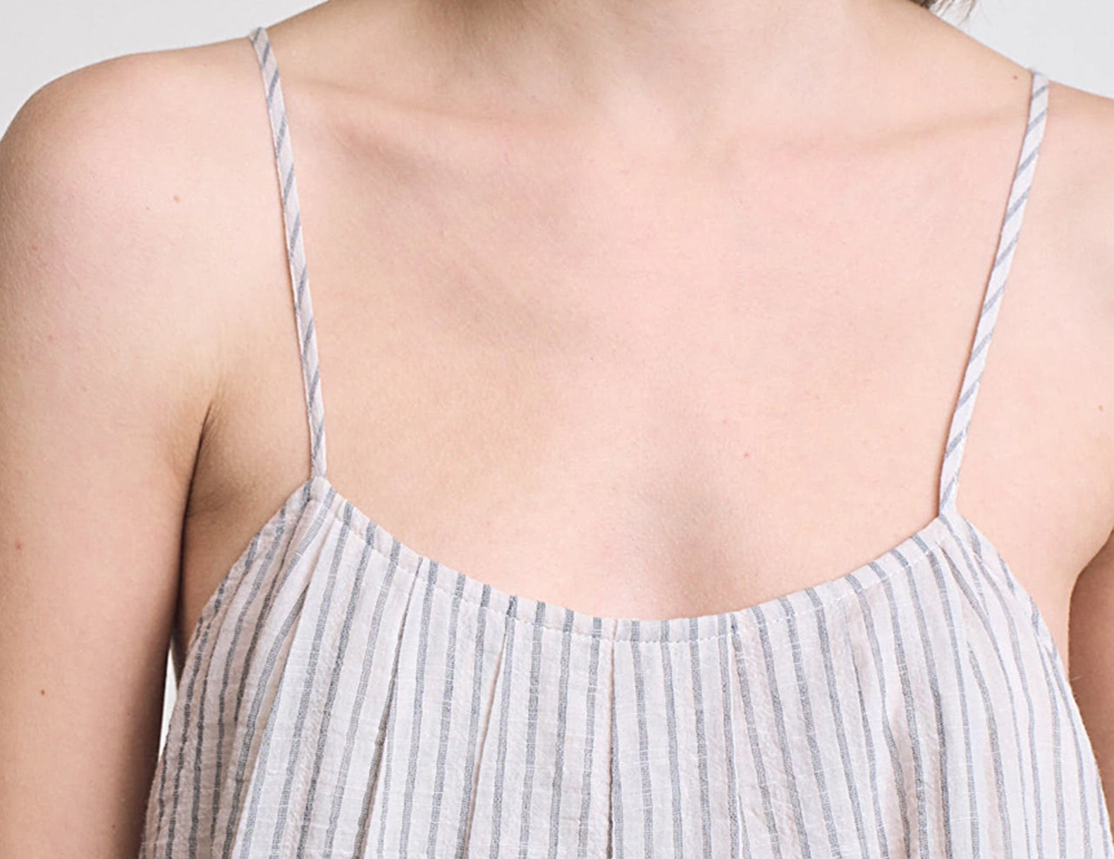 Airy in charcoal-striped ecru cotton seersucker, the Mariposa tent dress hangs loosely from barely-there shoulder straps, draping to a voluminous A-line silhouette. Three wide tuck pleats trim the floor-grazing skirt for a simple yet eye-catching finish. An easy choice for off-duty days or brunch with friends, try this flowy dress paired with a large jute tote and square sunglasses.
