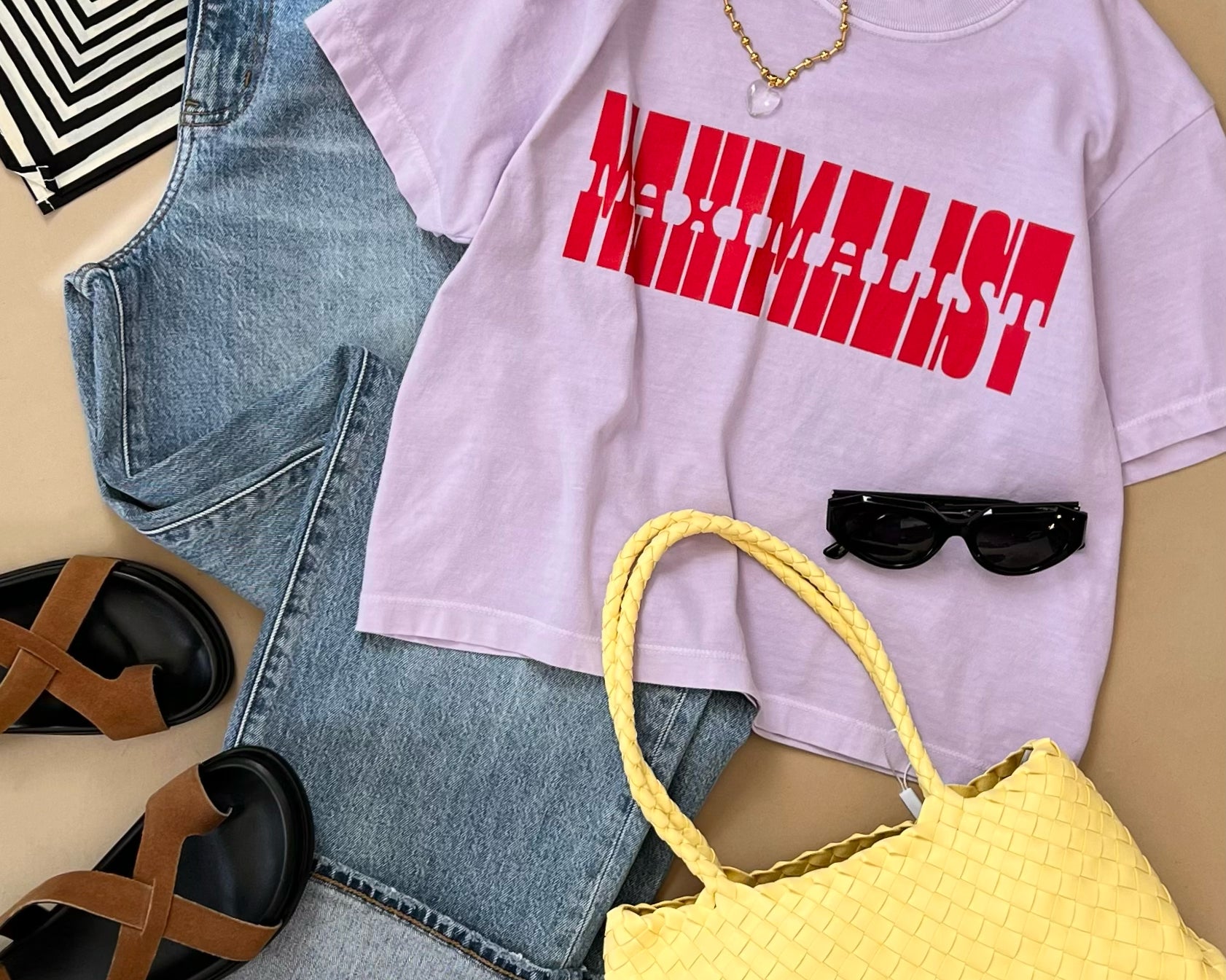 In a bold print that matches the maximalist style, this tee is made from soft, ring-spun cotton in a boxy + cropped silhouette with dropped shoulders. With statement red lettering against pale lilac, and pre-softened for a lived-in feel, finish this relaxed tee with shorts and sneakers or a printed maxi, oversized sunnies and colorful heels!