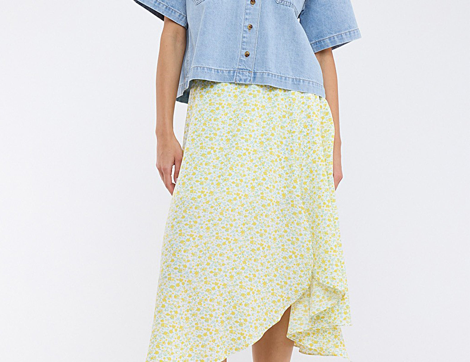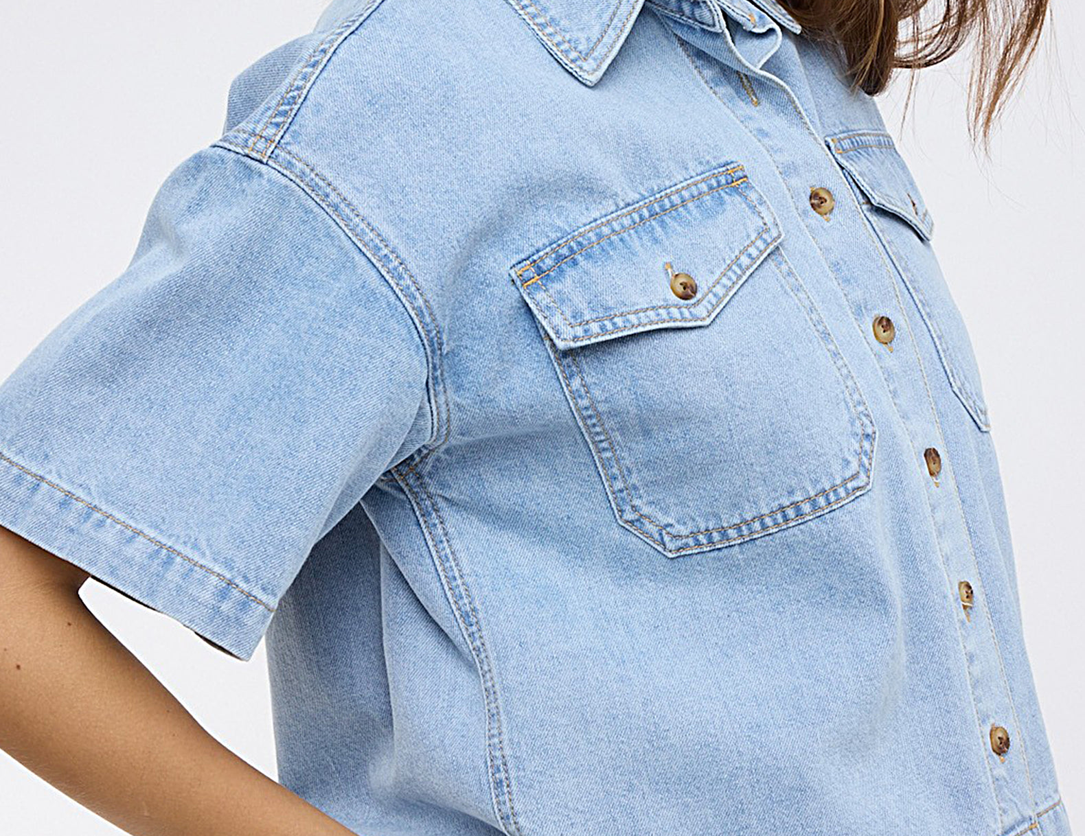 Done in a medium blue wash, the Maxine denim button-up is cut to an oversized, hip-length silhouette with short, elbow-grazing sleeves and oversized chest pockets. Small, tortoise buttons secure the front and pocket flaps. Structured yet easy, try Maxine buttoned over linen trousers, or wear it open over a vintage tee as a lightweight layer.