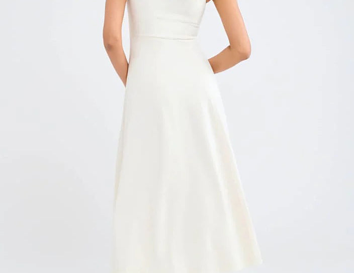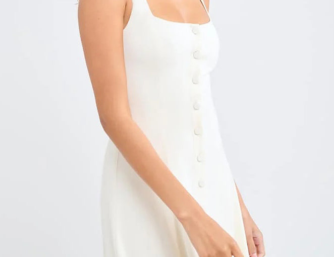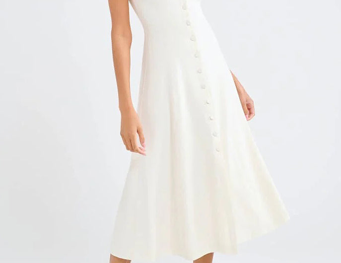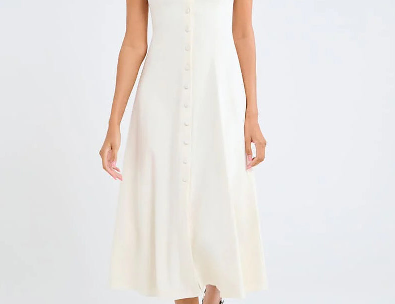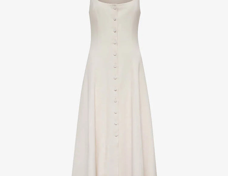 Tasteful and timeless in a smooth, body-skimming silhouette, the Mayfair midi is defined by a covered button placket from the plunging, squared neckline to the full hemline. Structured and weighted in a soft stretch weave in ivory white, this summer-ready midi seamlessly shifts aesthetics with a dressy heel, chunky slides, or boot.