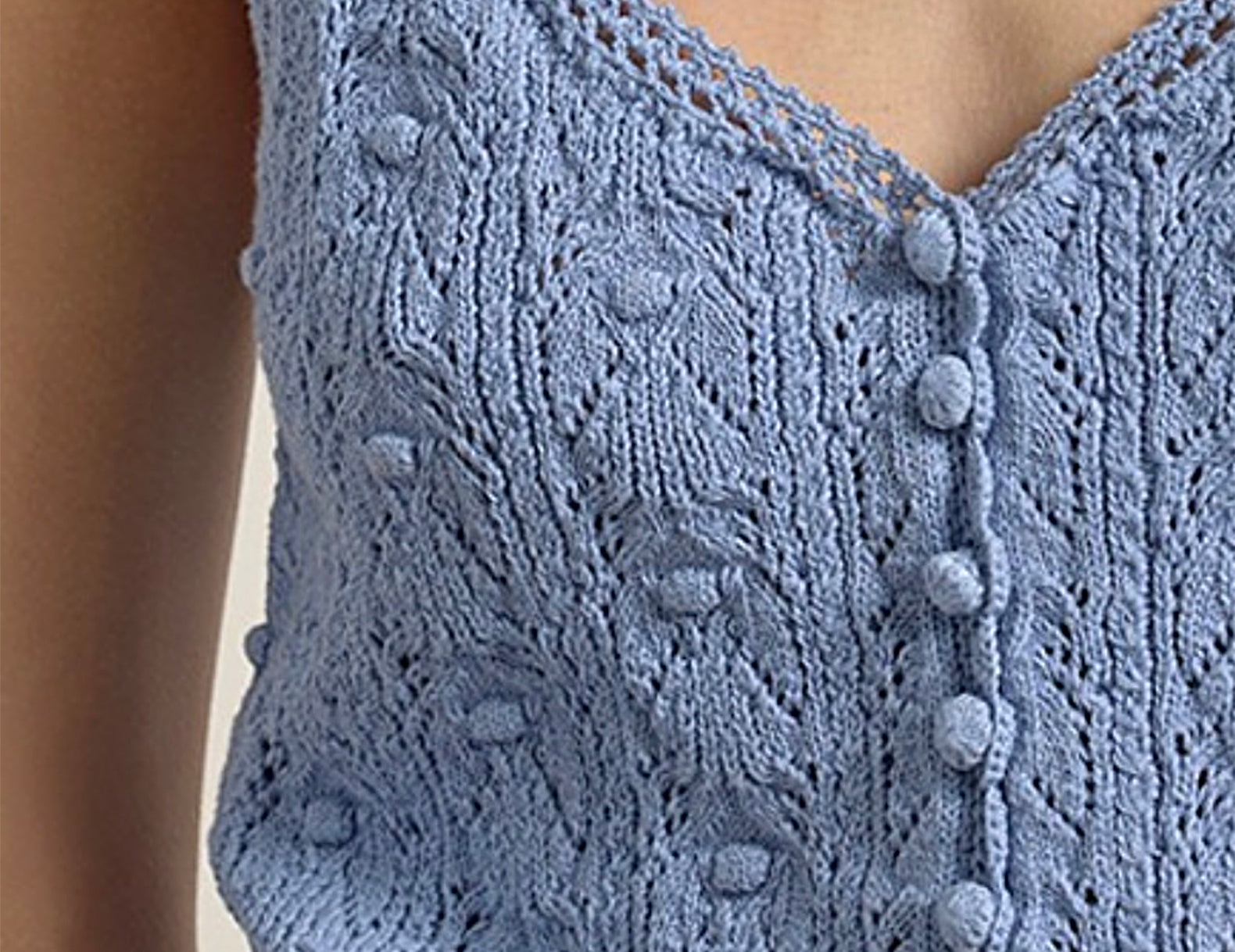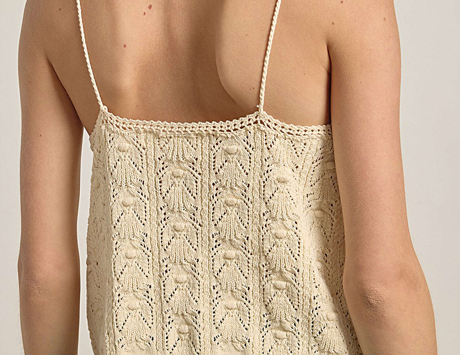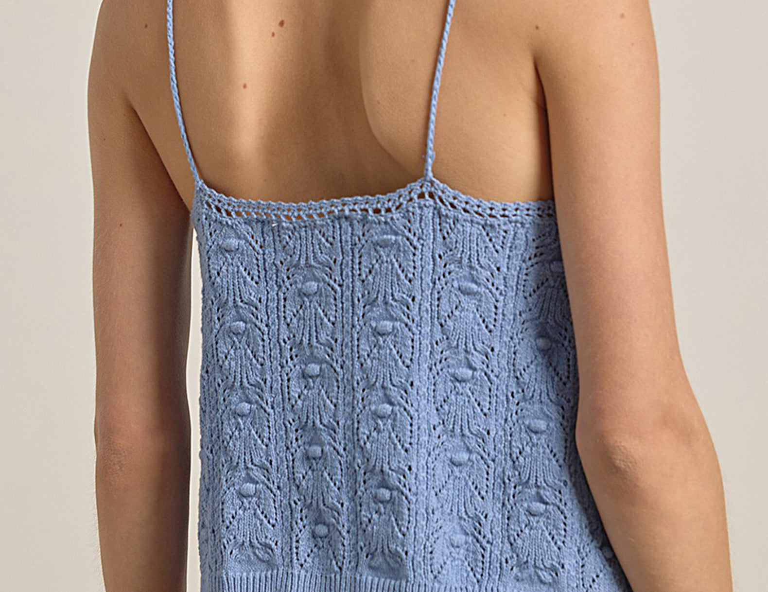 Mayren is all charm in a crochet bauble knit. We love the barely there straps, scallop and button detailing at the front, and the eyelet peekaboos. Choose from cornflower blue or warm ecru and wear it solo over relaxed denim, or try it layered over a baby tee with pleated trousers.