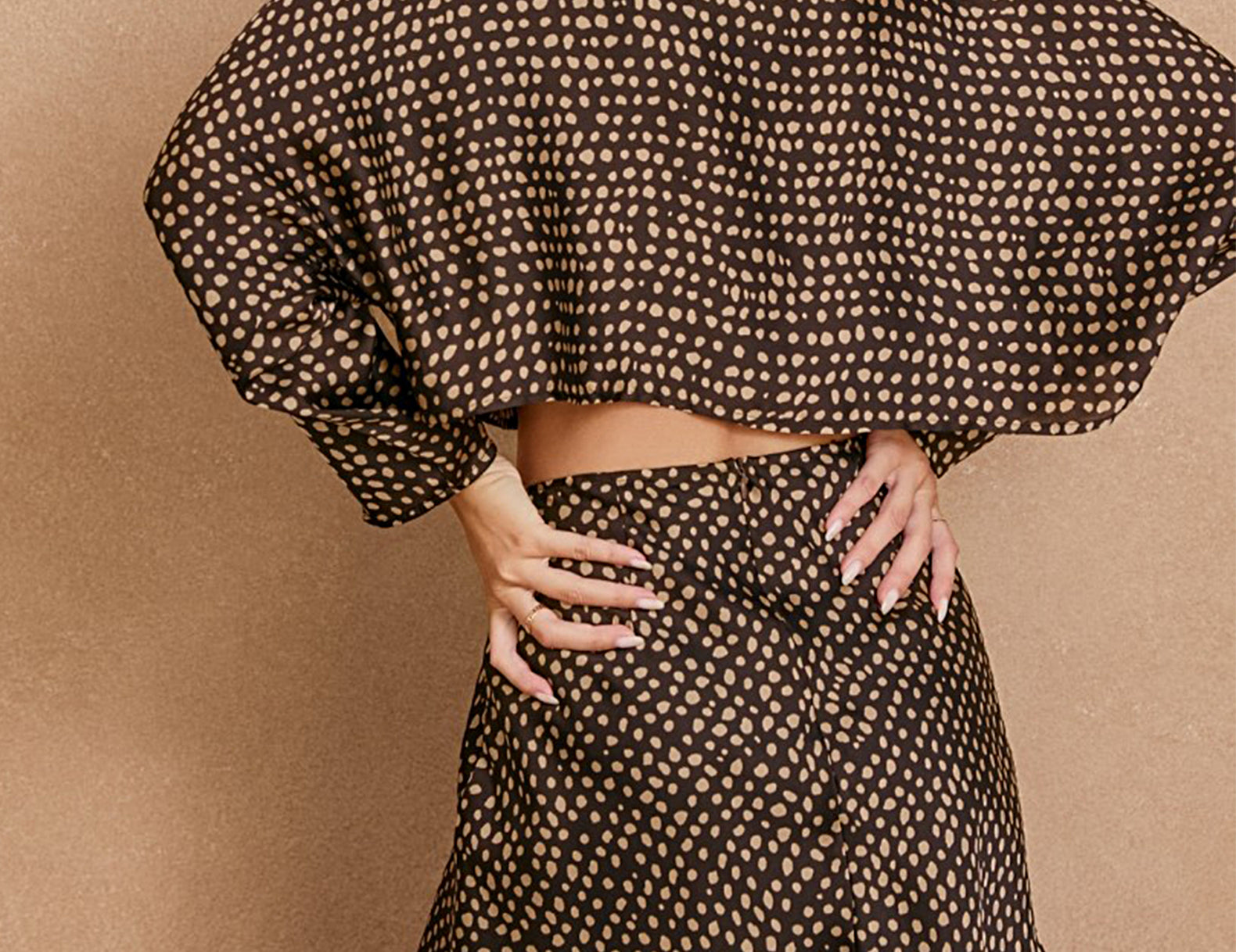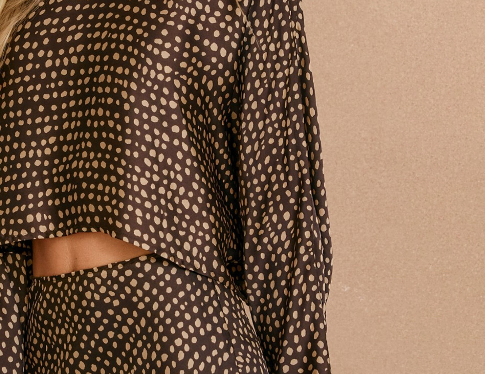 Speckled with an artful print in warm ecru and deep chocolate, this fluid stain top is an easy way to elevate your favorite denim or wide-leg trousers. It's cut wide with long, dolman sleeves and a boatneck, and cropped to hit at the natural waist. Comfy yet elevated, it's an easy choice for work or play.