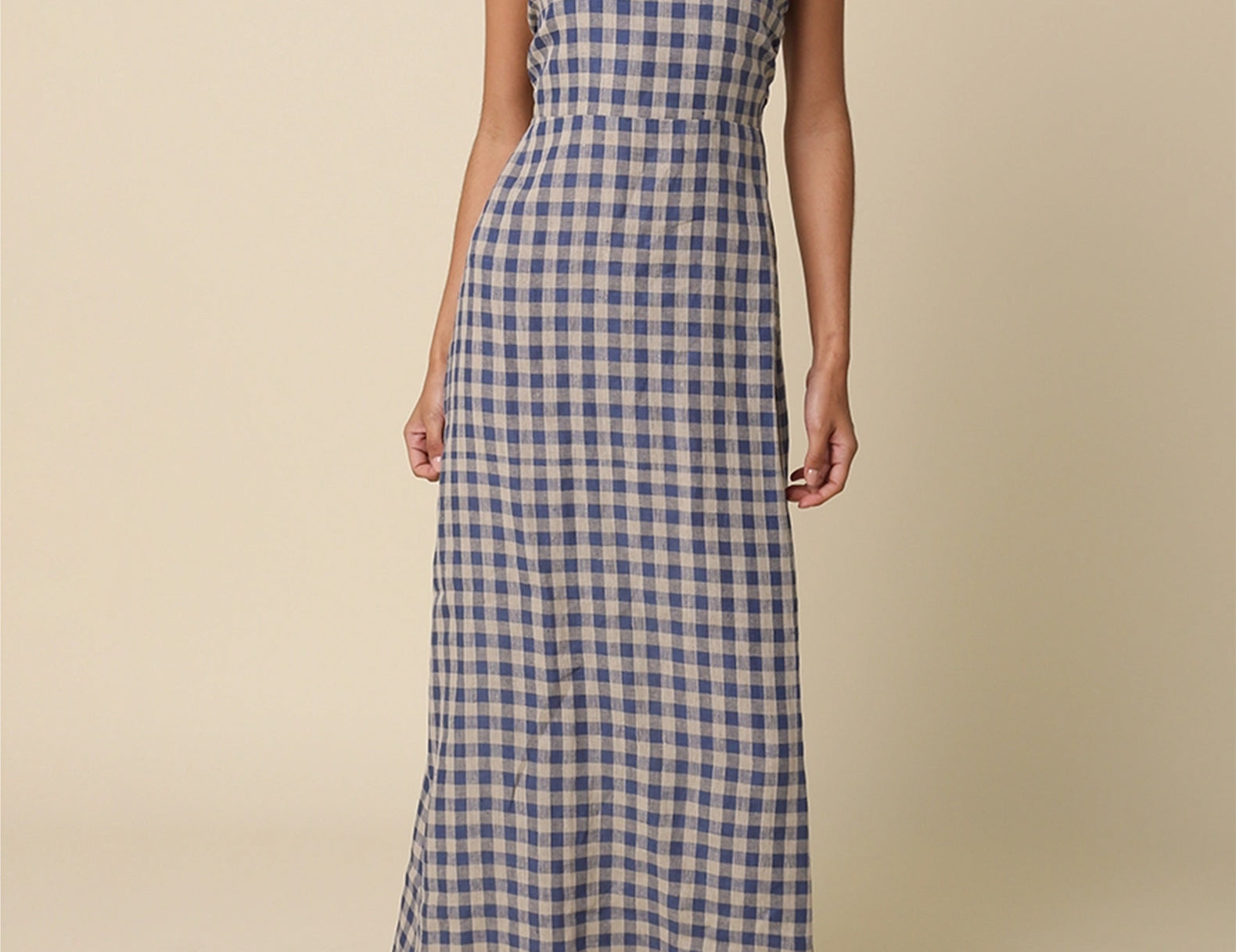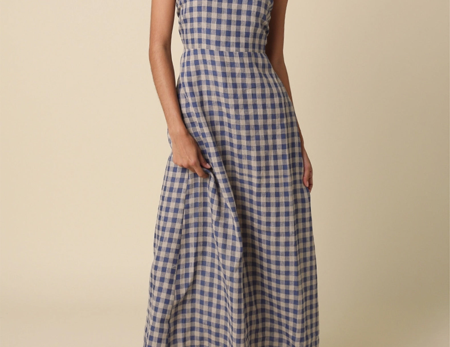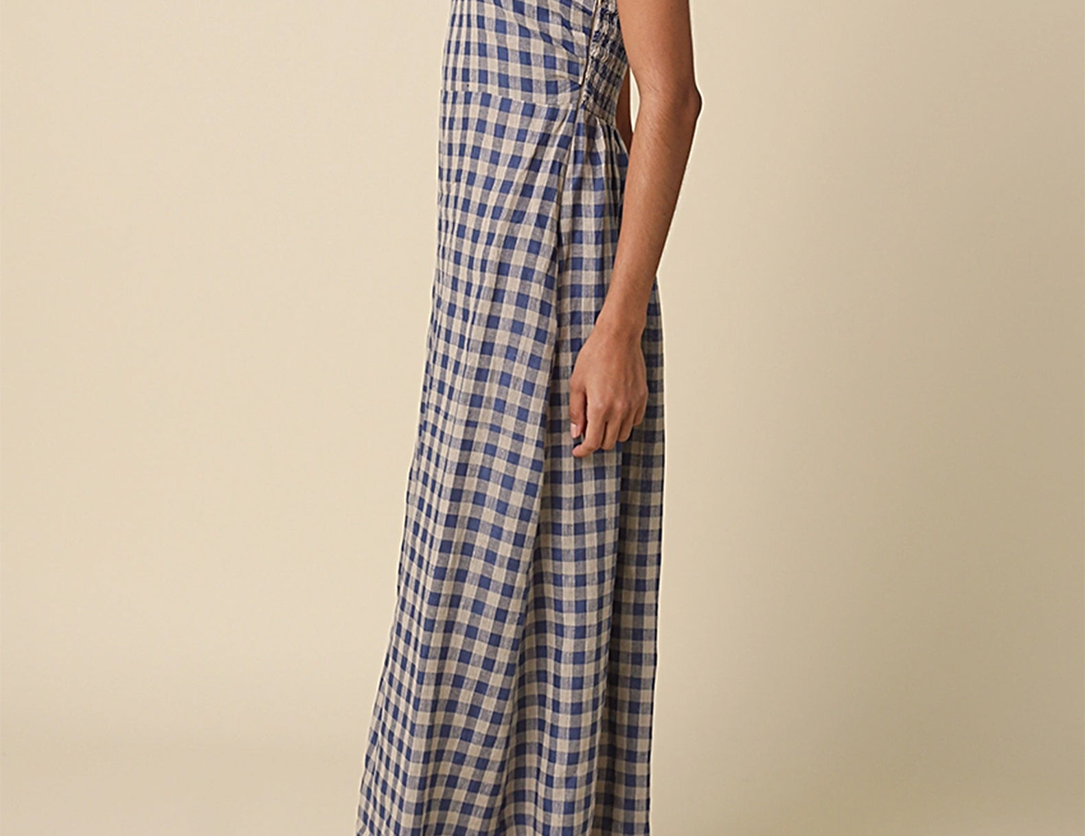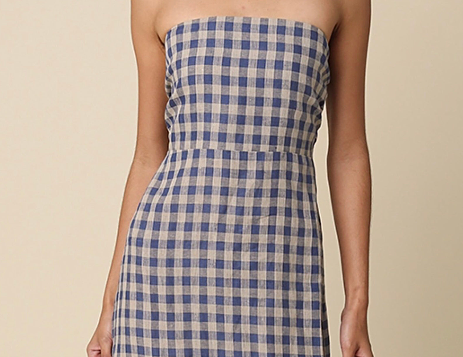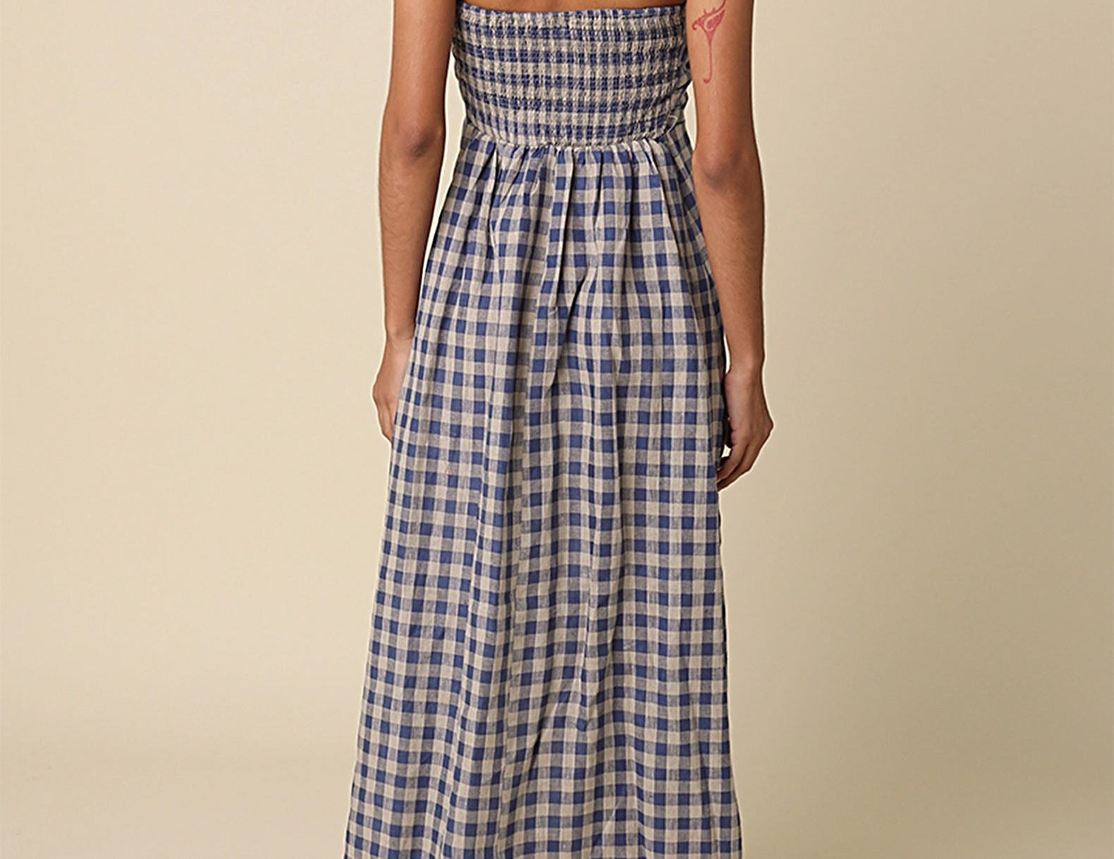 Mollie is done in an airy, blue + taupe gingham-print linen and cut to a clean, longline silhouette. The bodice is fitted and strapless with a ruched, stretch-infused back to perfect the fit. The ankle-skimming skirt is smooth across the front, gathered at the back waist, and flares to a gentle A-line shape.
