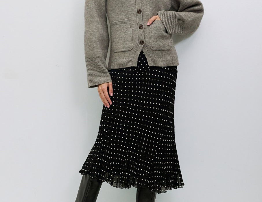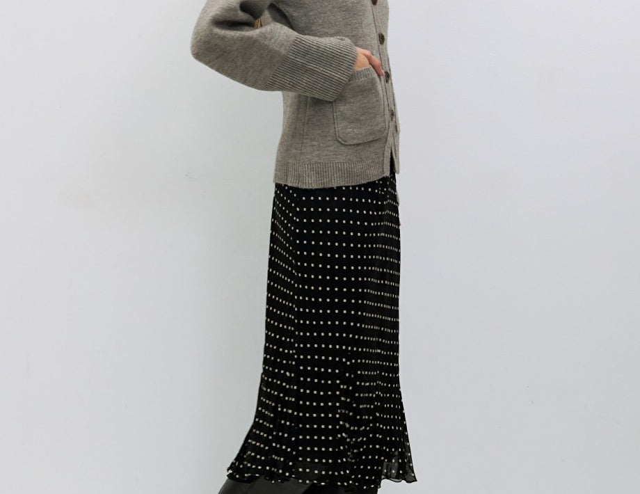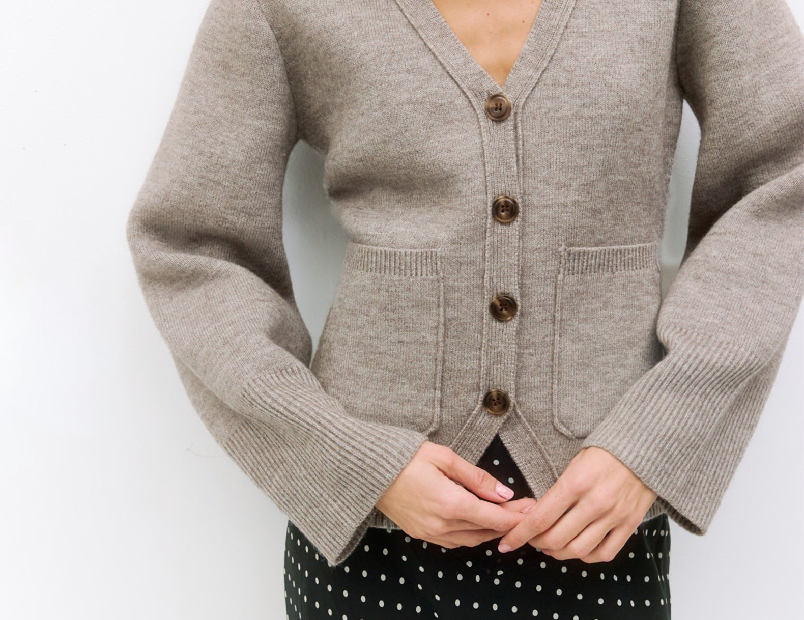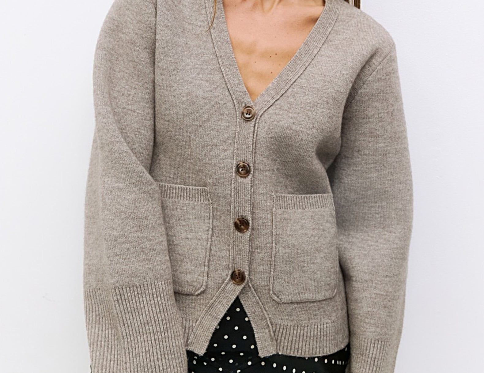 A modern sweater shape with yearround potential, the Mona is warming in a slim, hip-grazing fit with wide sleeves, punctuated at the cuffs with thick ribbing. Soft, weighted, and finished with double patch pockets, tortoiseshell buttons, and raised edges - this heather gray cardigan is a versatile staple with dresses, denim, or a pencil skirt.