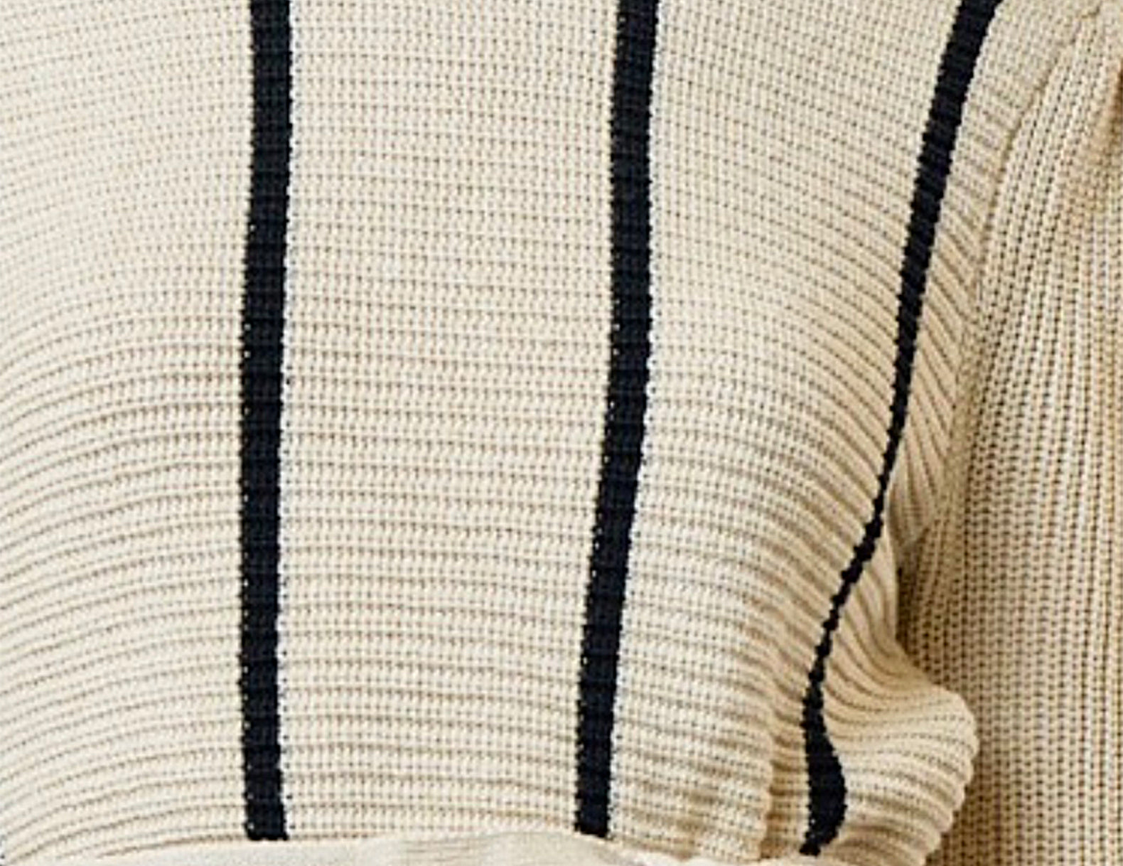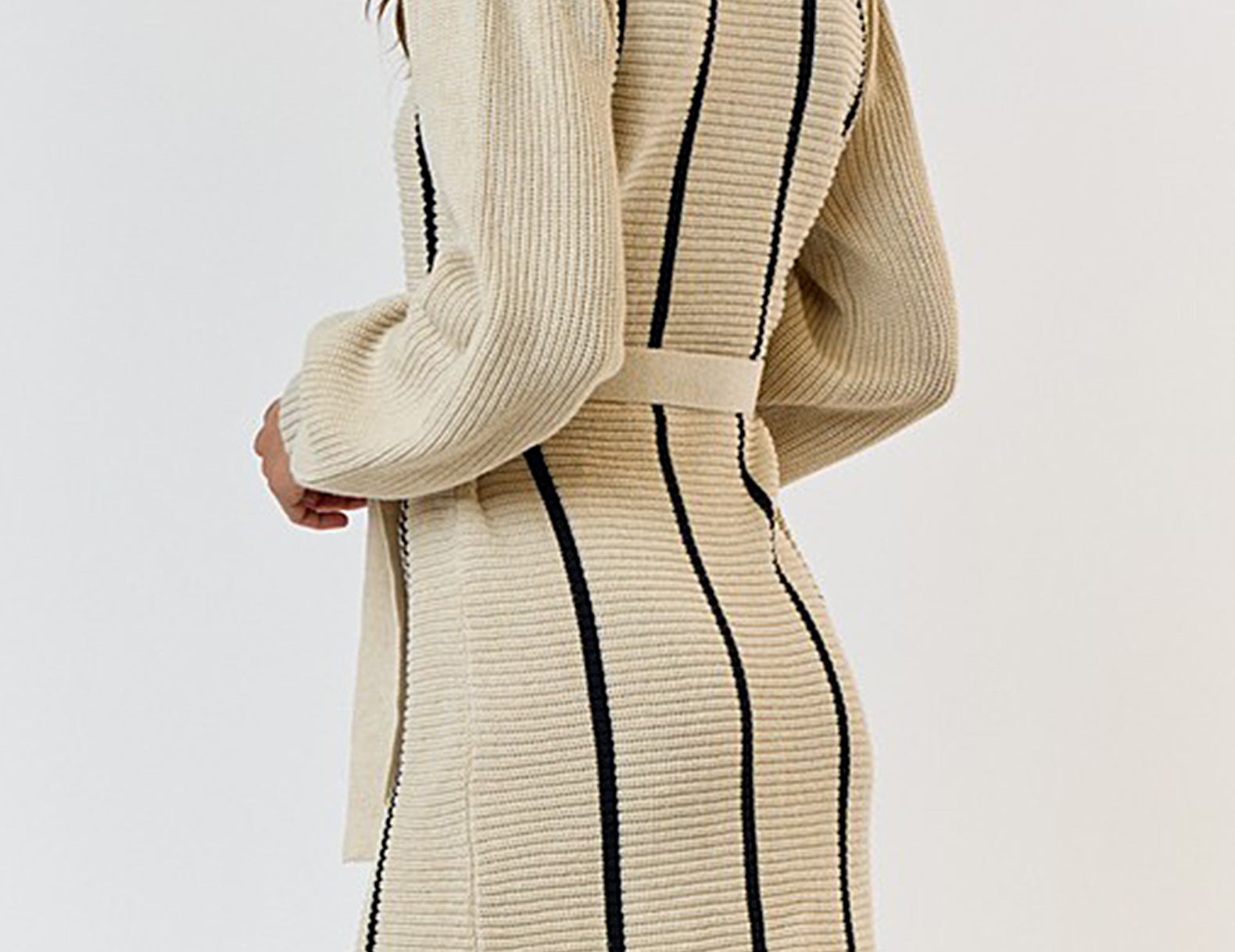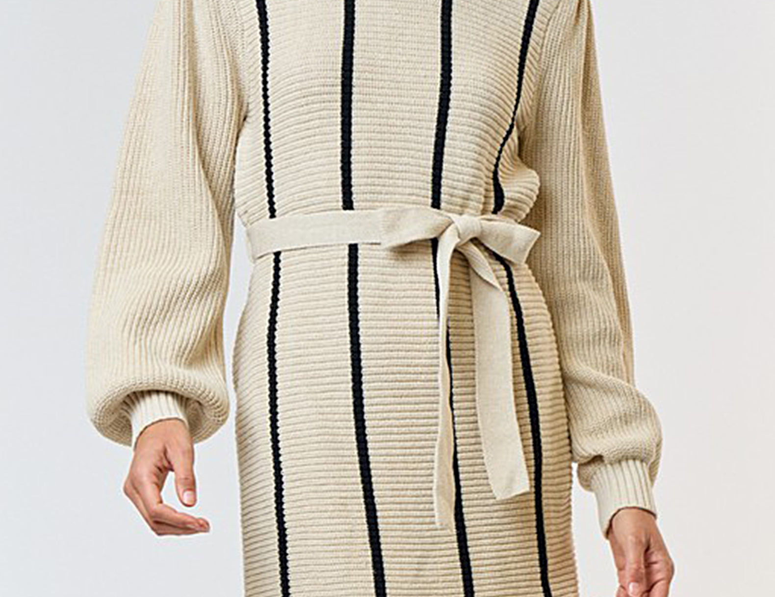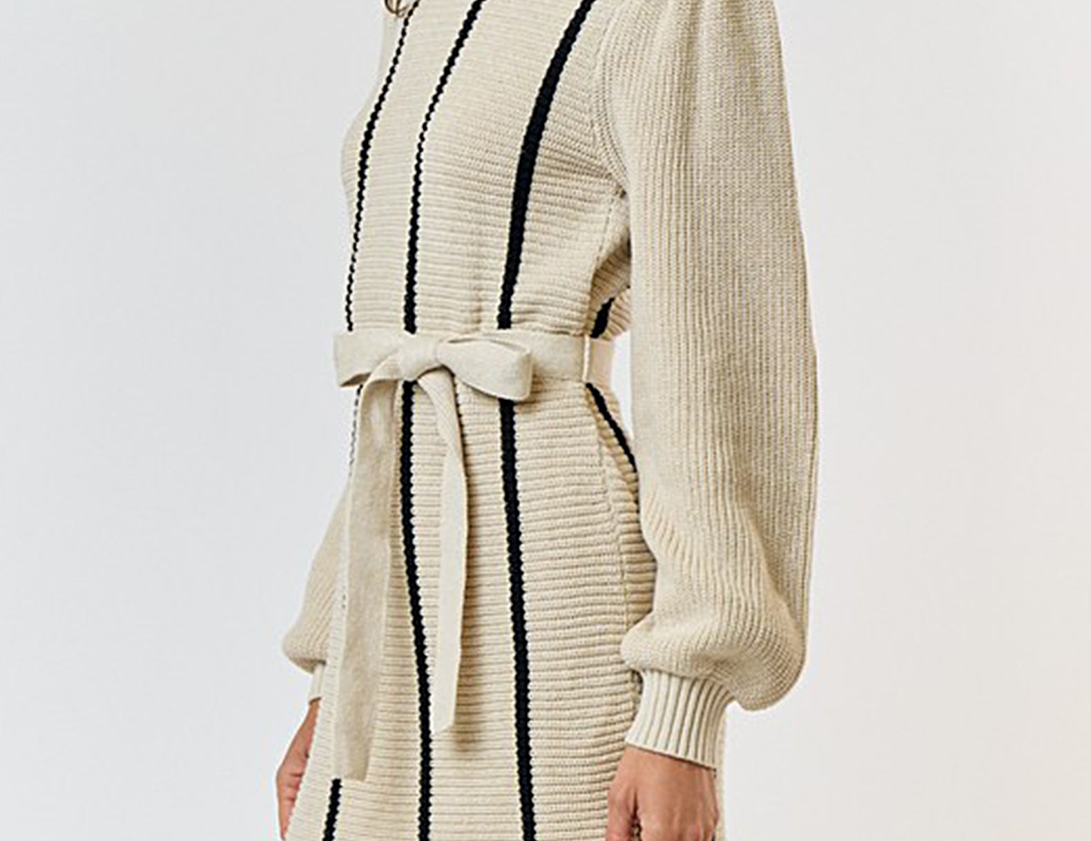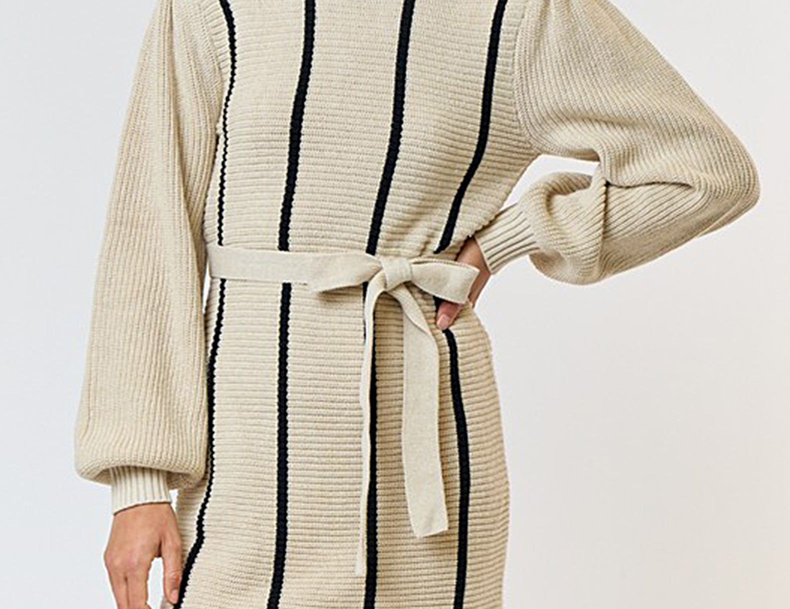 Tasteful and detail-oriented against a heavily textured knit, this short sweater dress features a relaxed shape, exaggerated bishop sleeves and a matching knit tie for an adjustable fit. Artfully finished in vertical stripes against a weighted almond knit, wear the Mona dress with knee boots or chunky platforms this season.