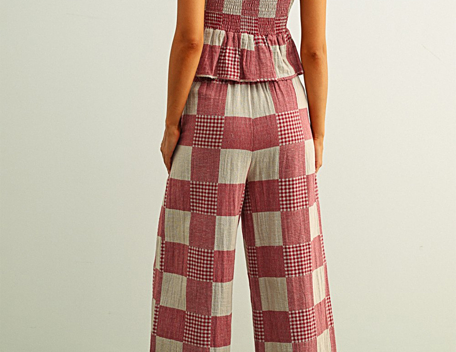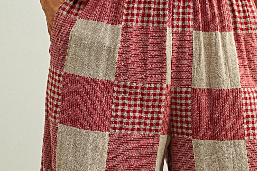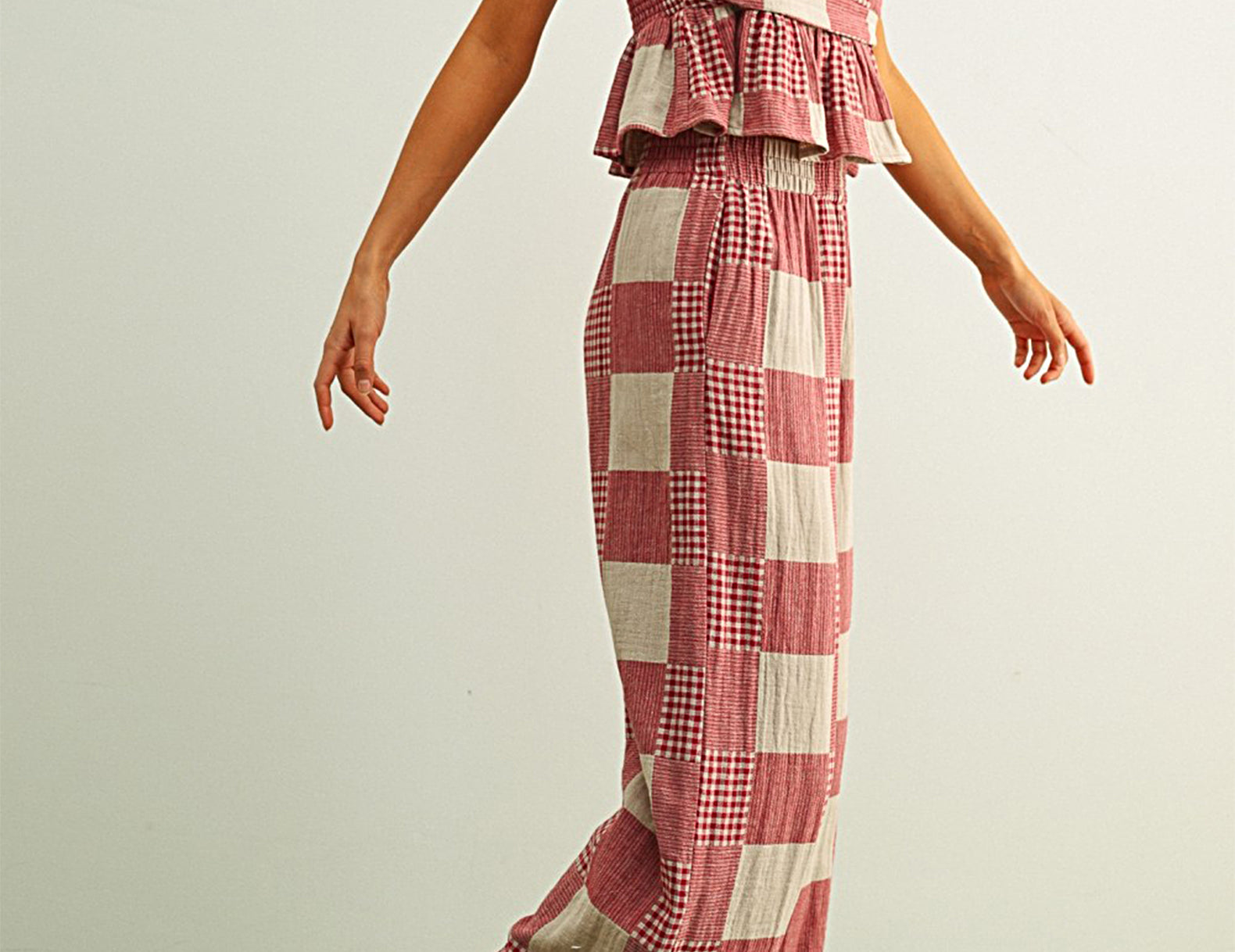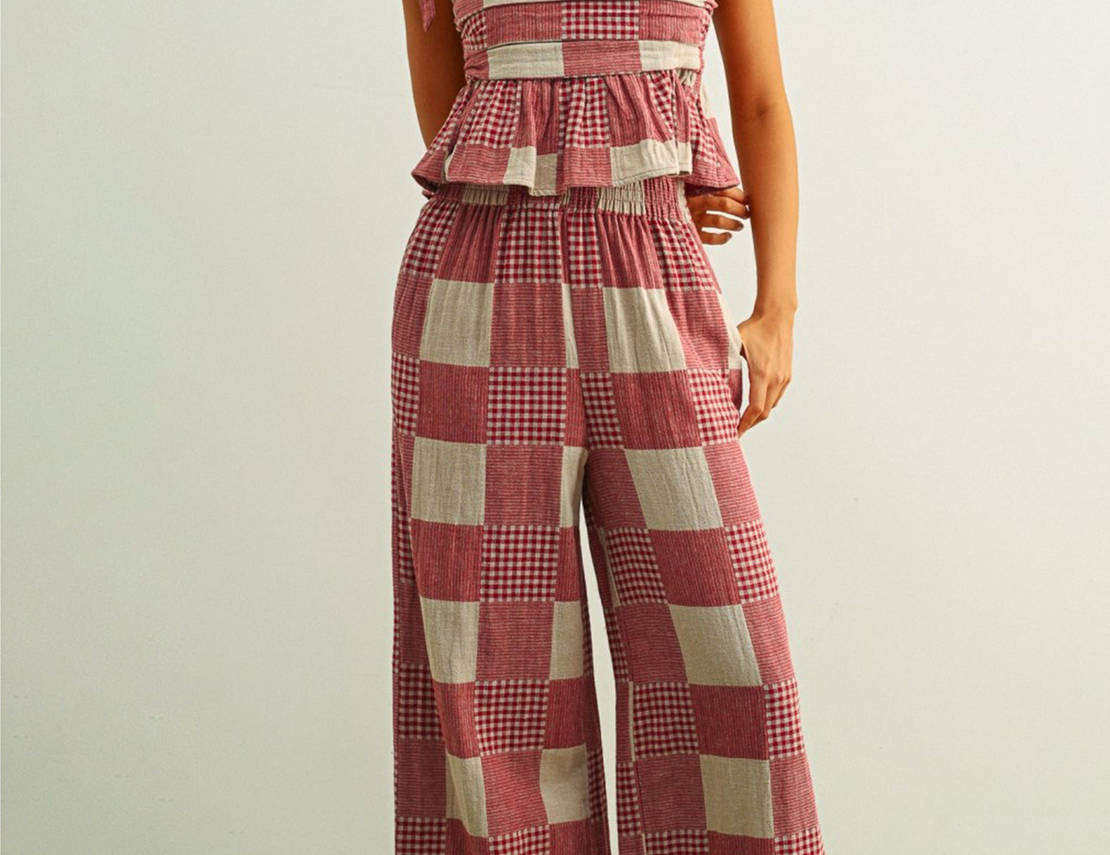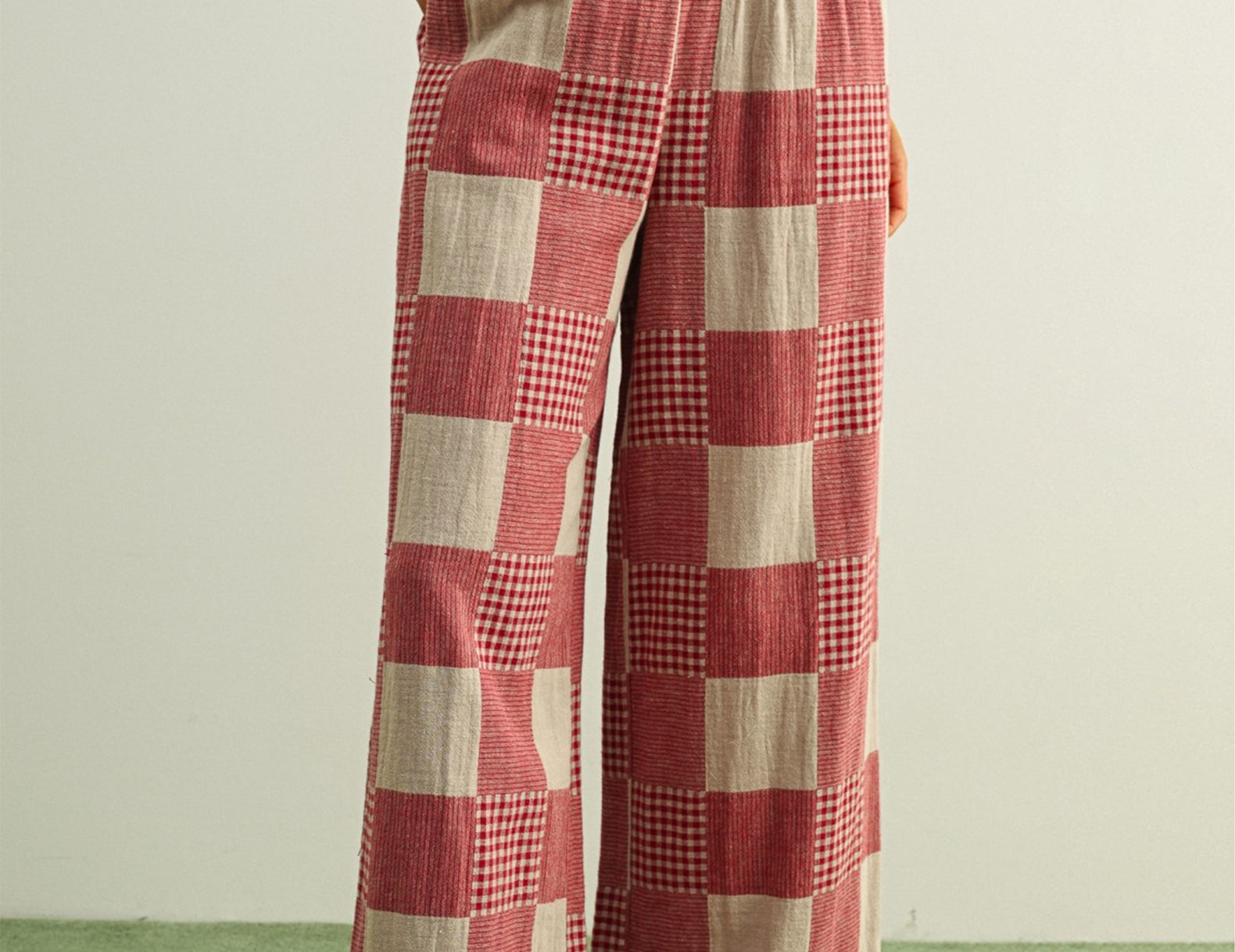 The Morgan pants are cut wide and long from a bold, checker-print plaid in brick red and soft taupe. They sit high on the waist with a wide, elasticated waistband and are finished with side pockets.