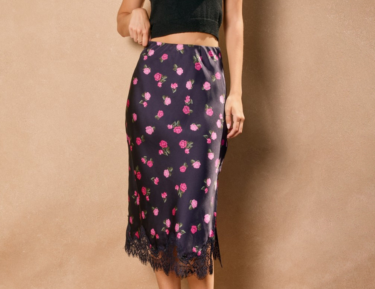 Luxurious silken satin in a vintage slip silhouette, the Noémie skirt is cut on the bias for a flattering, curve-hugging fit against a classic pencil silhouette. This romantic skirt is printed with pretty pink florals against a deep fig purple background, and the hemline is trimmed with scalloped eyelash lace. Try this romantic skirt with pointed heels and a bustier top, or tall leather boots and a fuzzy, slouchy sweater for a texture-rich finish.