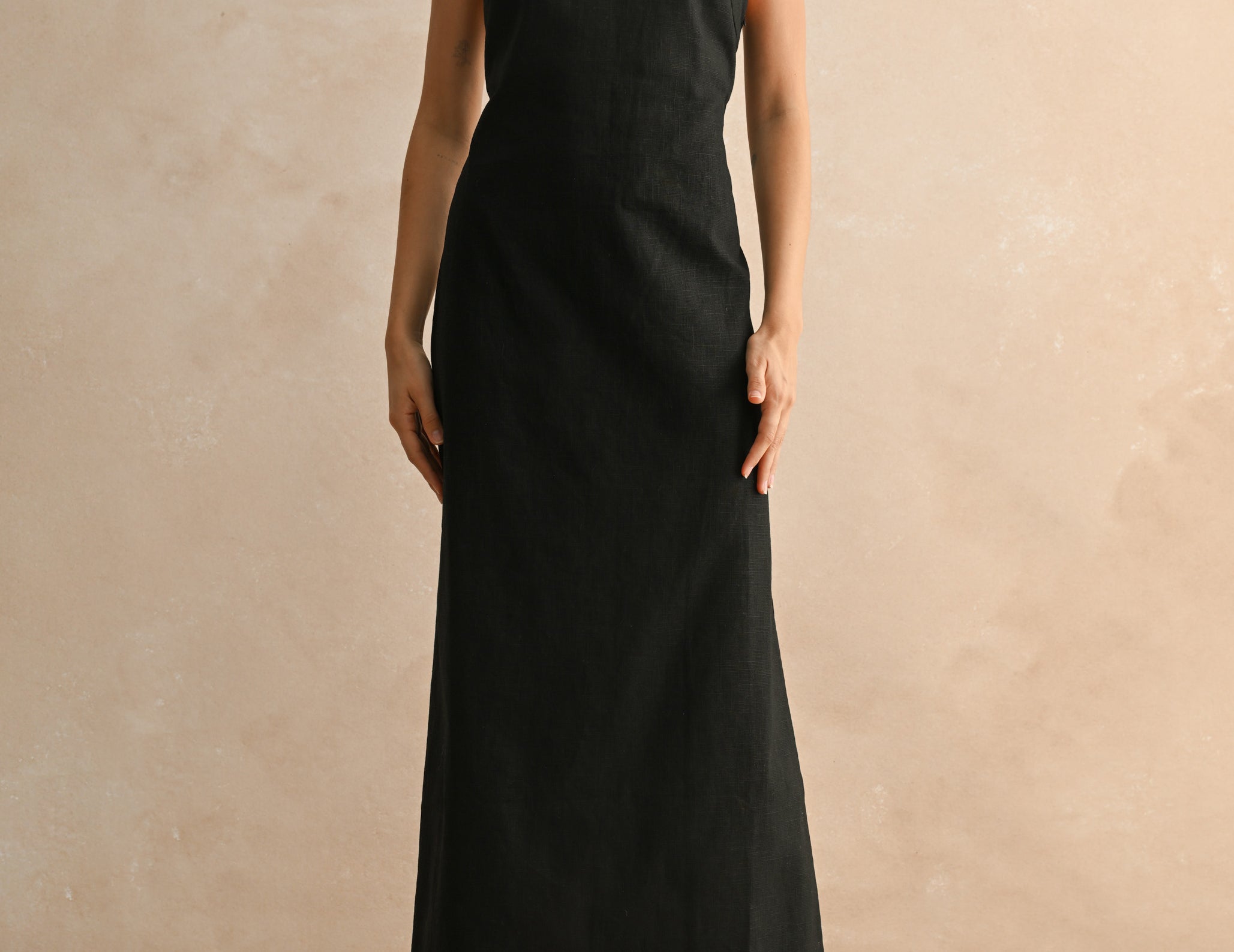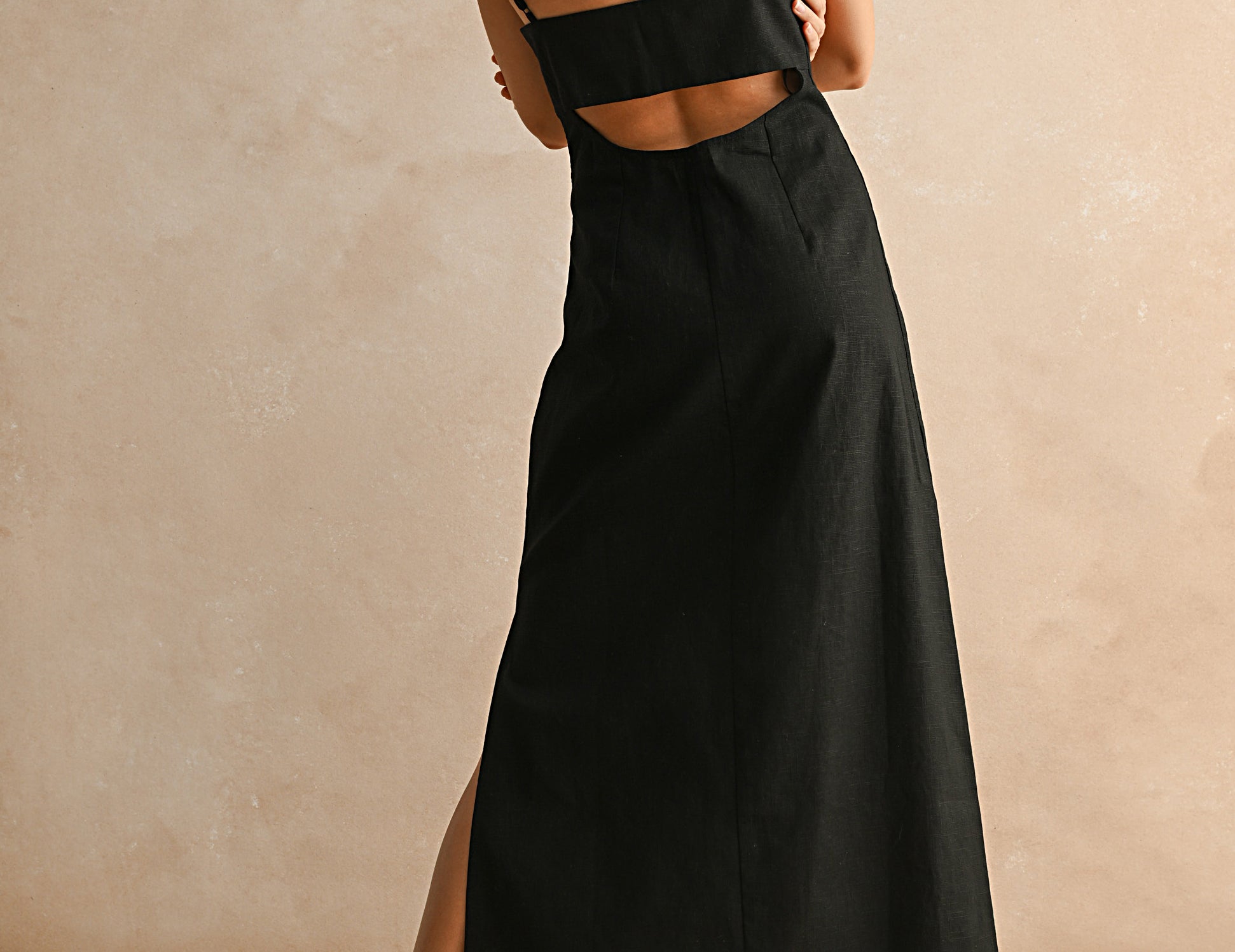Modern and minimal, this classically cool maxi dress features a relaxed A-line silhouette with a half-moon cut-out at the back. Structured in a woven linen and cotton blend in true black, with a side cut slit and slim shoulder straps, the Orla is the perfect blank canvas for your favorite accessories, or keep it simple with flats, dark sunglasses, and a tan.