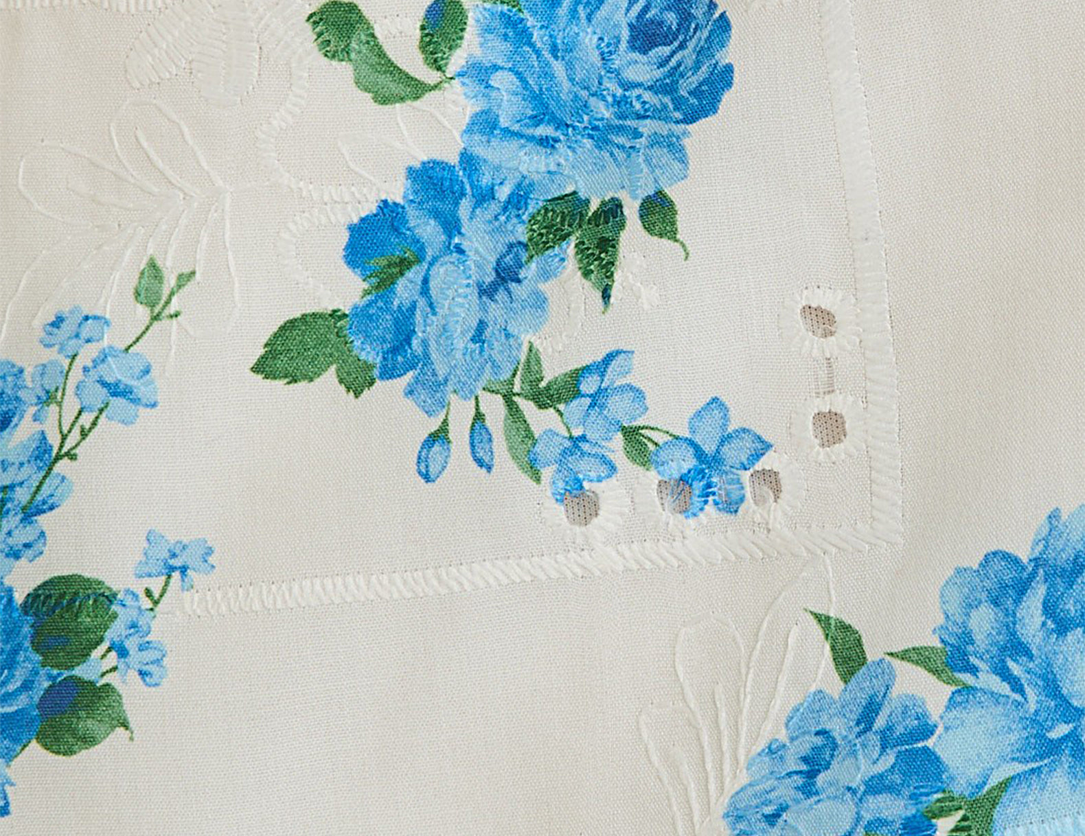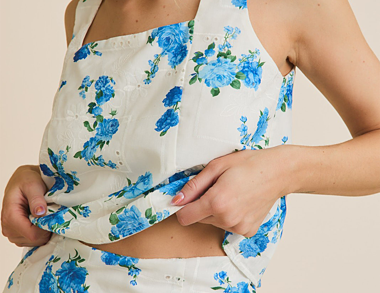 In nostalgic blue florals against embroidered eyelets, the Pensacola tank is cut to a boxy, cropped shape with a squared neckline that’s mirrored on the back. Breezy in a relaxed fit and beautifully textured with the tonal embroidery, this top becomes a casual one-and-done with the matching Pensacola Blue Floral Mini Skirt.