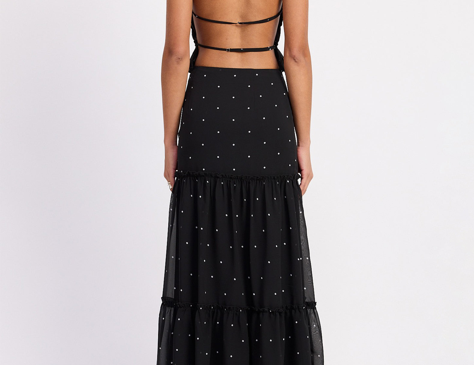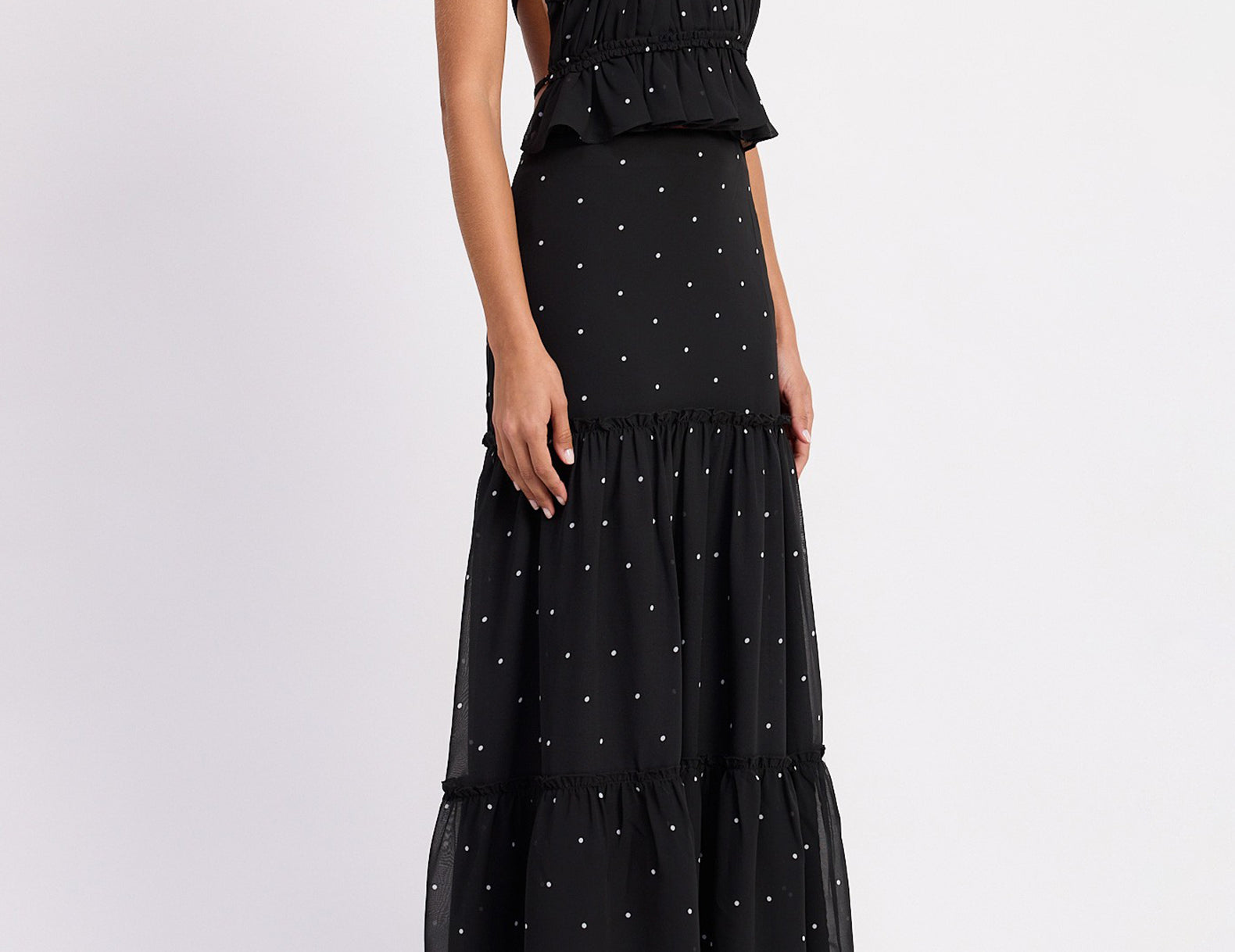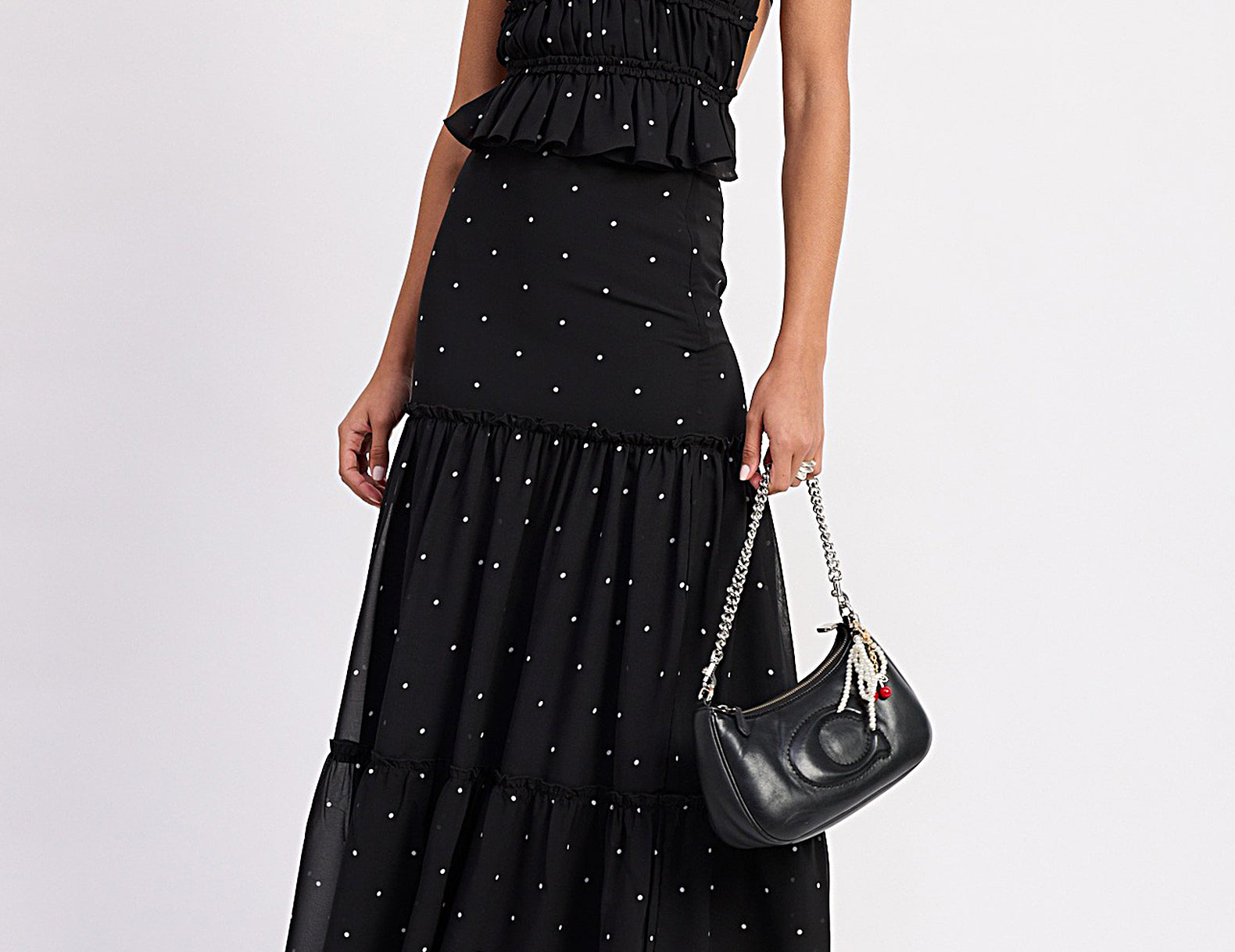 Overlaid in a black + white polka dot chiffon, the Rita is eye-catching in an elevated halter silhouette with gathered detailing at the front and a strappy backless finish. Ruched throughout with a ruffled hemline and fully lined beneath the chiffon, this dressy top becomes a statement set with the matching Rita Ruffled Drop Waist Polka Dot Skirt.