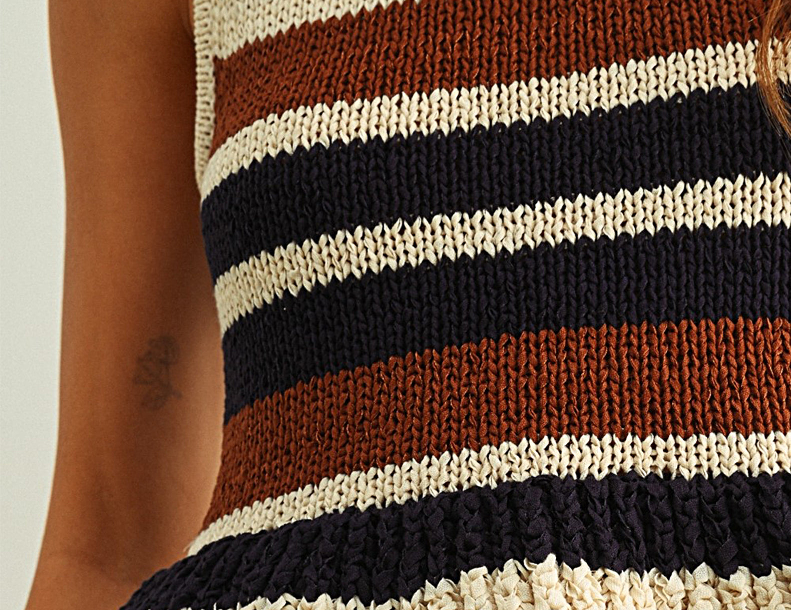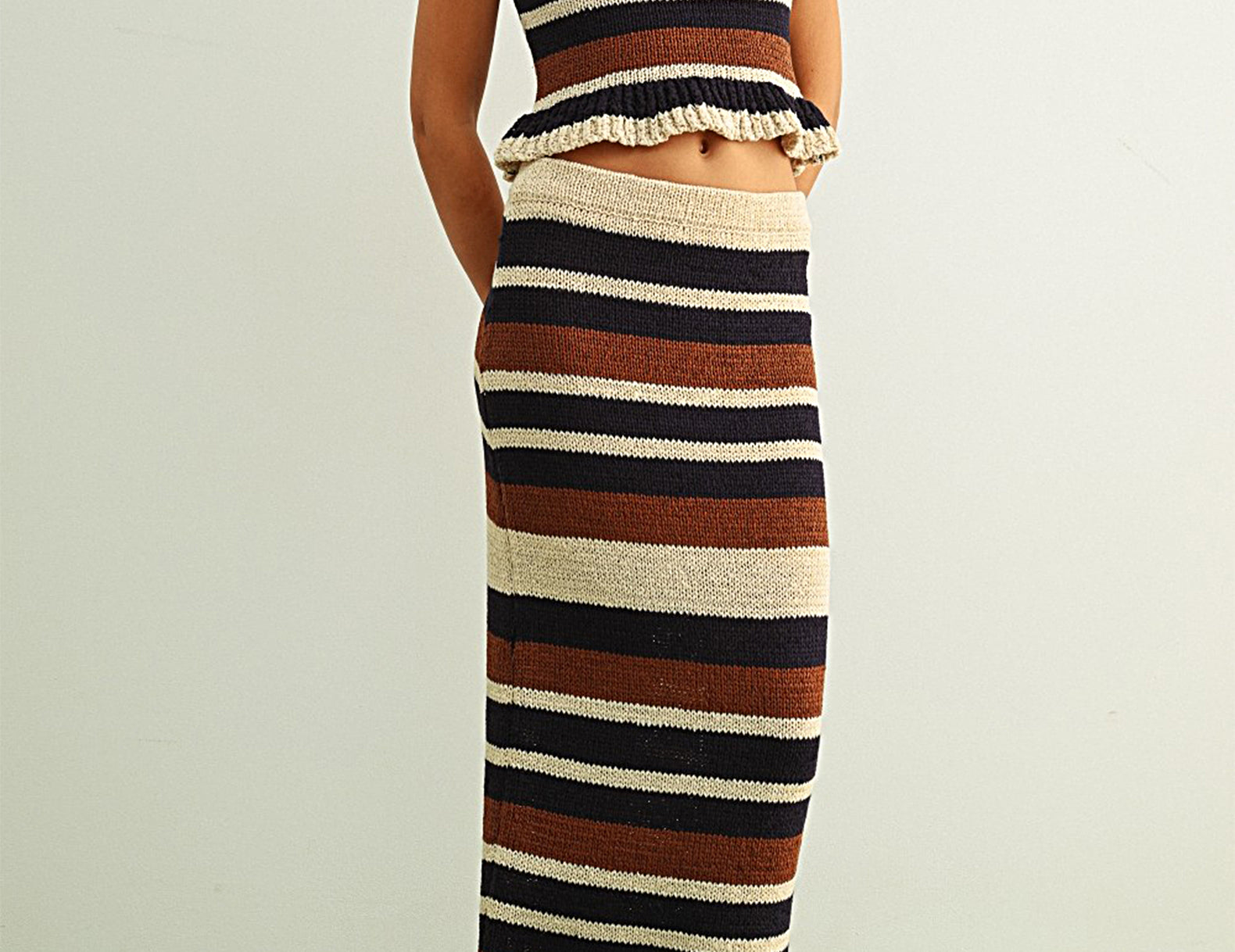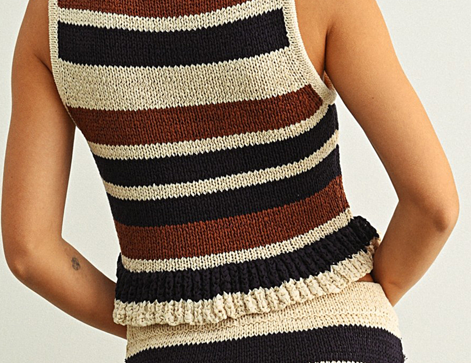 Done in a weighted yet airy knit, Rochelle is a charming staple that can be dressed up or down. It features a neutral palette in black, coffee, and ecru stripes, with a high-cut neckline and a semi-cropped, peplum finish.