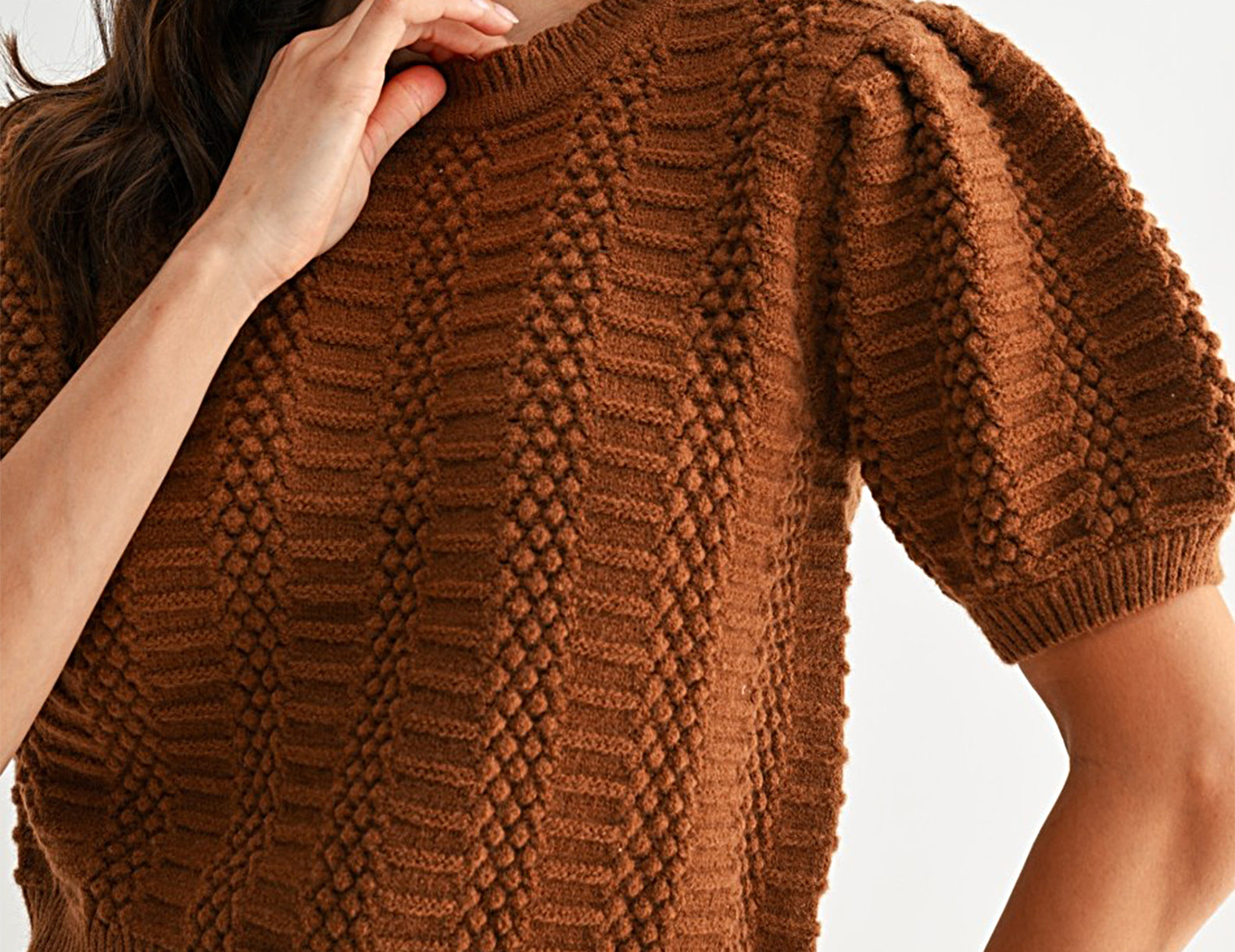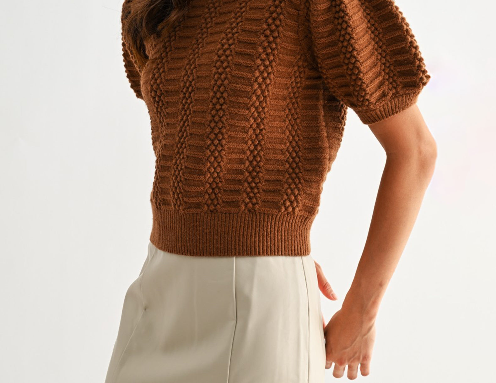 Fuzzy, boucled baubles and voluminous sleeves give this charming sweater vintage character. The coco brown, medium-weight knit is shaped with ribbed trim at the sleeves and waist, pleated at the puffed shoulders, and finished with a scalloped neckline. Pair this nostalgic silhouette with wide-leg jeans and loafers, or add a little print to this pattern with a floral skirt.