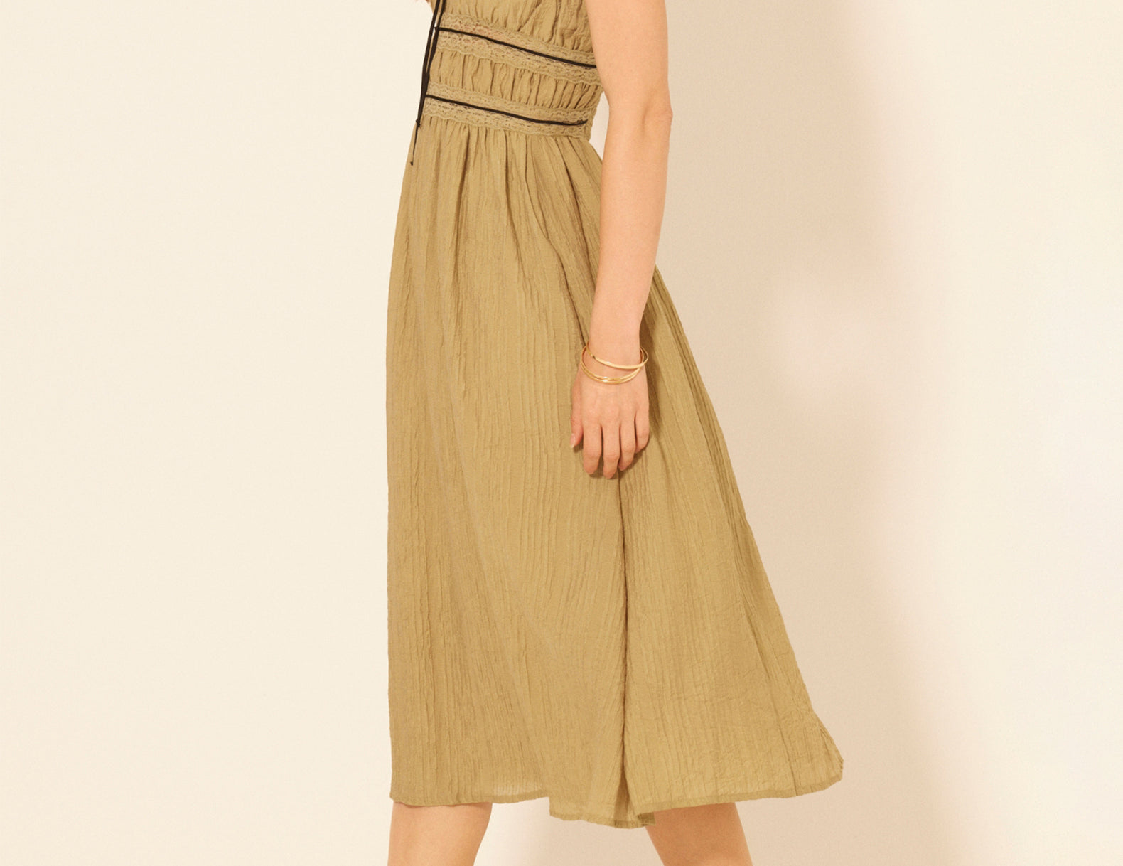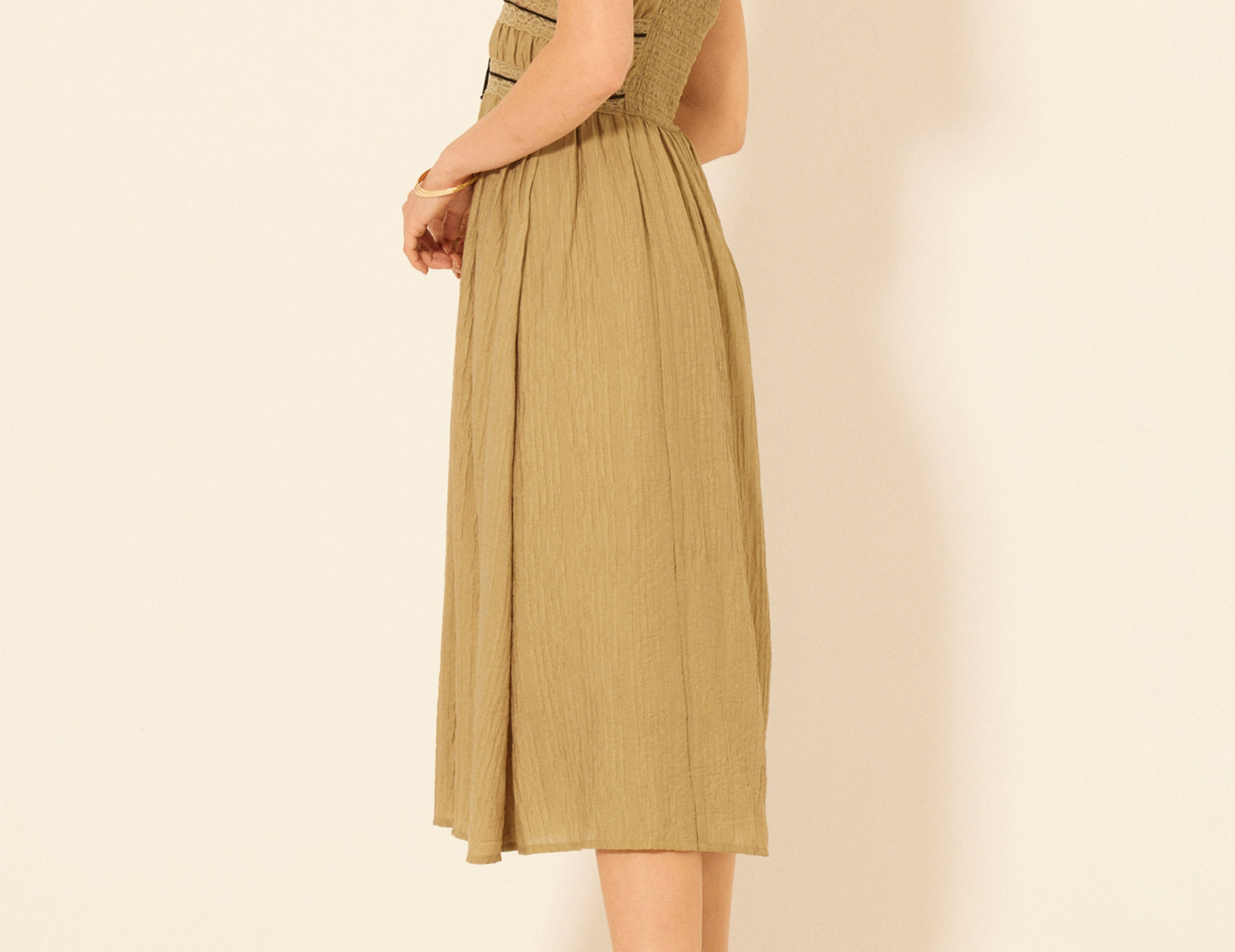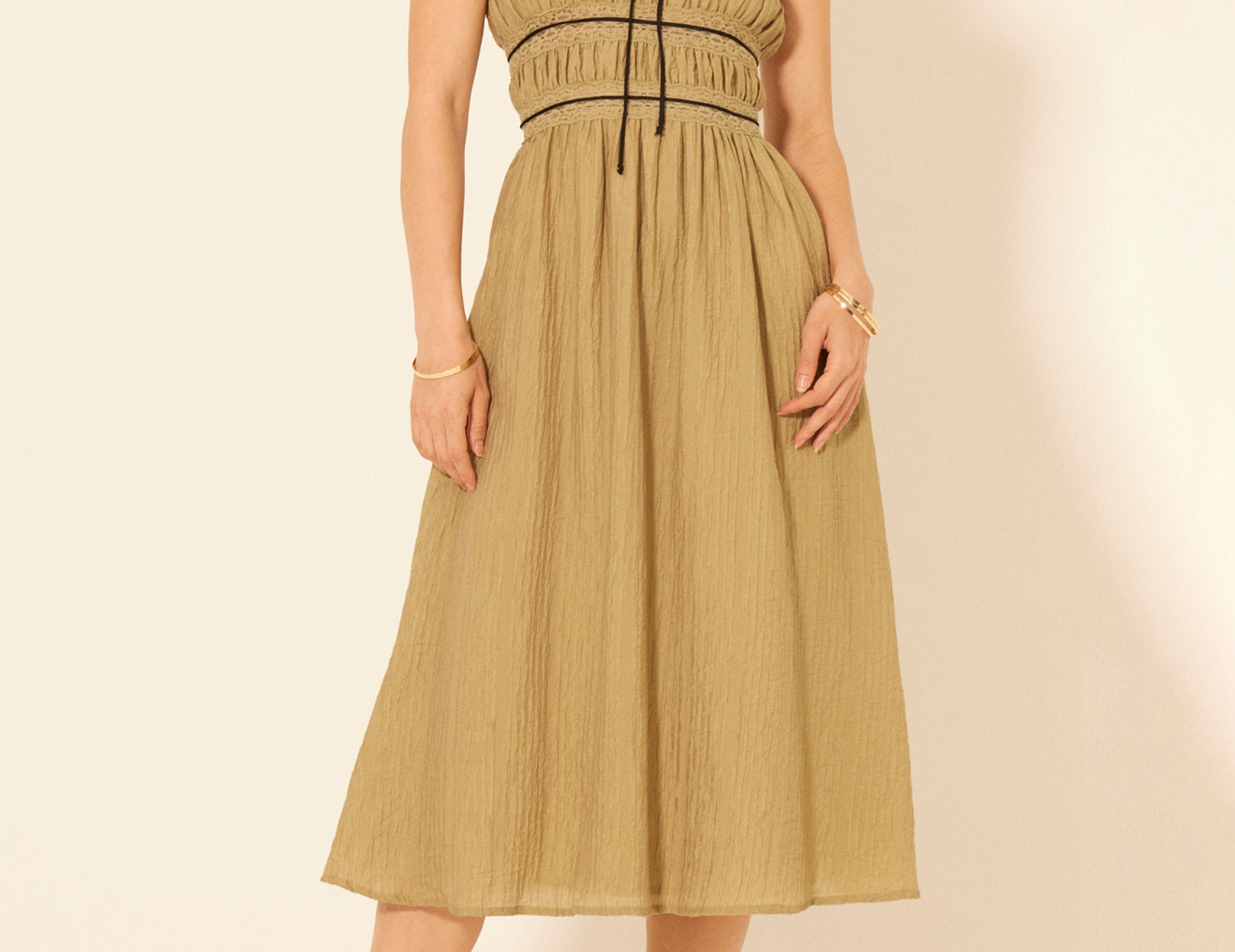 For the romantic at heart, the Rowan is trimmed in sheer, inset lace at the gathered bodice, and finished with black contrast detailing. Textured in a crinkled, hazel green fabrication with a stretchy, smocked back for a figure-flattering, fit-and-flare silhouette, finish this cottagecore midi with leather heels and gold jewelry, or dress it down with flats and a crochet cardigan.