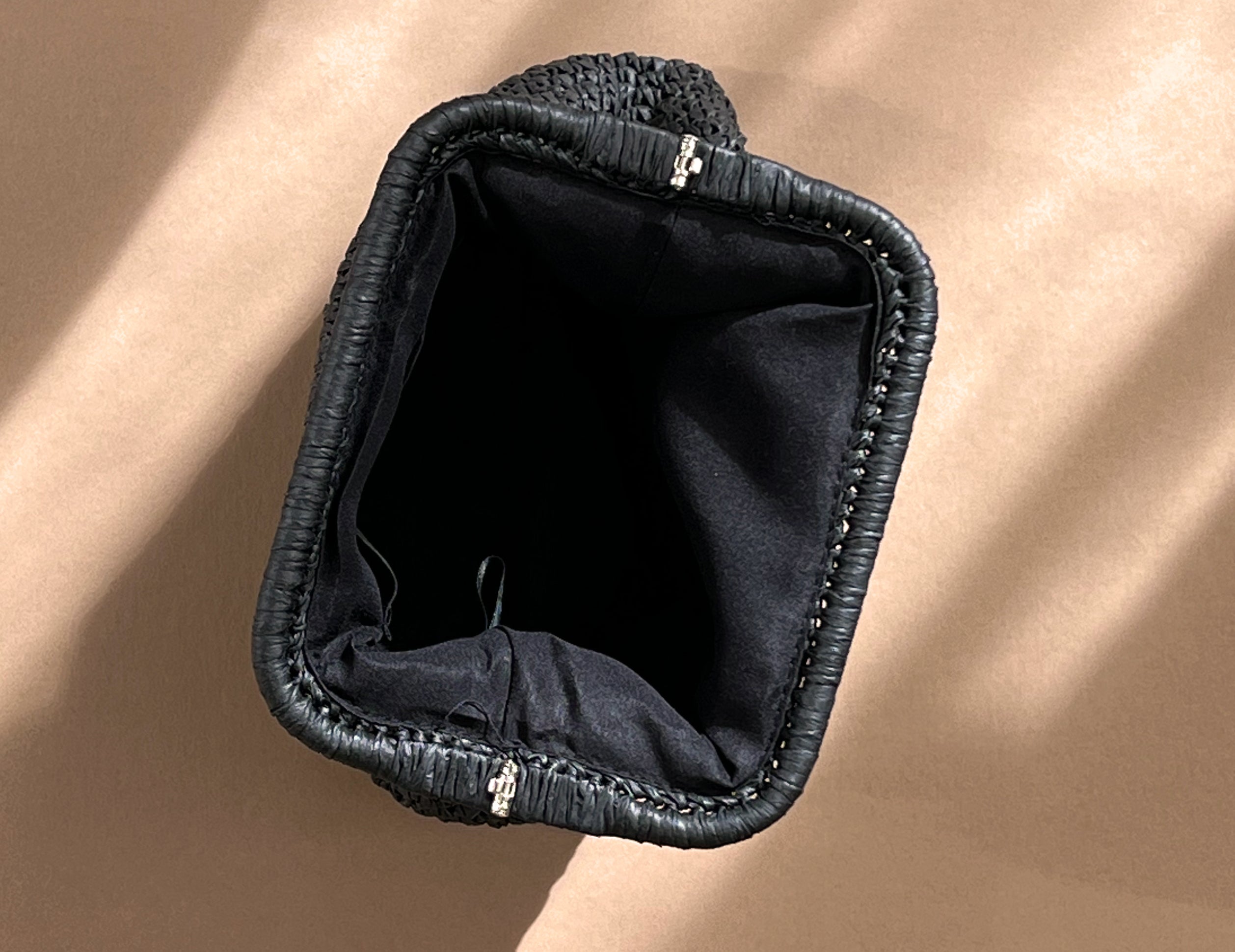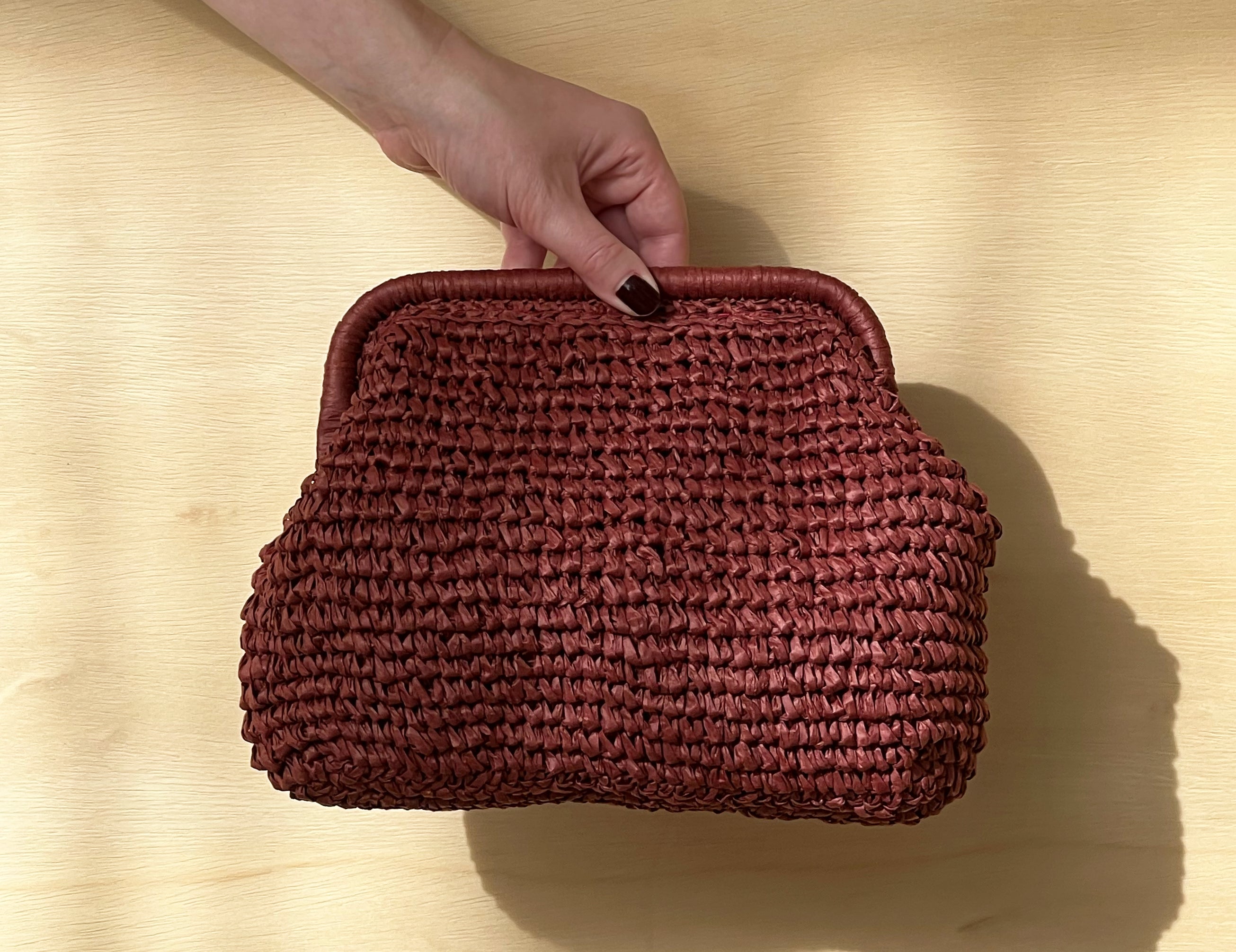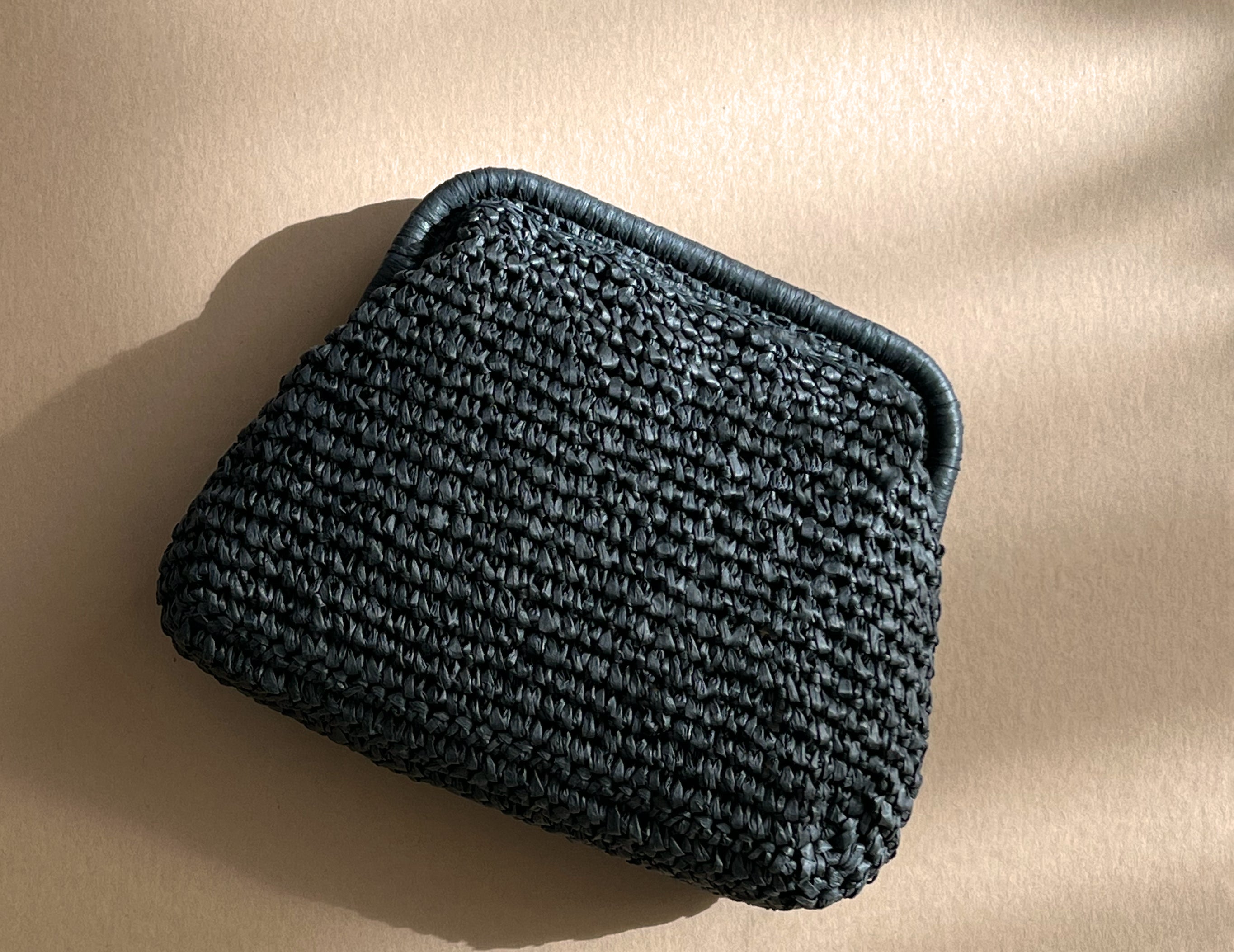 Add a touch of texture to any outfit with the Rue clutch. Woven in a lightweight, paper rafia in a nostalgic, coin purse shape, this bag is the perfect size for just the essentials. The hinged, clamshell opening at the top lends to a minimalist finish, with no buckle or clasp needed. Choose from versatile black or warm mahogany and pair it with a simple slip dress and ballet flats, or tuck it under your arm with a denim jacket and linen trousers.