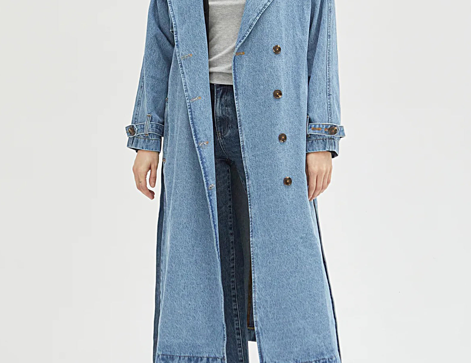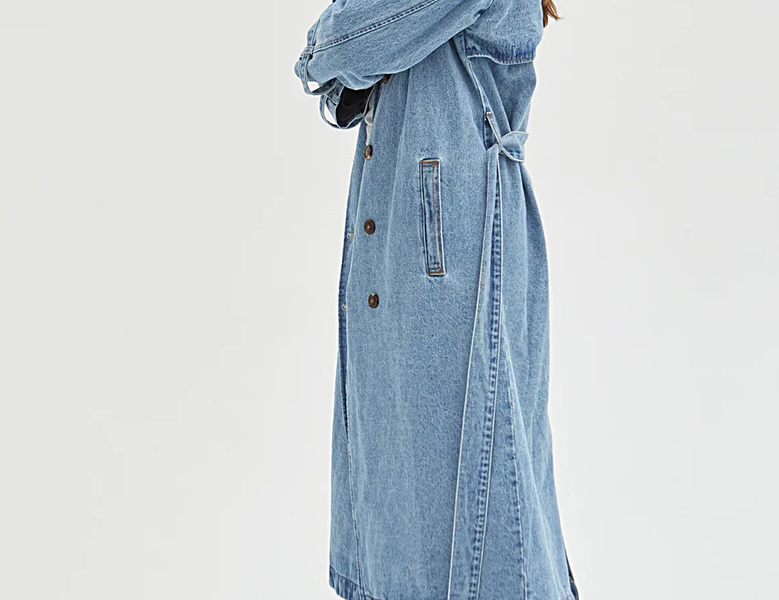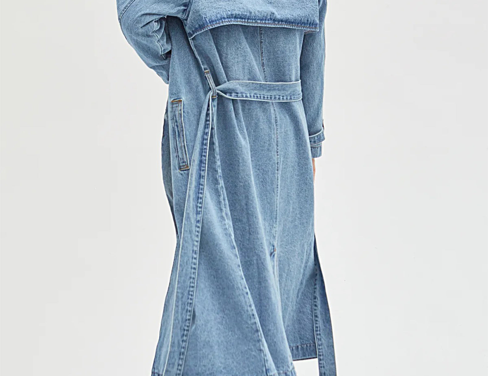 In heavyweight denim cut to a classic, longline trench coat, the Ryland is crafted from medium wash, pre-softened recycled denim with flat gold contrast stitching throughout. Detailed with tortoise buttons, a wrapping rain flap, and buttoned straps at the cuffs, this wear-with-everything essential has an oversized fit that can be shaped at the waist with the matching tie.