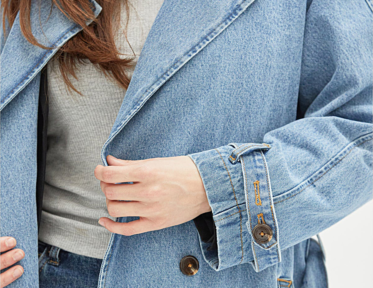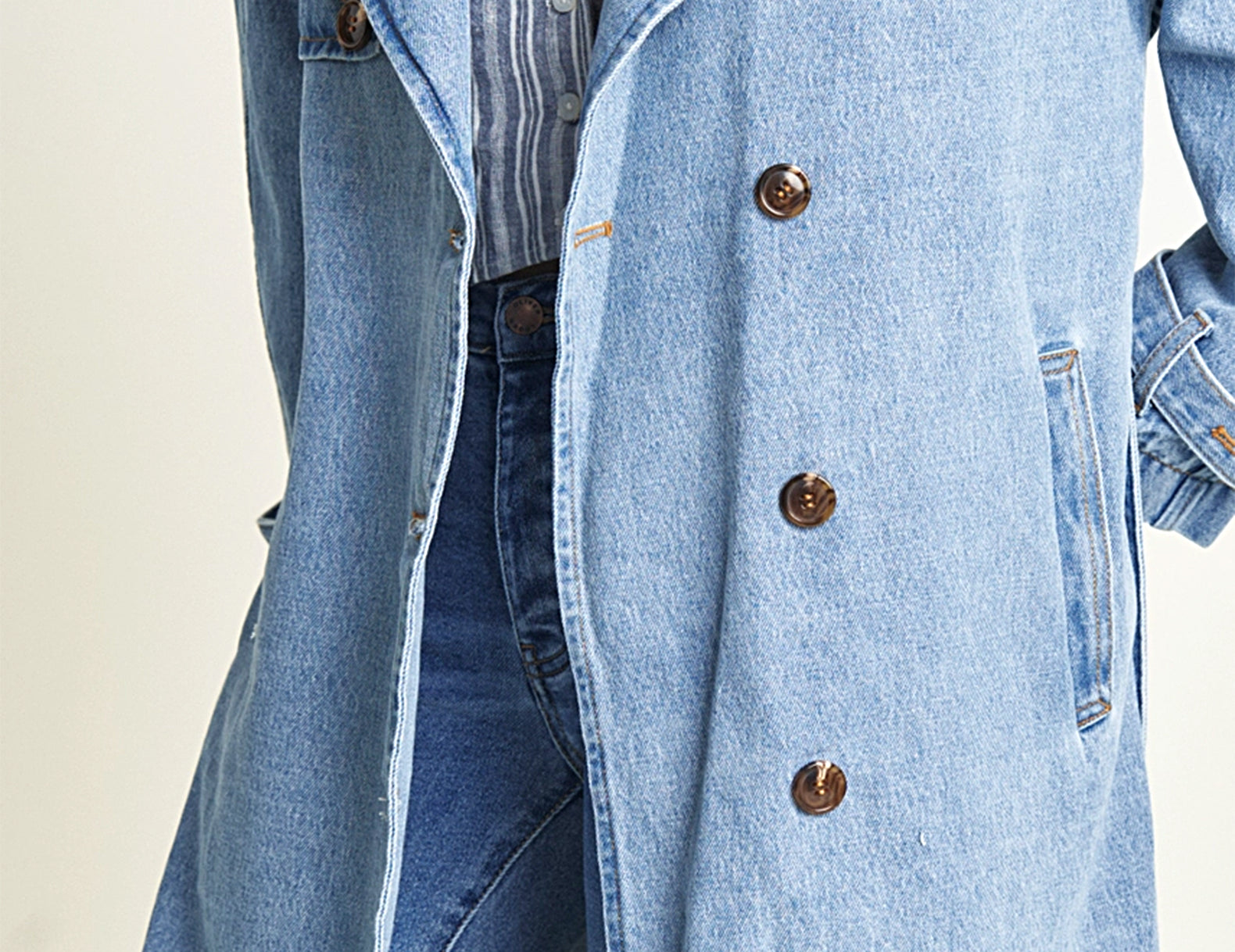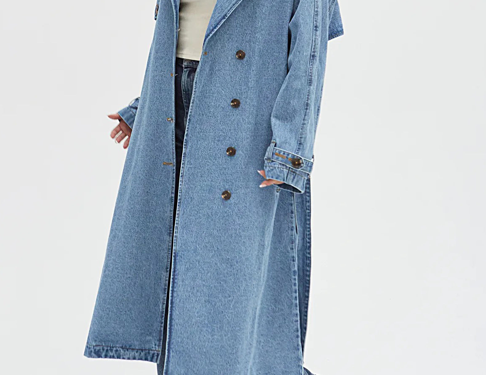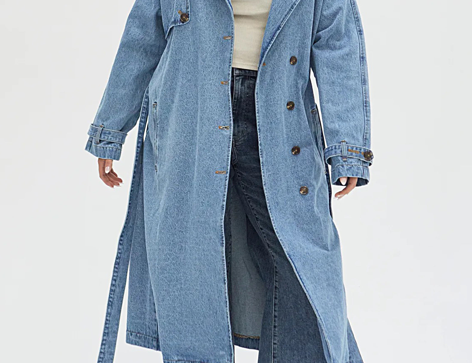 In heavyweight denim cut to a classic, longline trench coat, the Ryland is crafted from medium wash, pre-softened recycled denim with flat gold contrast stitching throughout. Detailed with tortoise buttons, a wrapping rain flap, and buttoned straps at the cuffs, this wear-with-everything essential has an oversized fit that can be shaped at the waist with the matching tie.