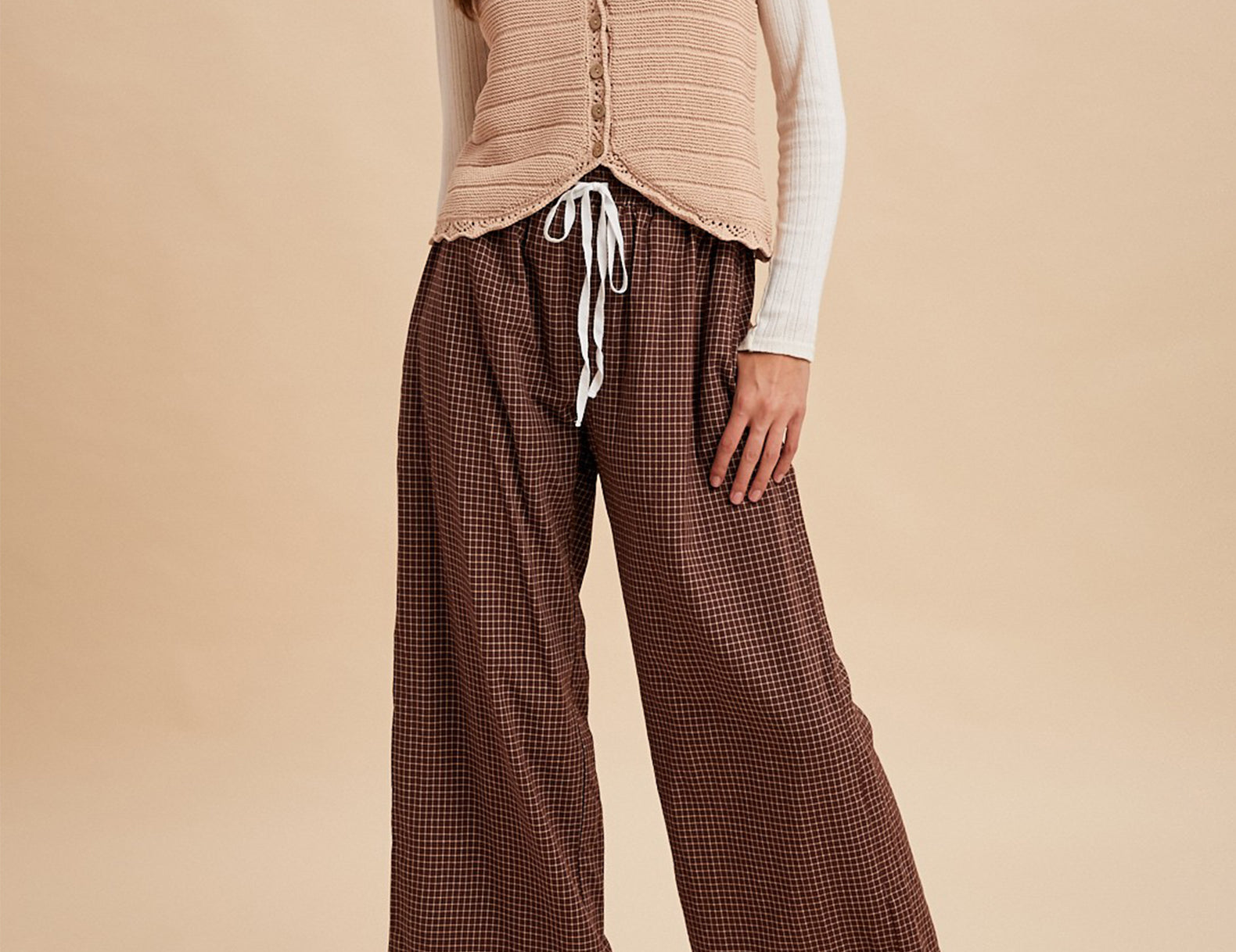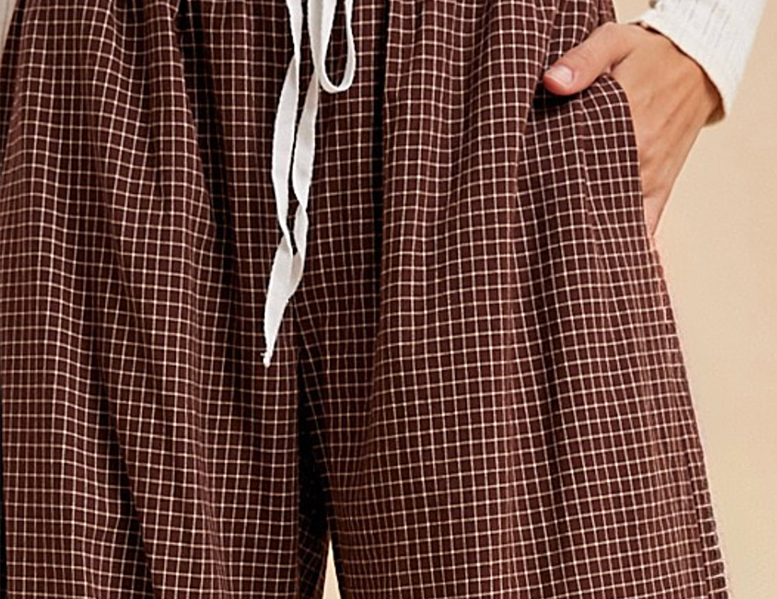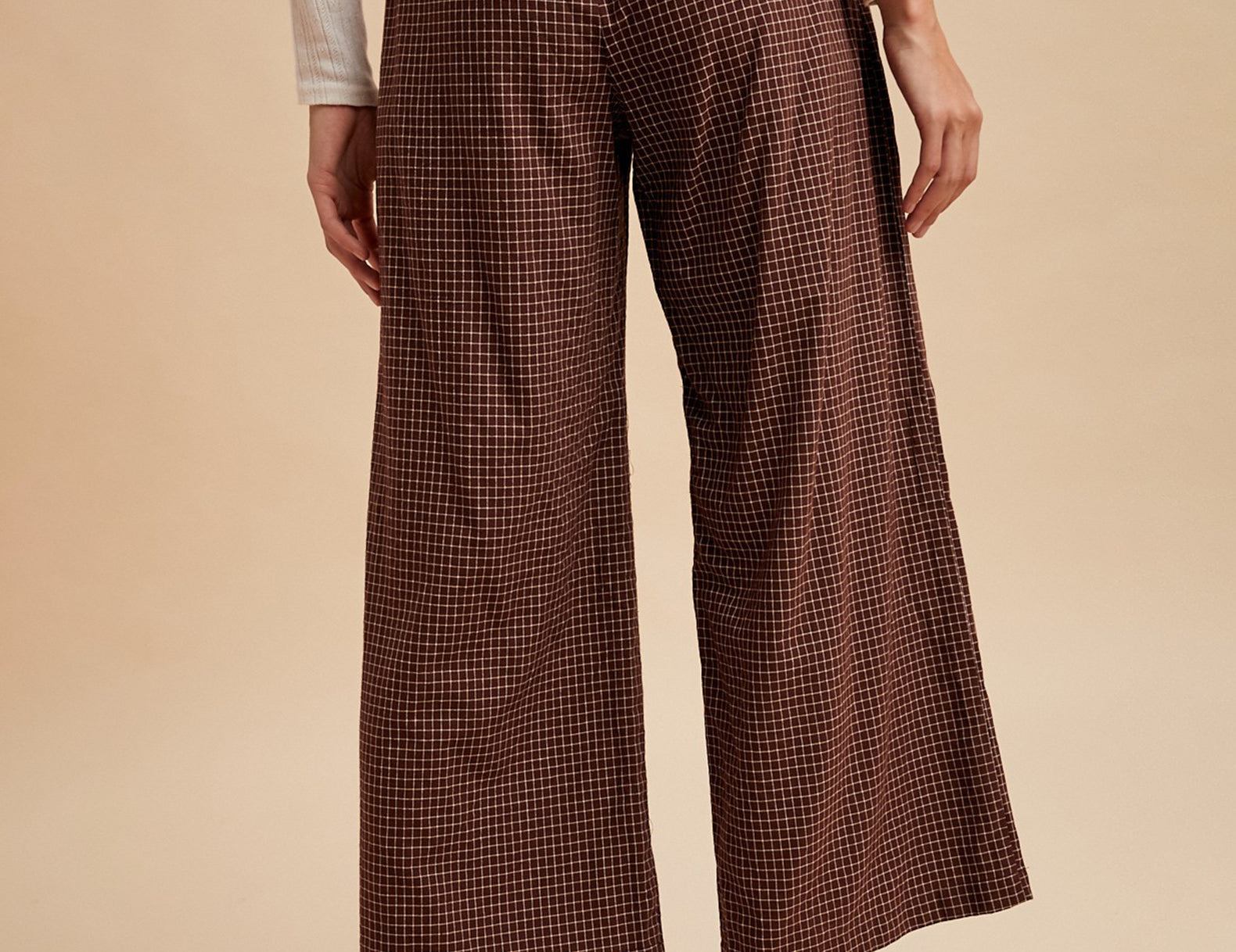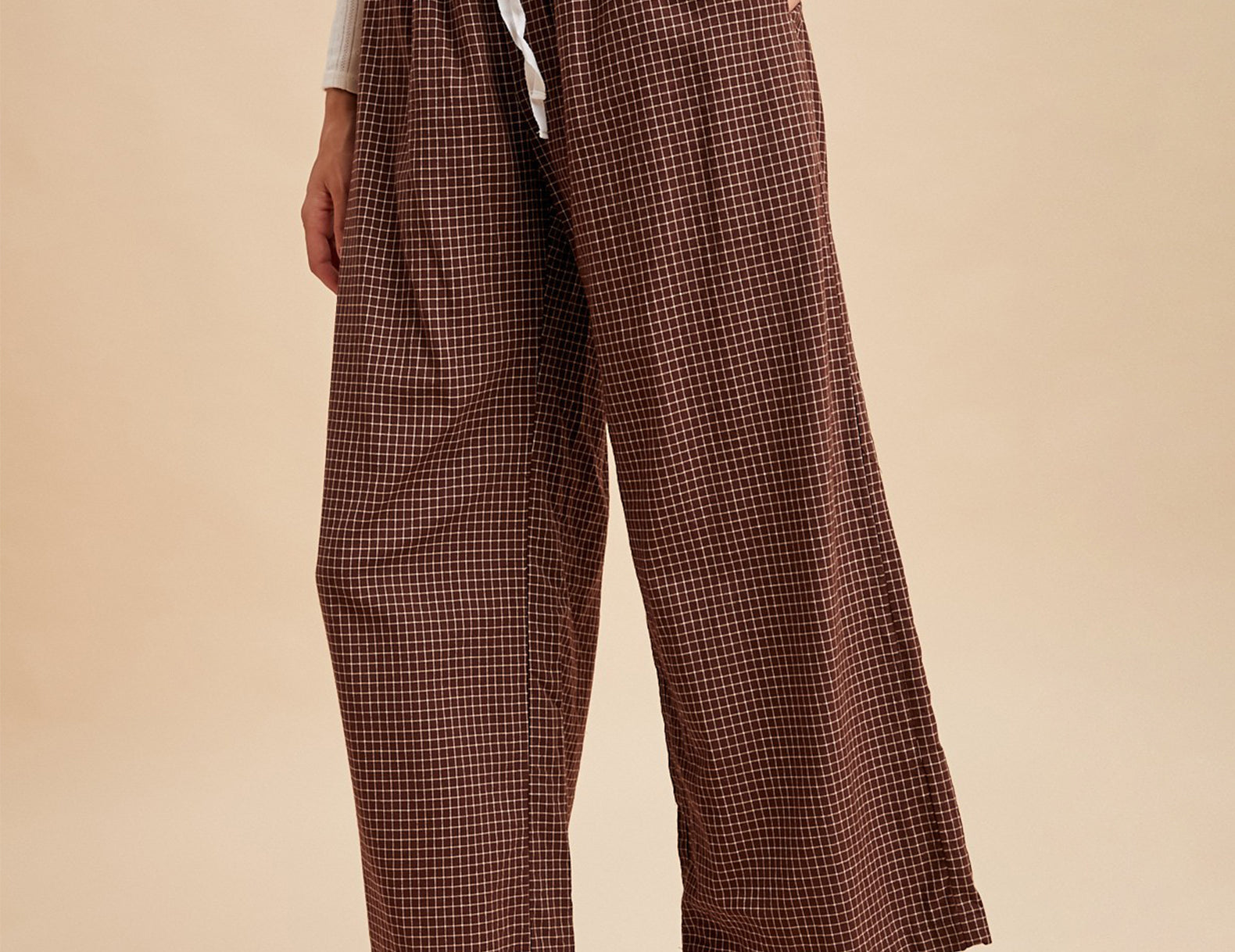 Elevated in a simple, at-ease fit, these wide-leg pants sit high on the drawn + elasticated waist, with a cropped inseam and essential side pockets. Soft and lightly structured in a mahogany brown cotton with a micro cream check print, try the Sharon pants paired with a slouchy sweater and lug boots, or a fitted vest, striped socks, and loafers.