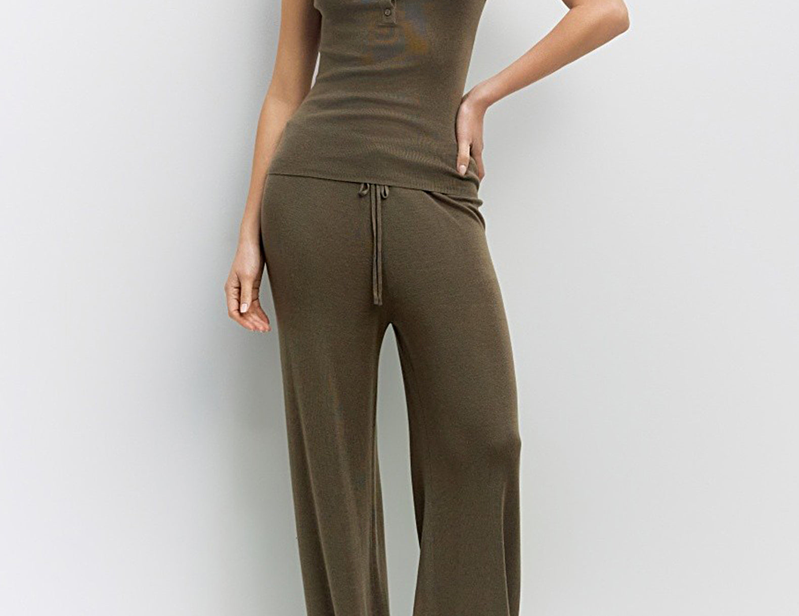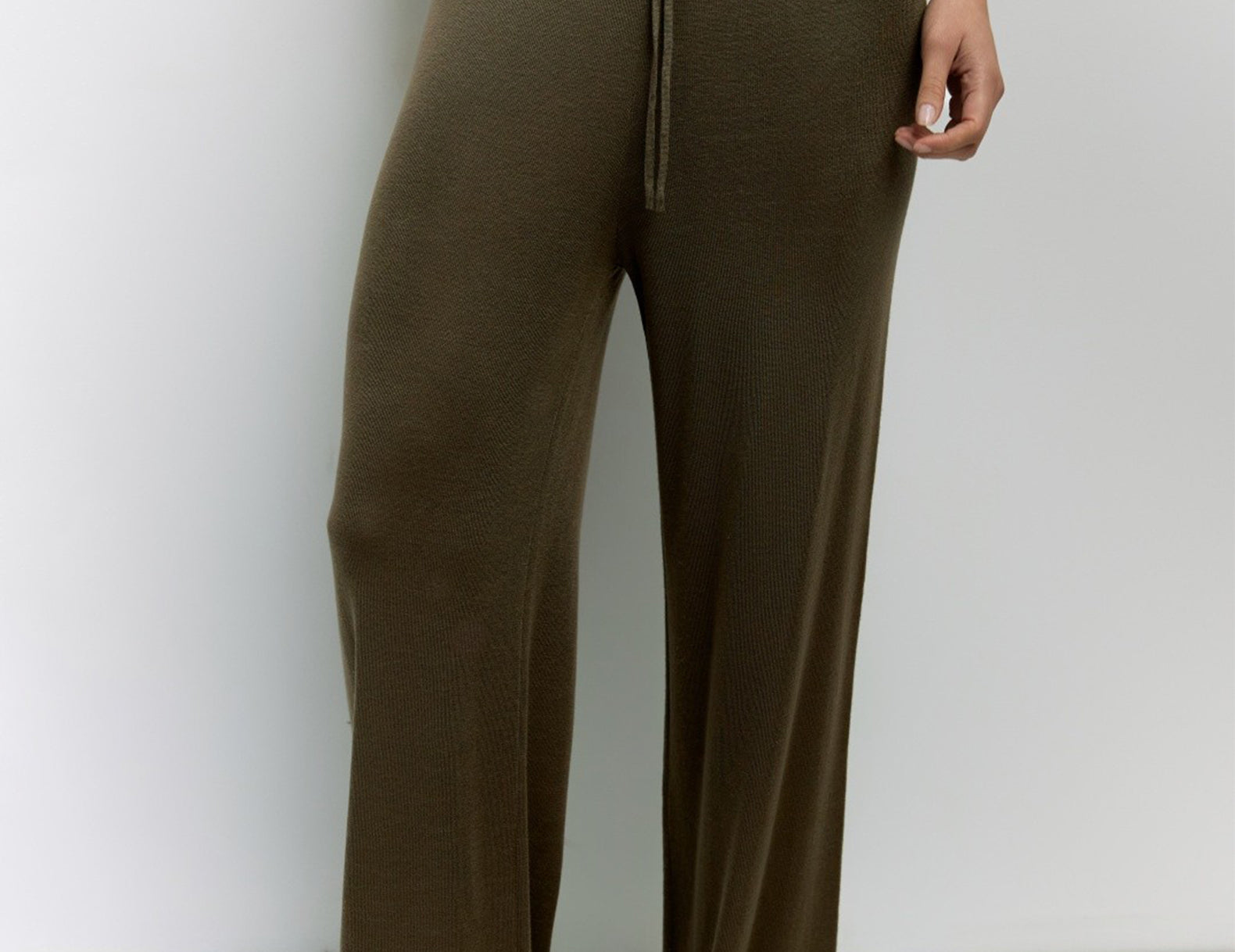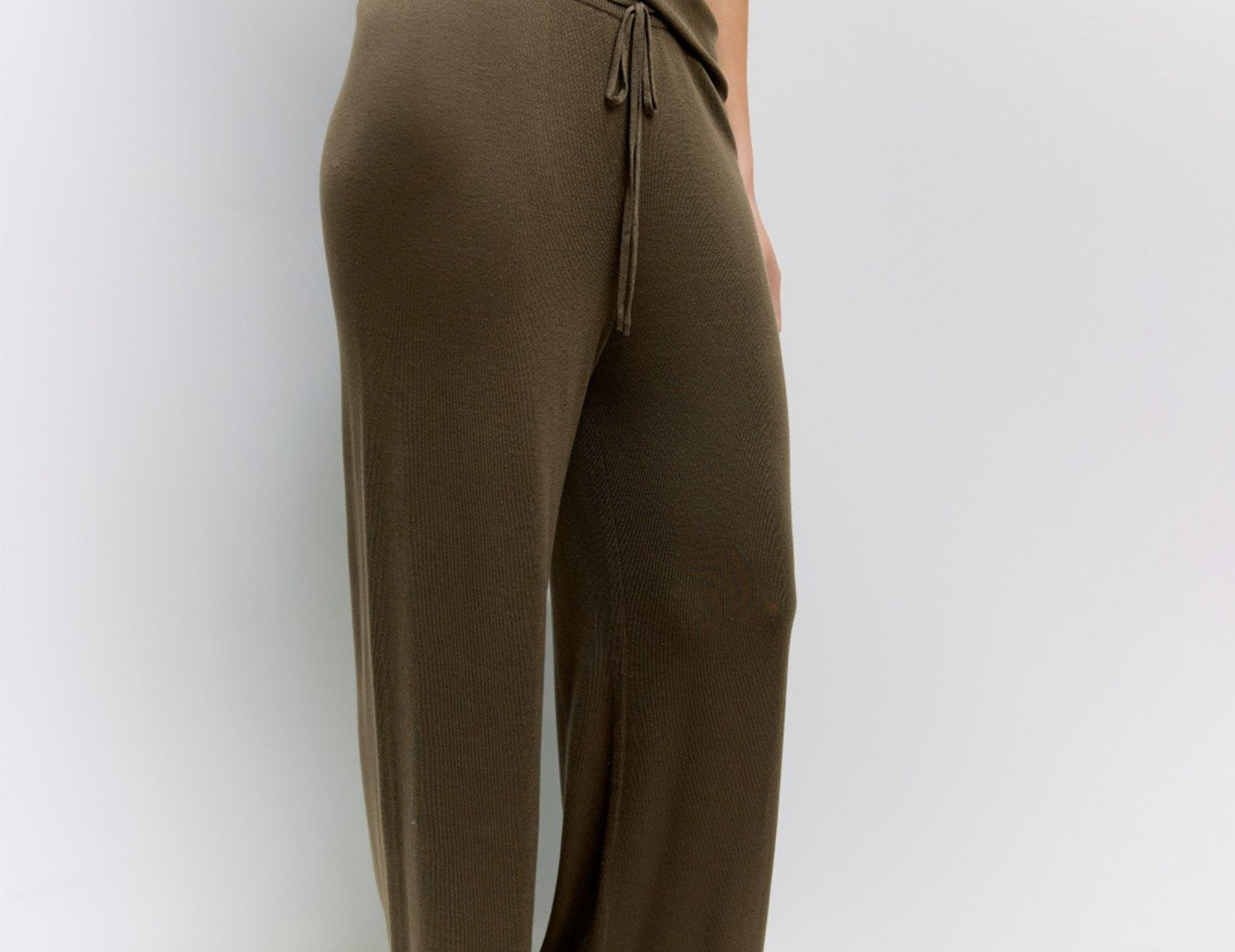 - Slim drawstring through the stretchy ribbed waistline