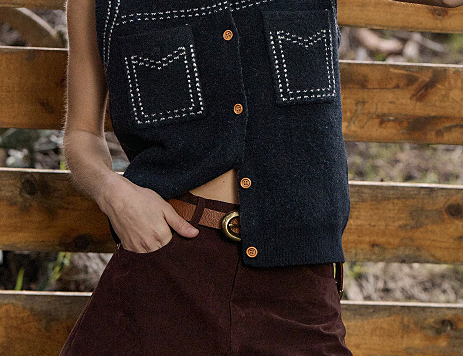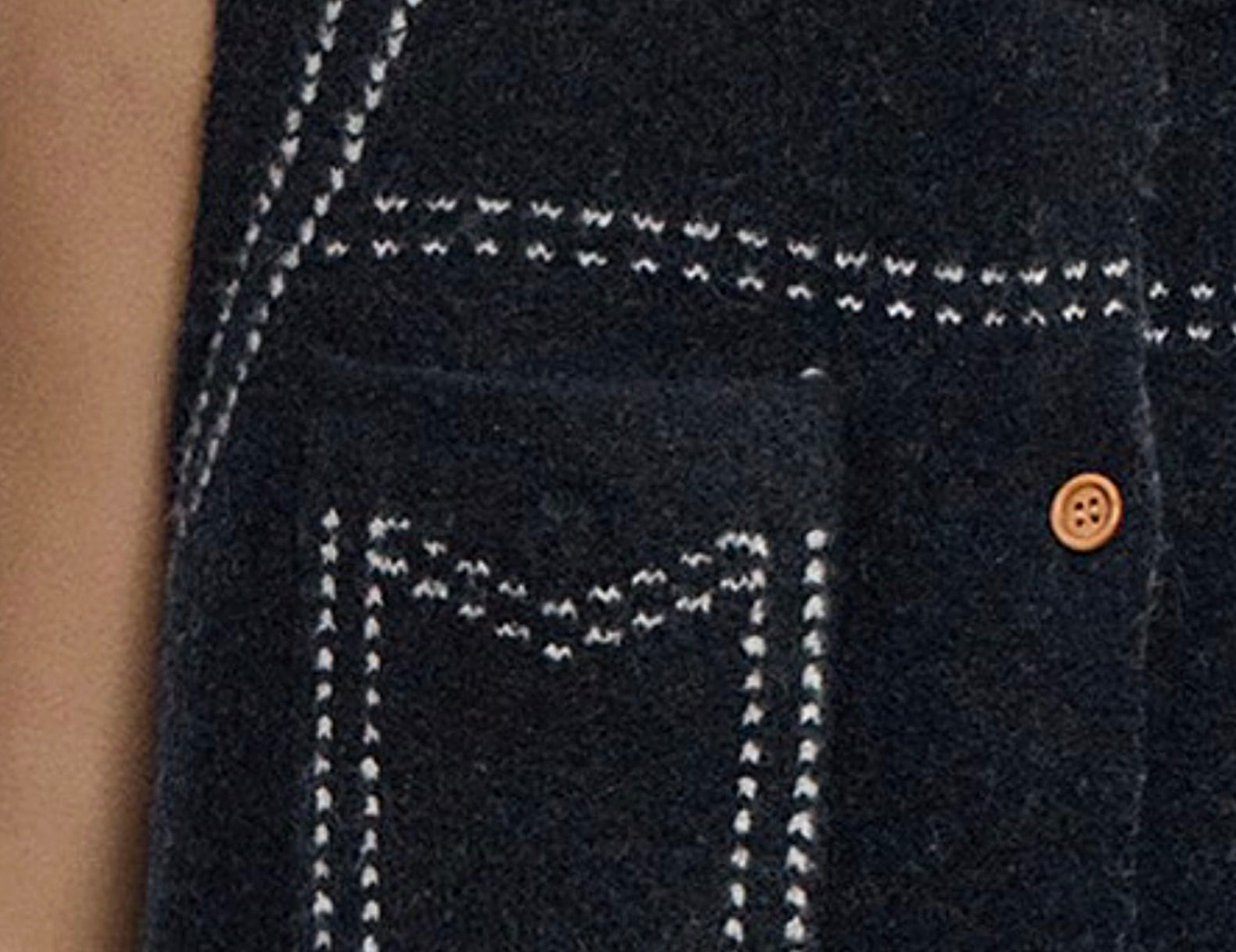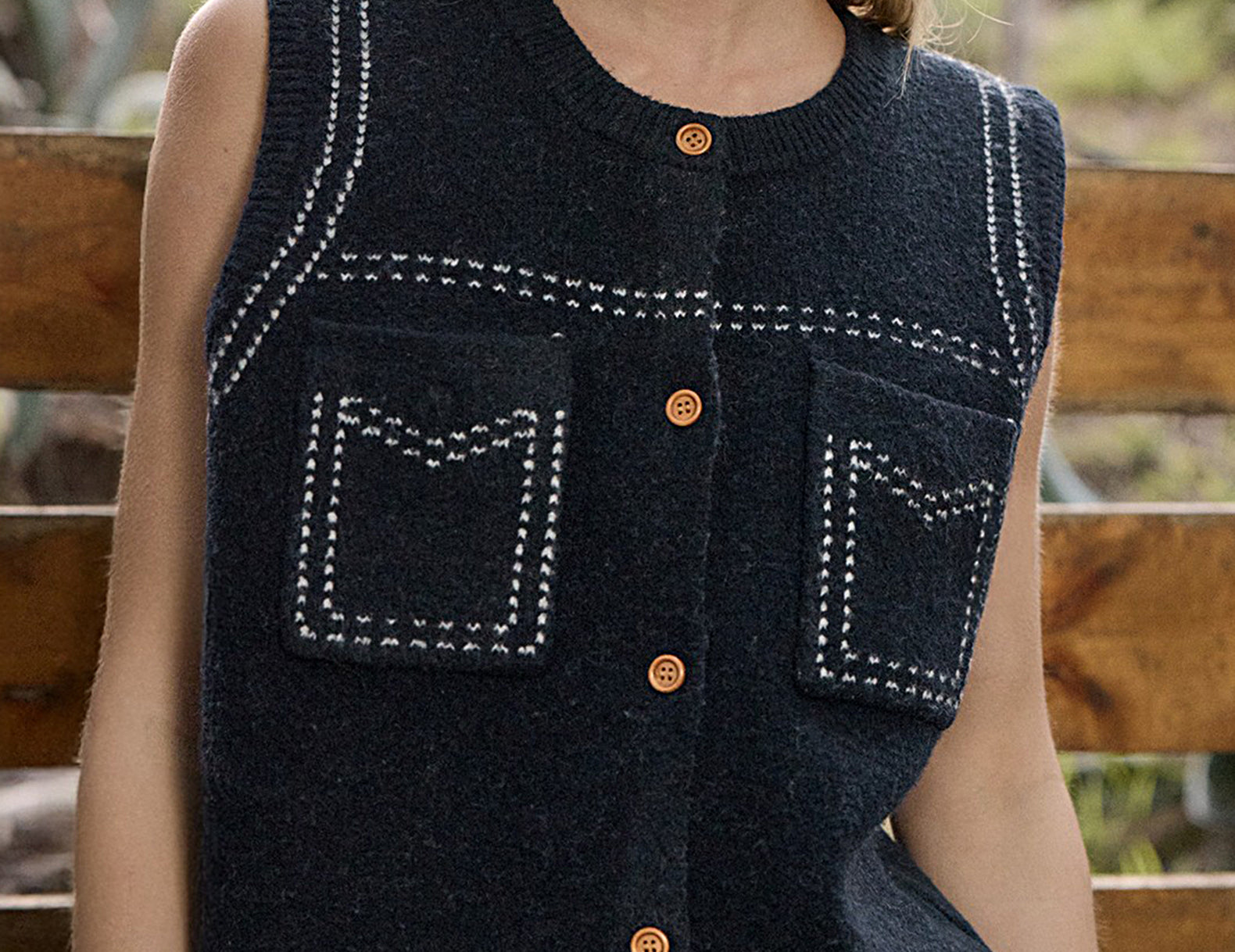 Somehow both sophisticated and whimsical, the Sophie vest will get you all the compliments. It's done in a deep navy, plush, felted knit, with ivory "stitched" detailing woven into the fabric at the chest pockets and yoke. Small wood buttons run top to bottom at the front. Pair this weighted sleeveless top with wide-leg trousers or try it layered over a crisp button-up.