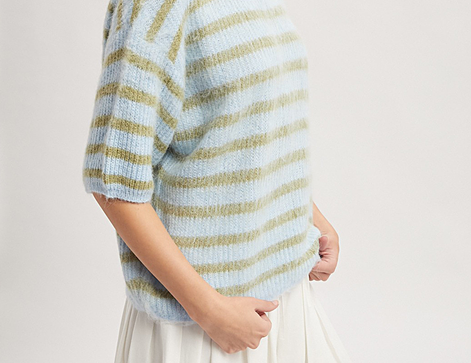 In an unexpected color combo with an ultra-soft, fuzzy finish, the Spencer sweater is a perfect pick as we move towards spring. Wear it now layered over a long-sleeve tee and relaxed denim, then toss it over a dress and boots for a light layer as temps start to warm. With a crew neckline and short sleeves that graze the elbows, this green and blue striped sweater is just as good on a cozy, coffee shop day as it is for a sunny afternoon in the park.