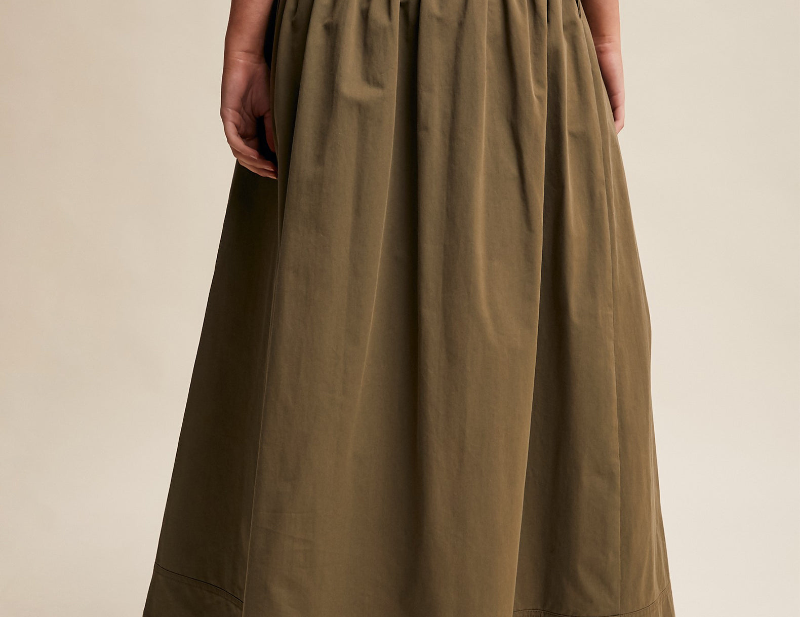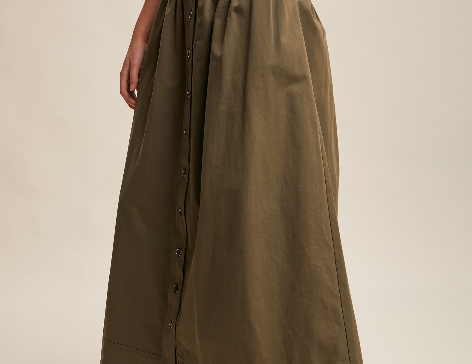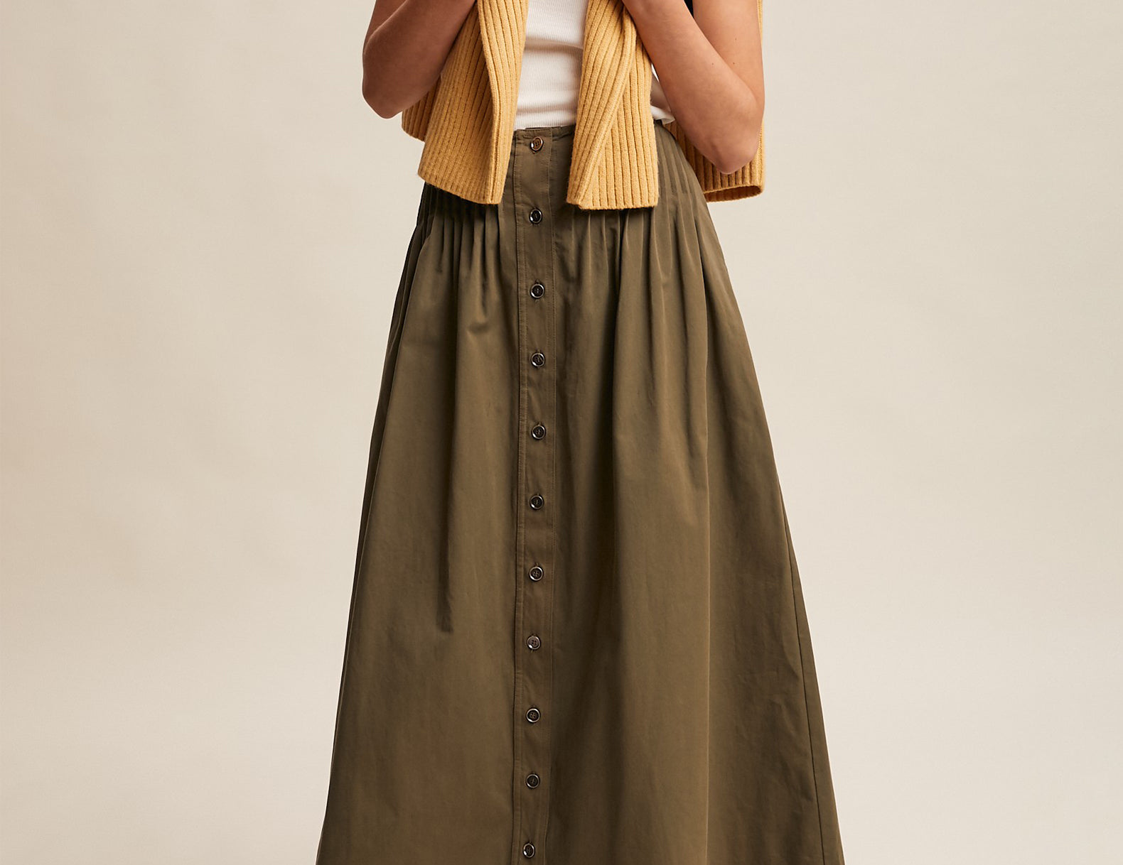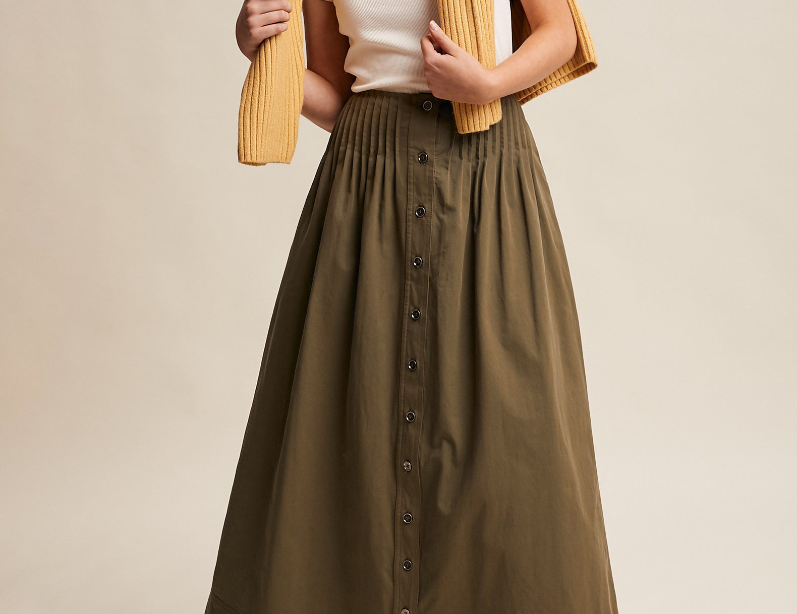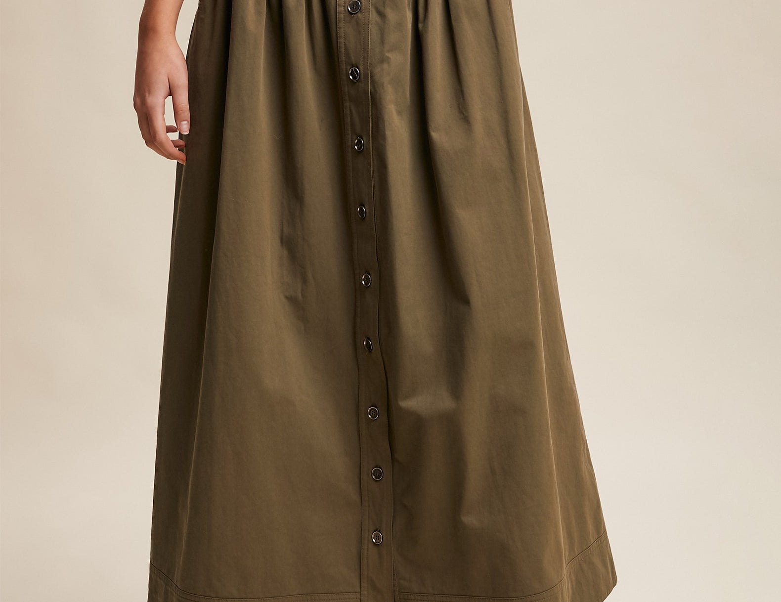 Swap this classic yet interesting skirt in when you might otherwise reach for your favorite denim. In a deep olive hue, it wears like a basic, but stands out as a novel choice. The Stella skirt is cut from a light yet structured poplin cotton to a full, A-line silhouette, with buttons from the waist to the hem. Pintuck pleats add shape and texture. Try it with a satin camisole and knit cardigan, or a vintage tee and sneakers.