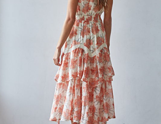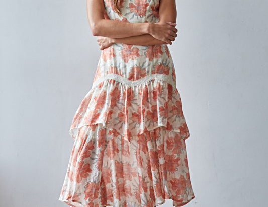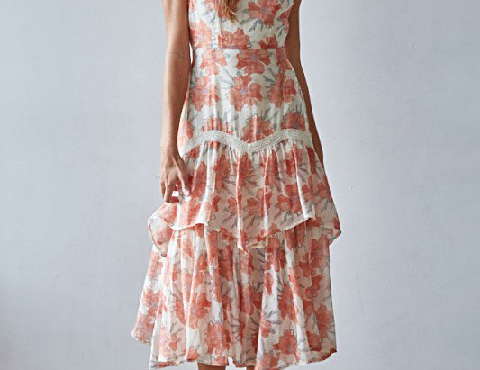 Ultra feminine in ruffles and a coral floral print, the Sybil dress will get you all the compliments. At the top, ruffled, cap sleeves and a v-neckline trimmed in ivory lace. Below the defined waist, the skirt is smooth and fitted through the hips, meeting lace-trimmed arches and layered ruffles that stretch to the hem.