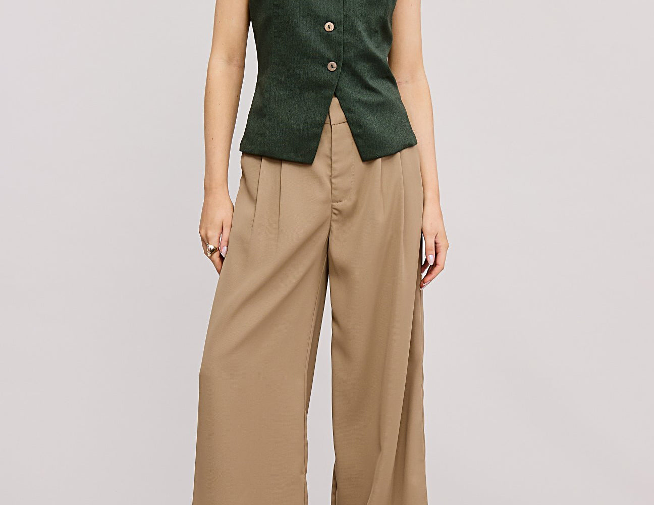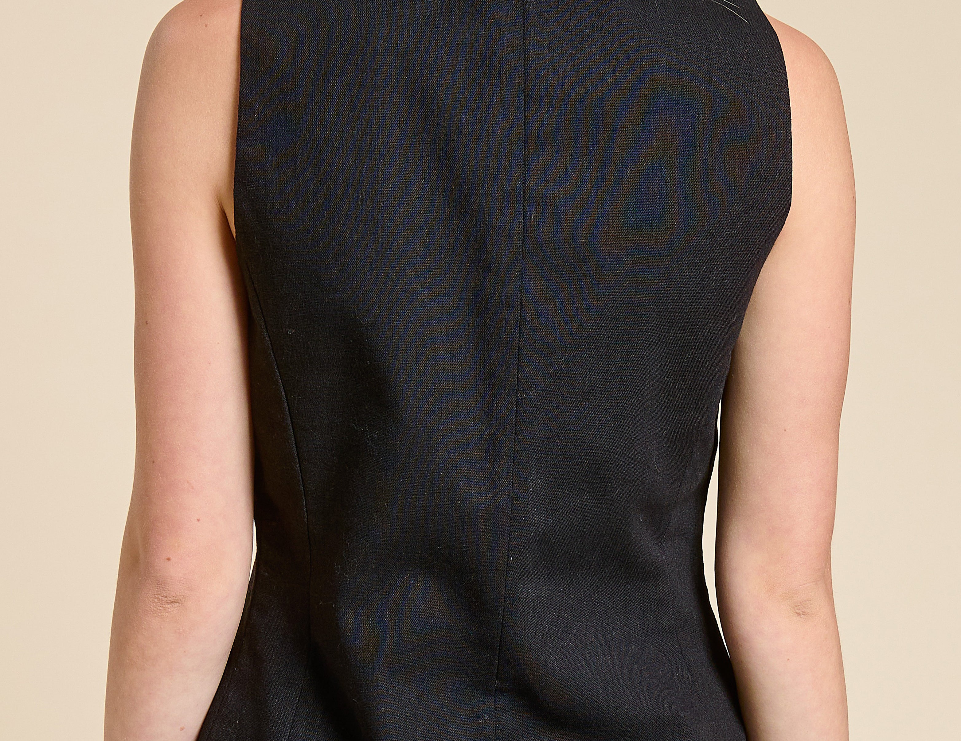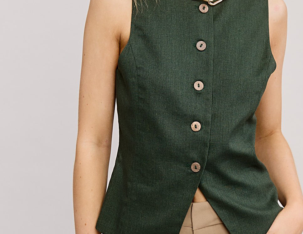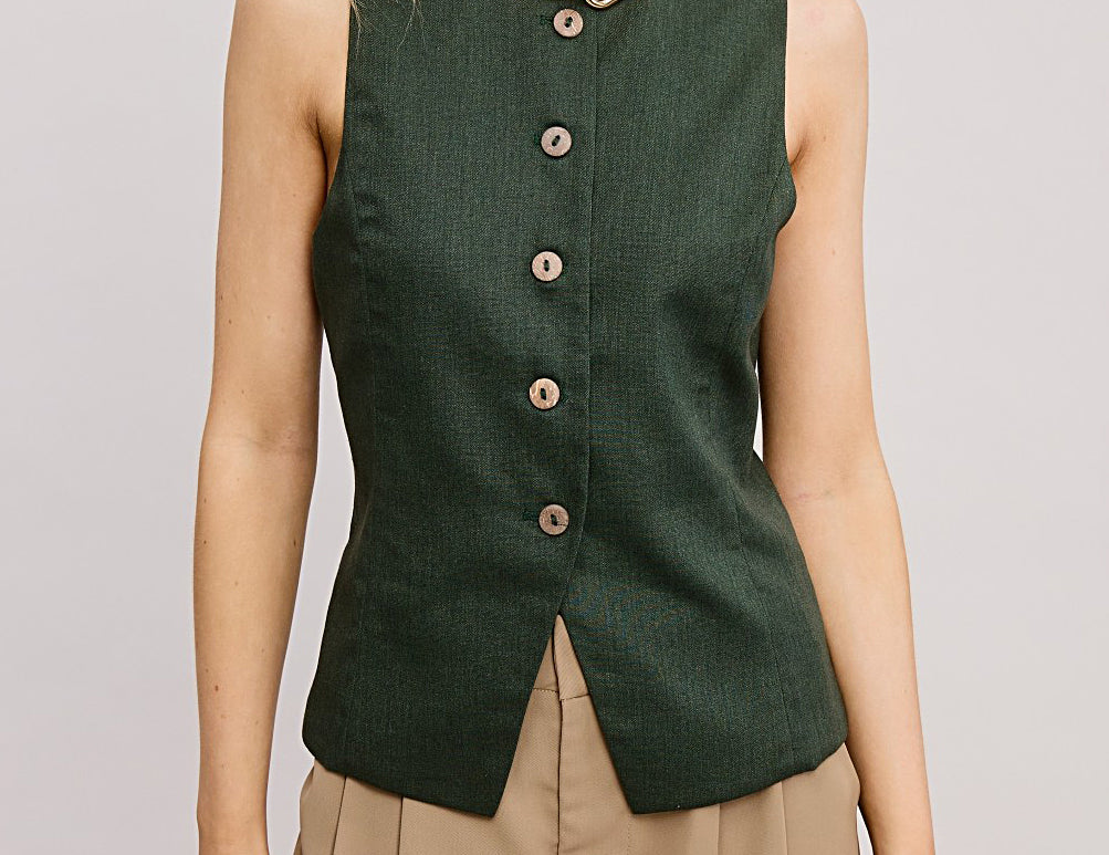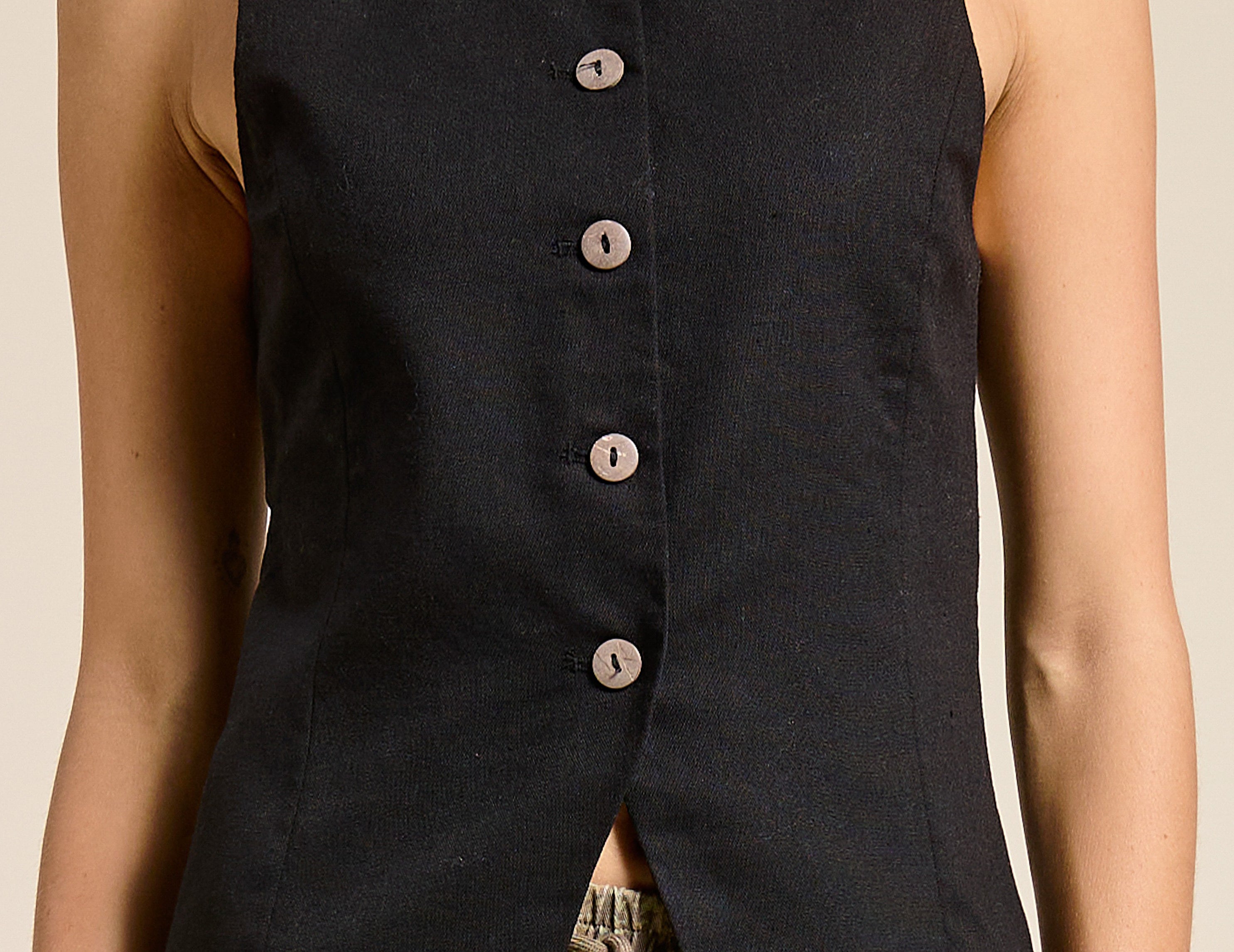 A simple favorite to wear solo or layered, the Tabitha top is lightly structured and textured against a soft linen blend in classic black or deep forest green. Fully lined with coconut buttons and a notched front hem, style this vest top with trouser shorts or a silken midi skirt for a little extra polish.