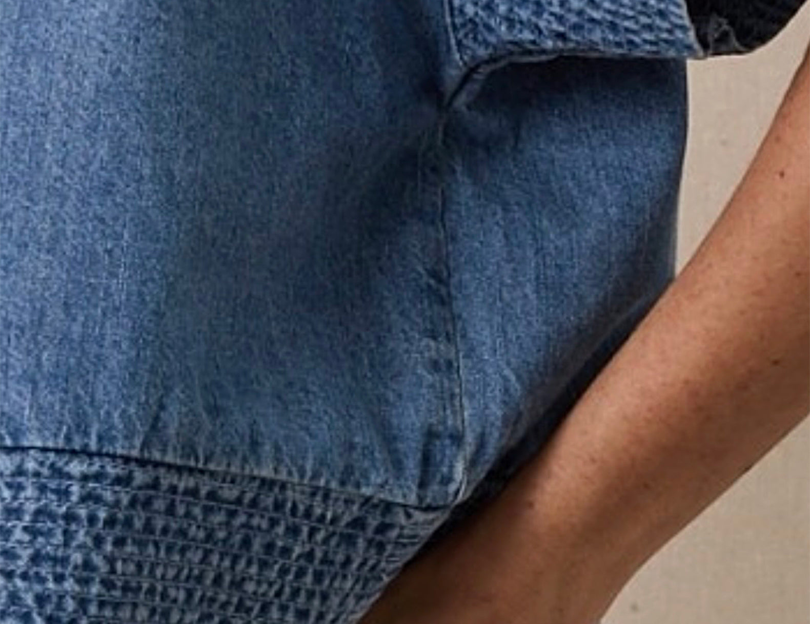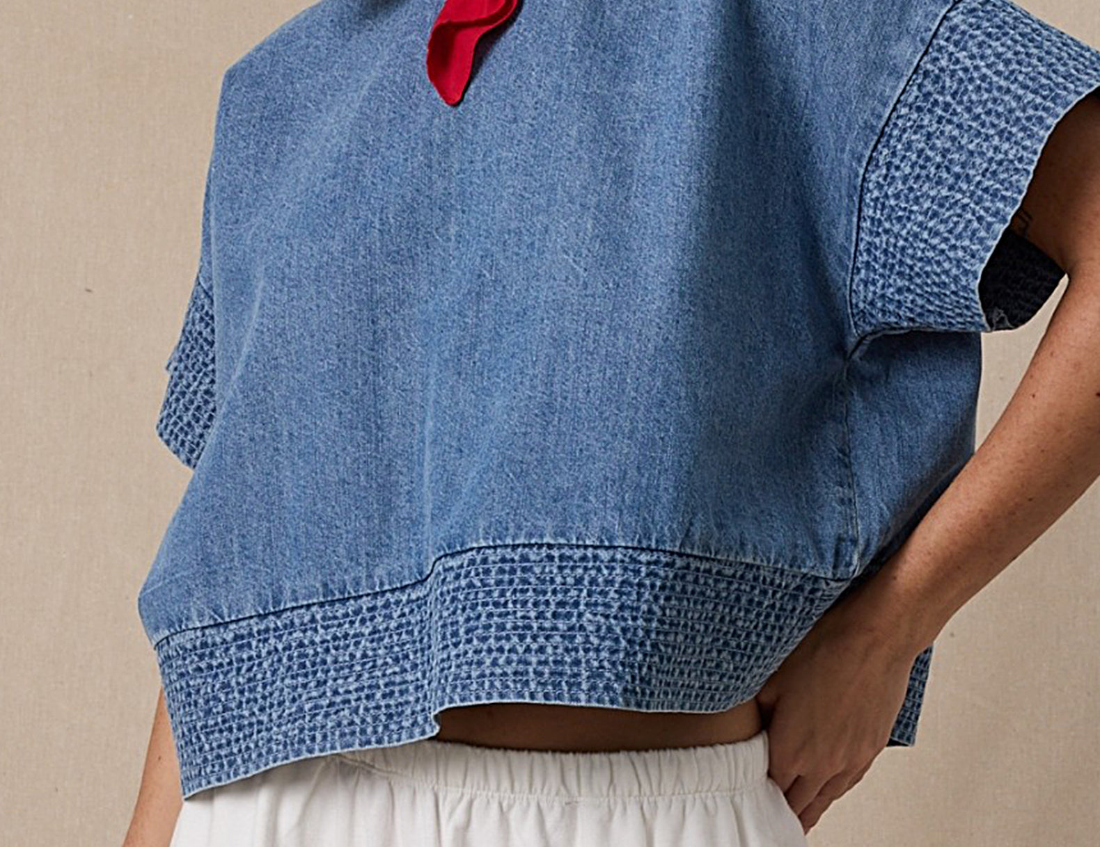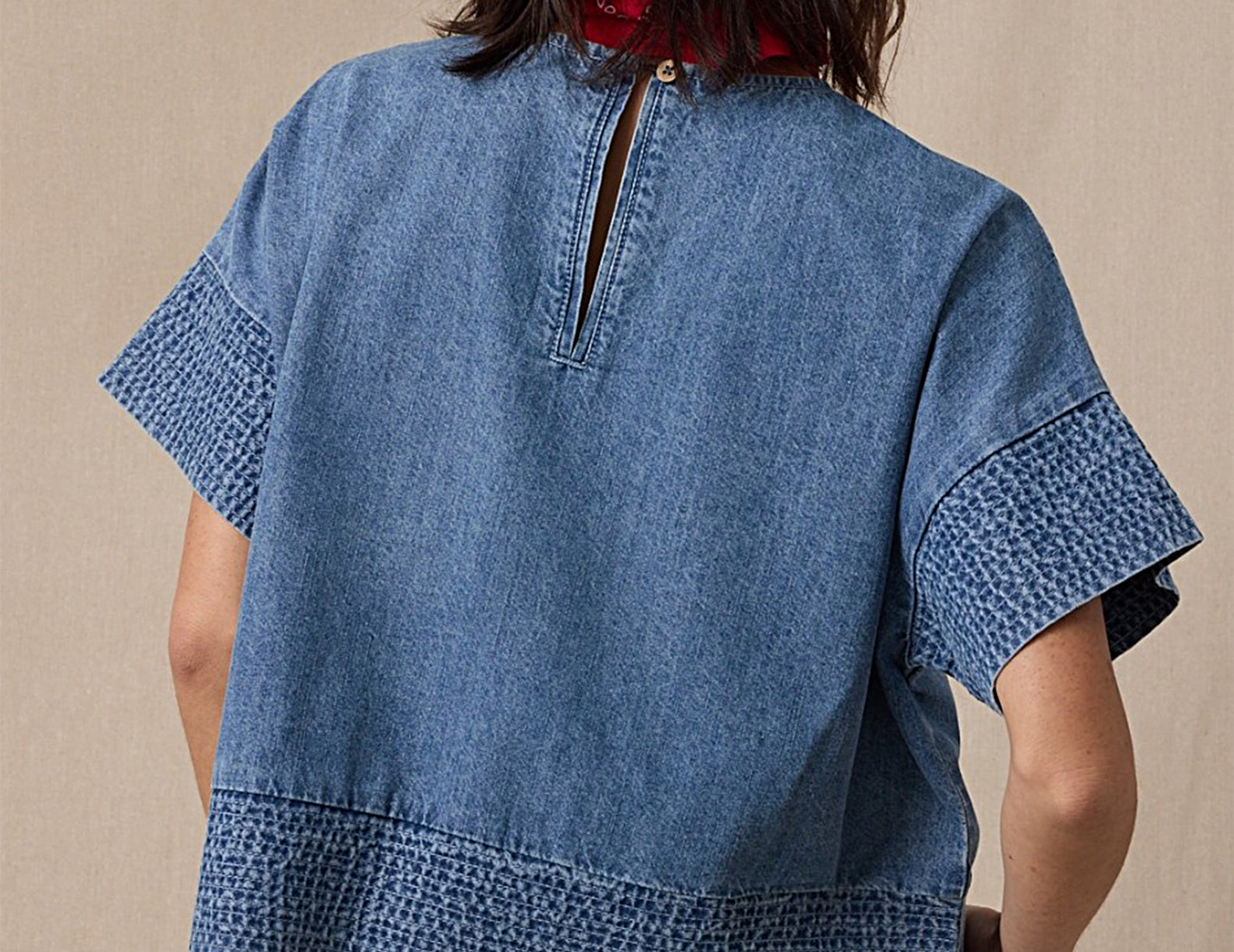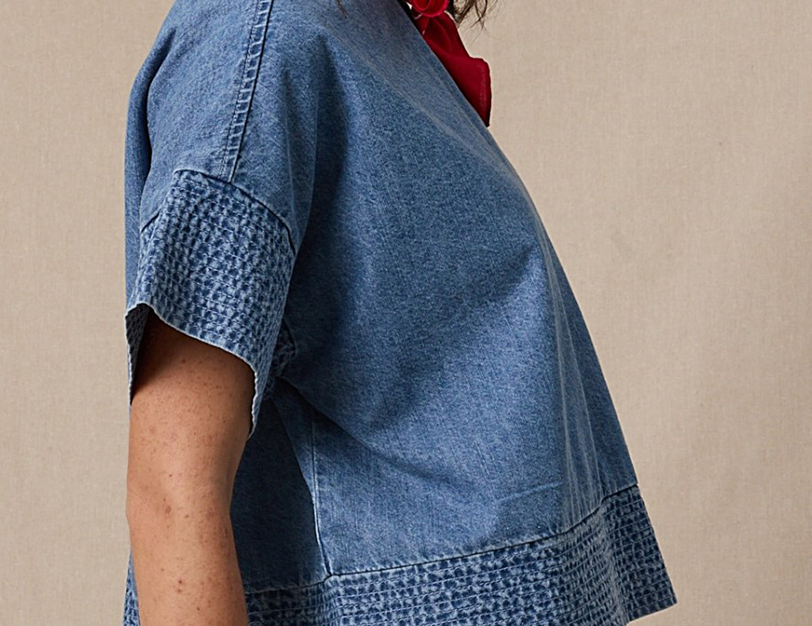Like a basic tee but better, the Terra denim top is low-key yet cool. It's cut from 100% cotton denim to an oversized, boxy fit that lands just below the natural waist. Wide, channel-stitch detailing defines the sleeves and hem. Try Terra paired with cotton balloon pants, linen trousers, or a billowy vintage skirt.