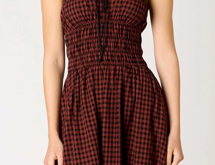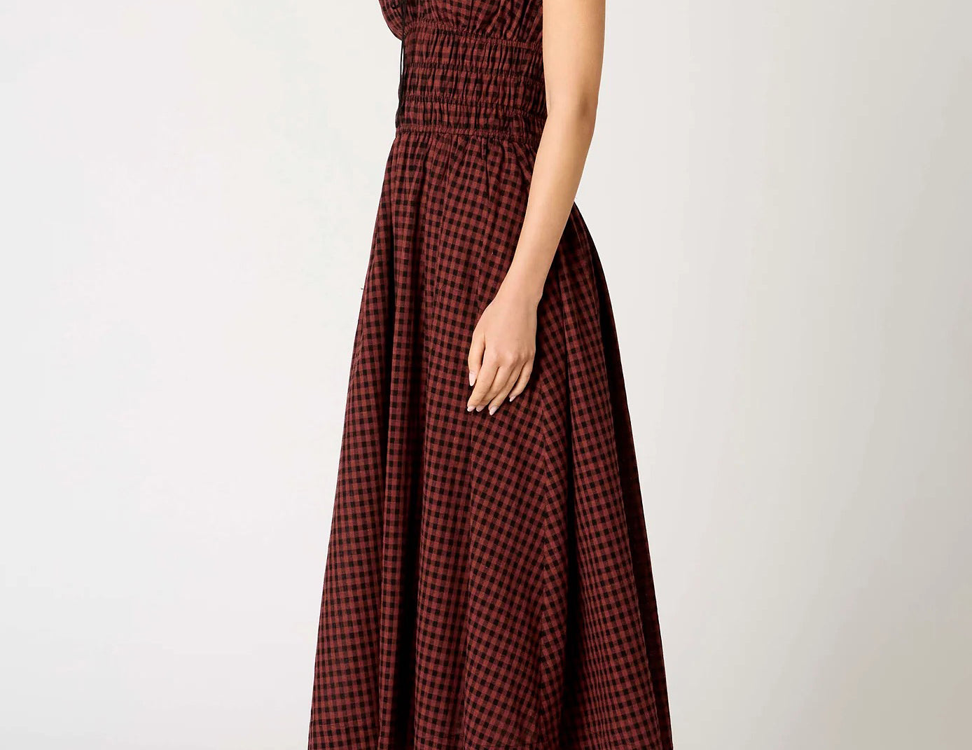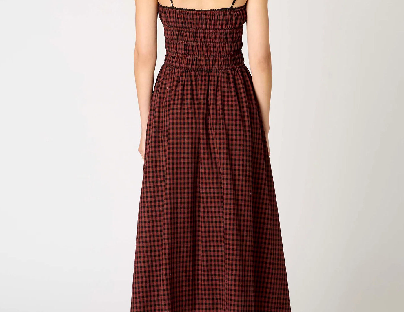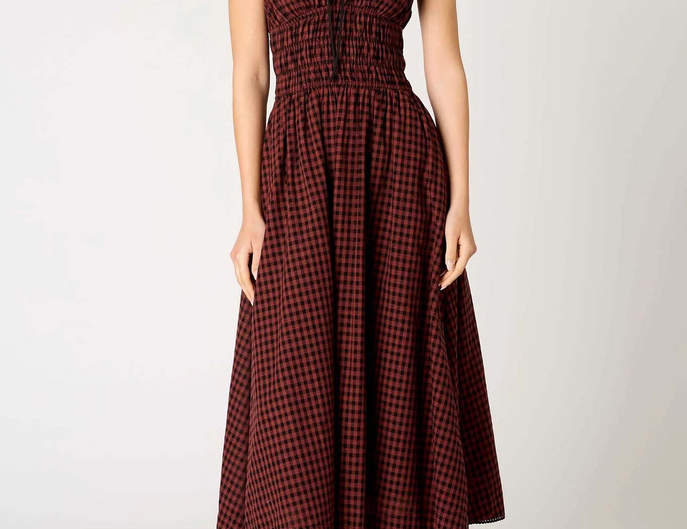 Smocking at the waistline shapes the silhouette of this dreamy cotton gingham midi, and the billowy, lace-trimmed hem sways with every step. The Thomas is cut from soft cotton in deep sable red and black gingham, featuring pretty scalloped detailing at the neckline and finished with slim straps at the shoulders. Try this vintage-inspired dress with heeled boots and a matching red lipstick for an edgy finish.
