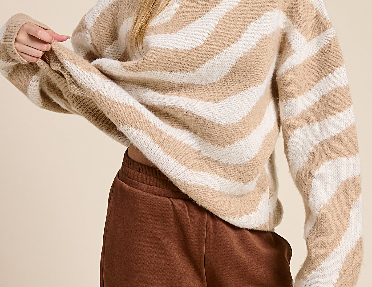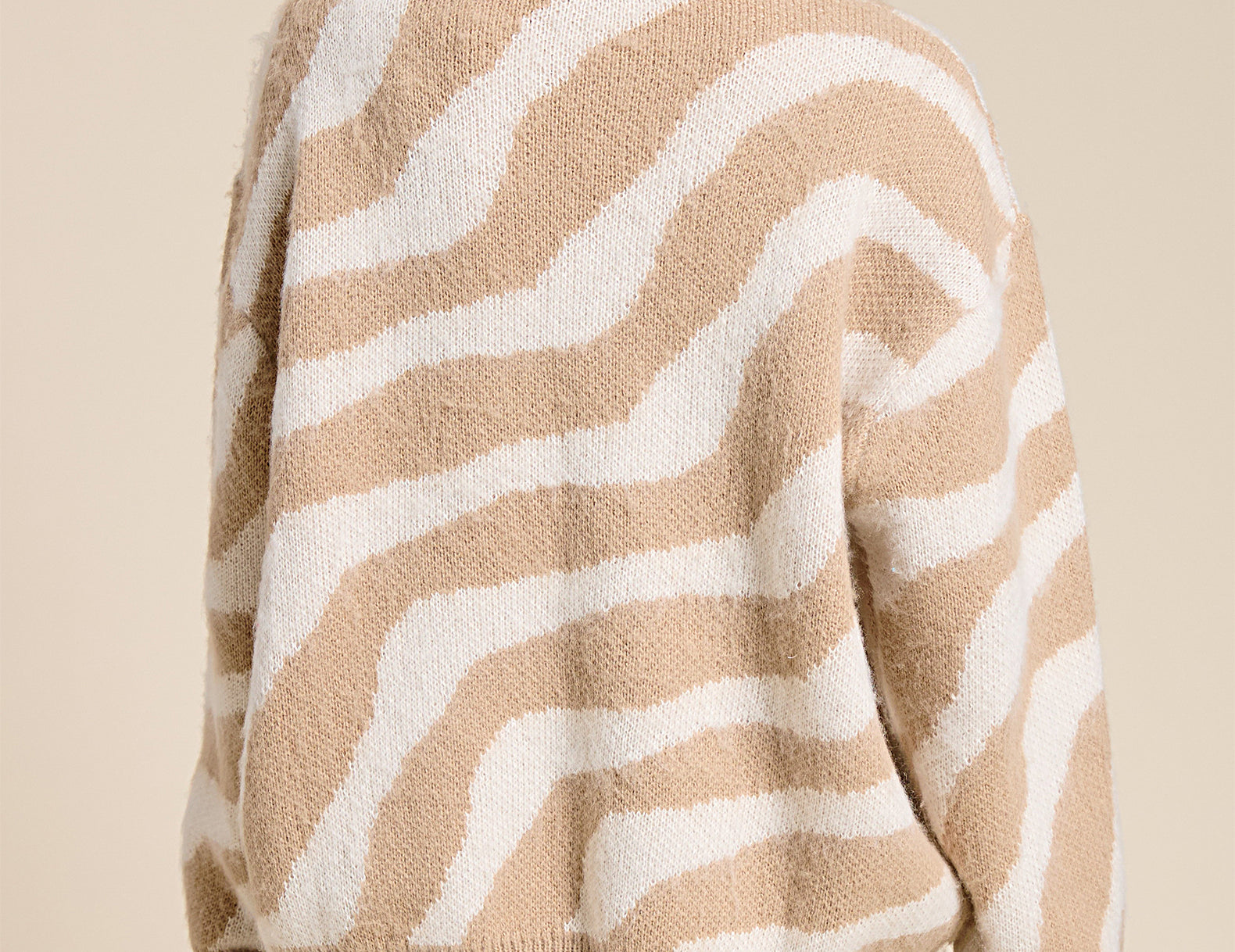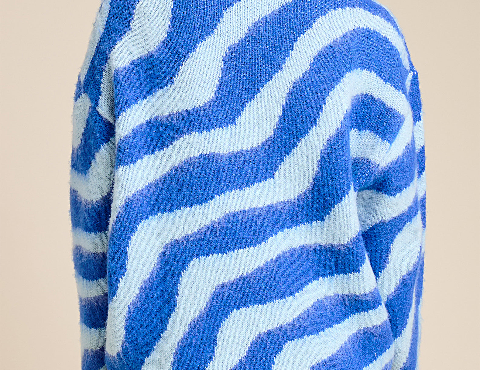 So cozy in a throw-on-and-go fit, the Tobie sweater is ultra relaxed in a thigh-grazing silhouette with dropped shoulders and chunky ribbed edges. Featured in an artful wave print against a fuzzy, plush knit—add a splash of color to your sweater stack with the azure blue, or keep it classic with the creamy taupe.