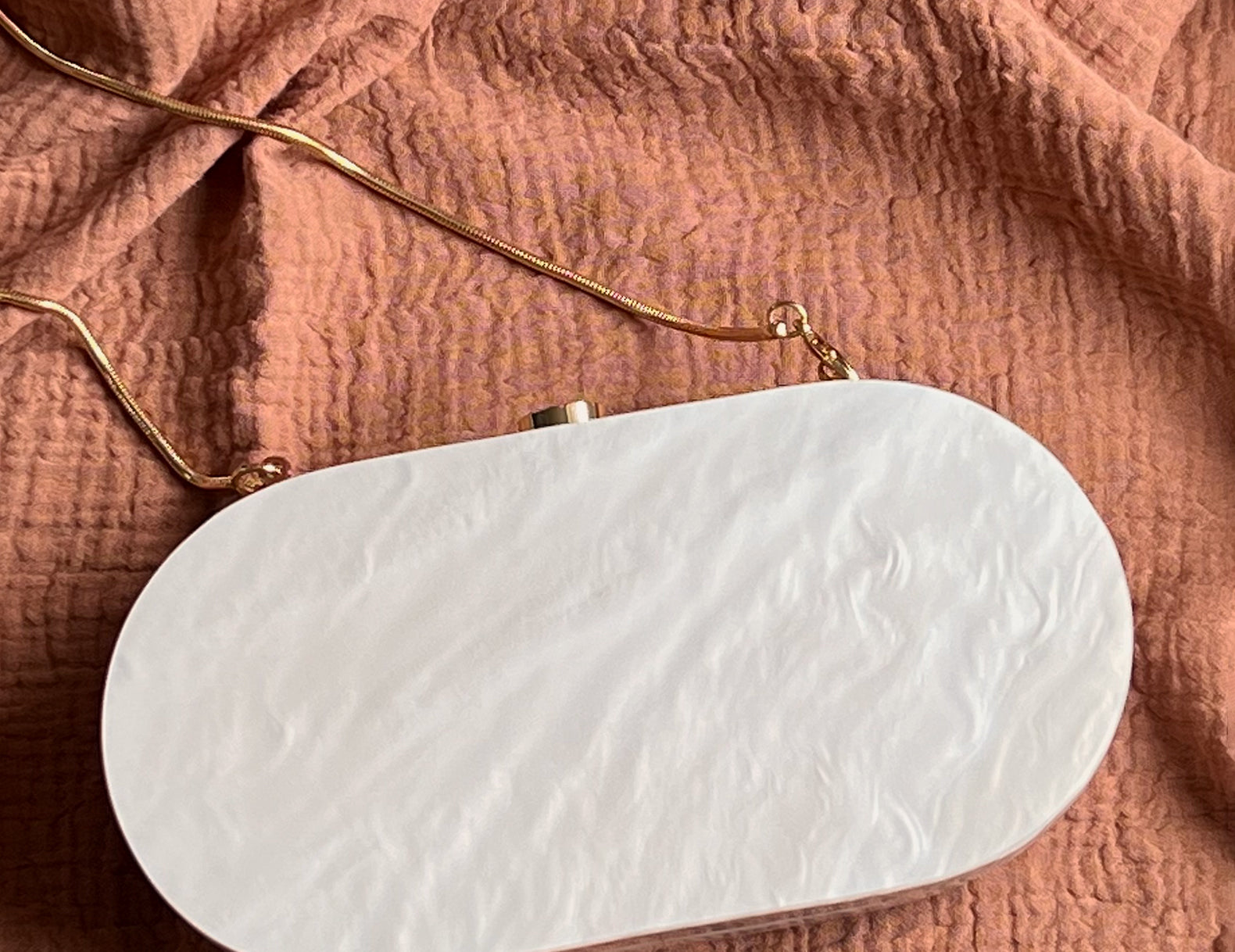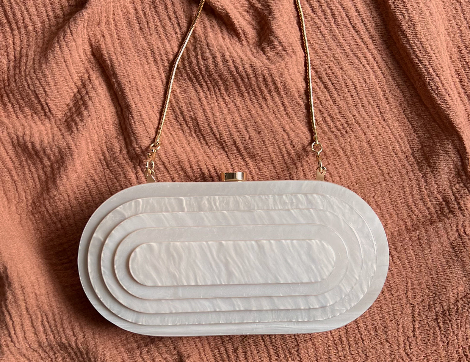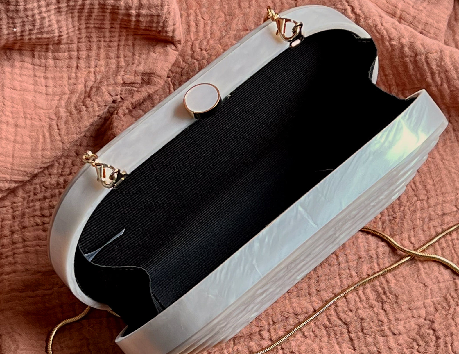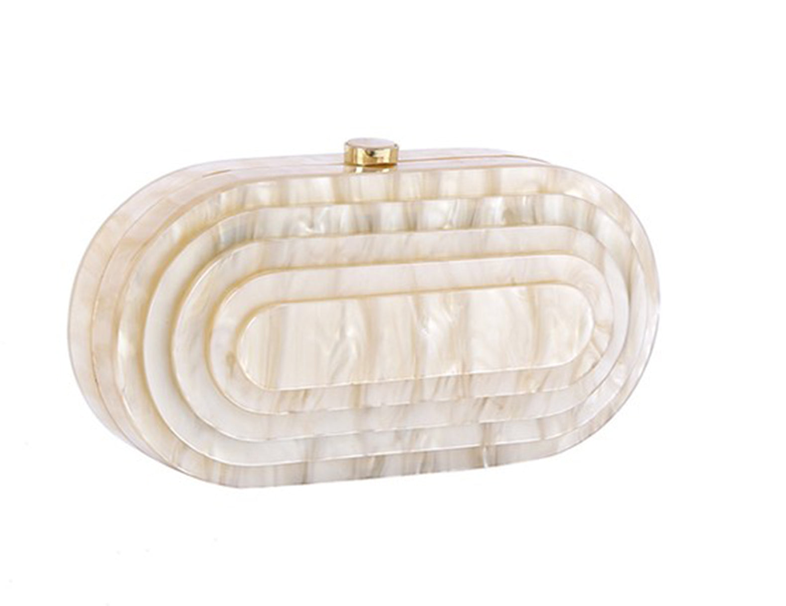 Elegant in a mid-century deco design, this geometric clutch is designed in a hard-shell, pearlescent acrylic with a magnetic top closure and optional gold-tone crossbody chain. Inside you will find a black lined interior with just enough room for the essentials. Take the Trudie for a wedding RSVP or as the finishing touch for a holiday party fit.