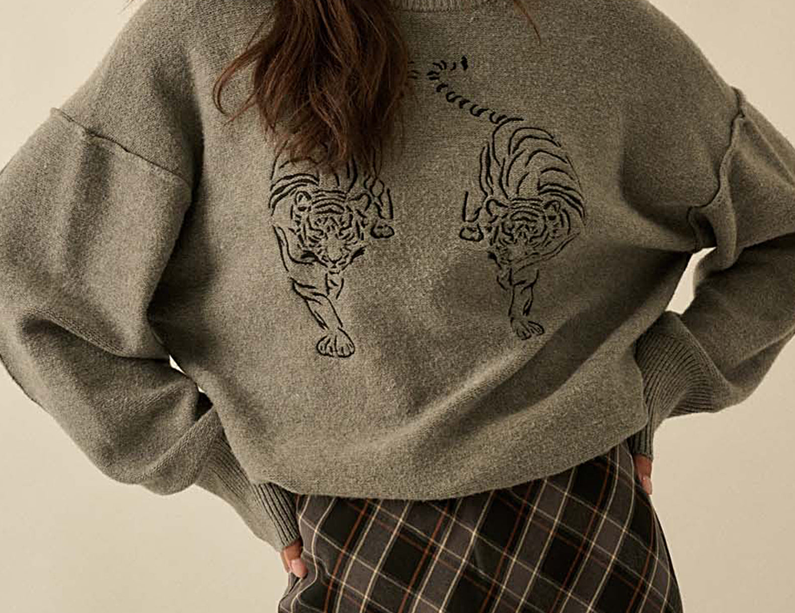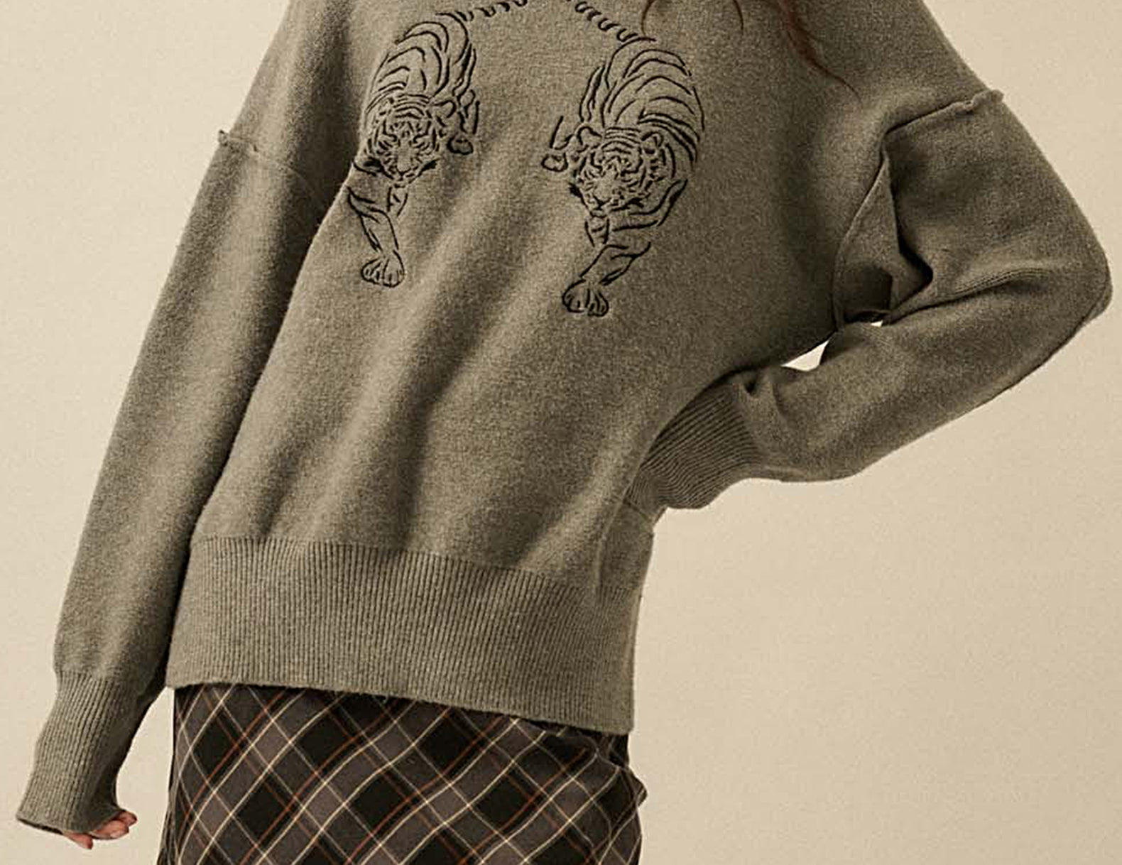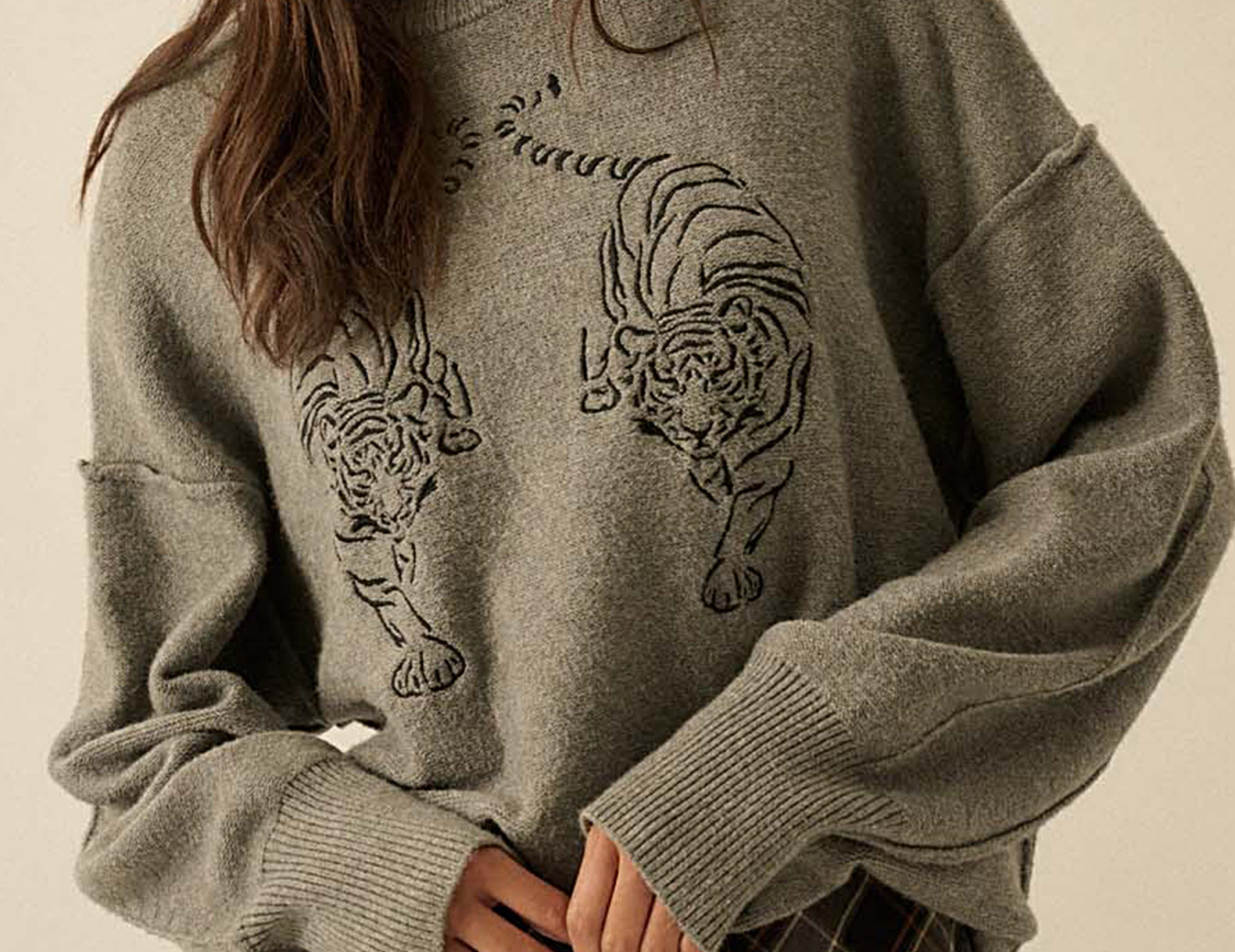 In a plush and weighted fog grey knit, this cozy, oversized sweater features mirrored tigers embroidered in black thread. It's constructed with exposed, inside-out seams at the dropped shoulders and down the length of the voluminous sleeves, then finished with a ribbed neckline and sleeve cuffs. Pair this warm layer with black trousers and silver loafers for a low-key yet eclectic look.