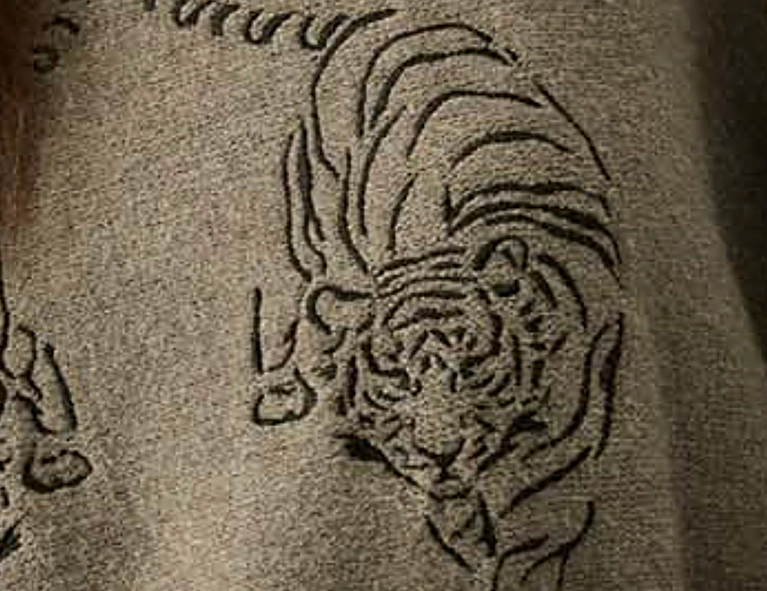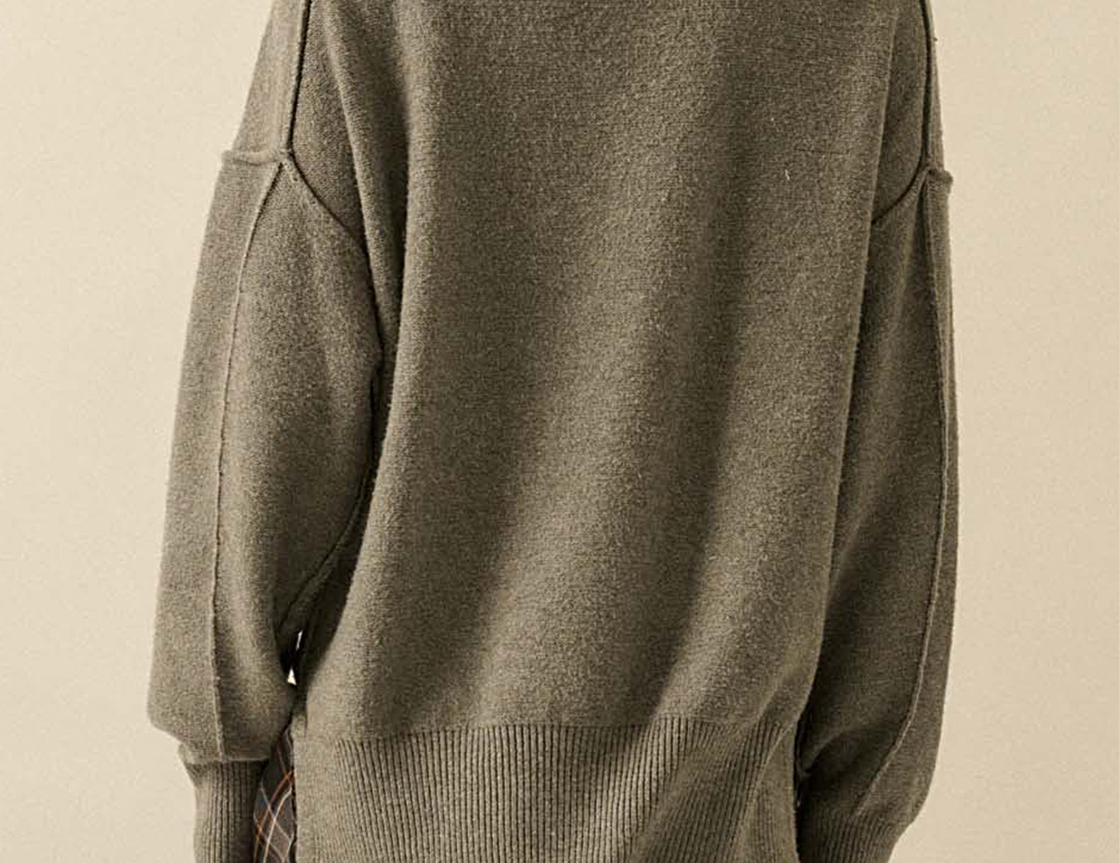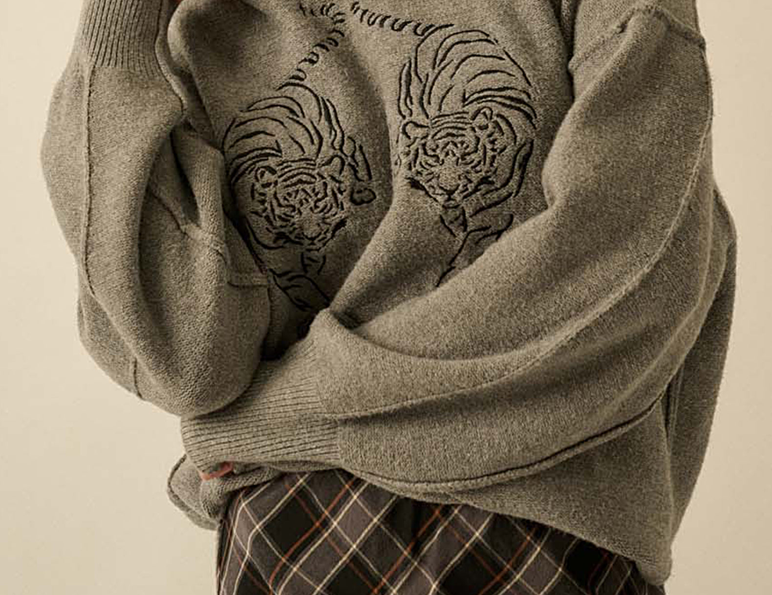 In a plush and weighted fog grey knit, this cozy, oversized sweater features mirrored tigers embroidered in black thread. It's constructed with exposed, inside-out seams at the dropped shoulders and down the length of the voluminous sleeves, then finished with a ribbed neckline and sleeve cuffs. Pair this warm layer with black trousers and silver loafers for a low-key yet eclectic look.