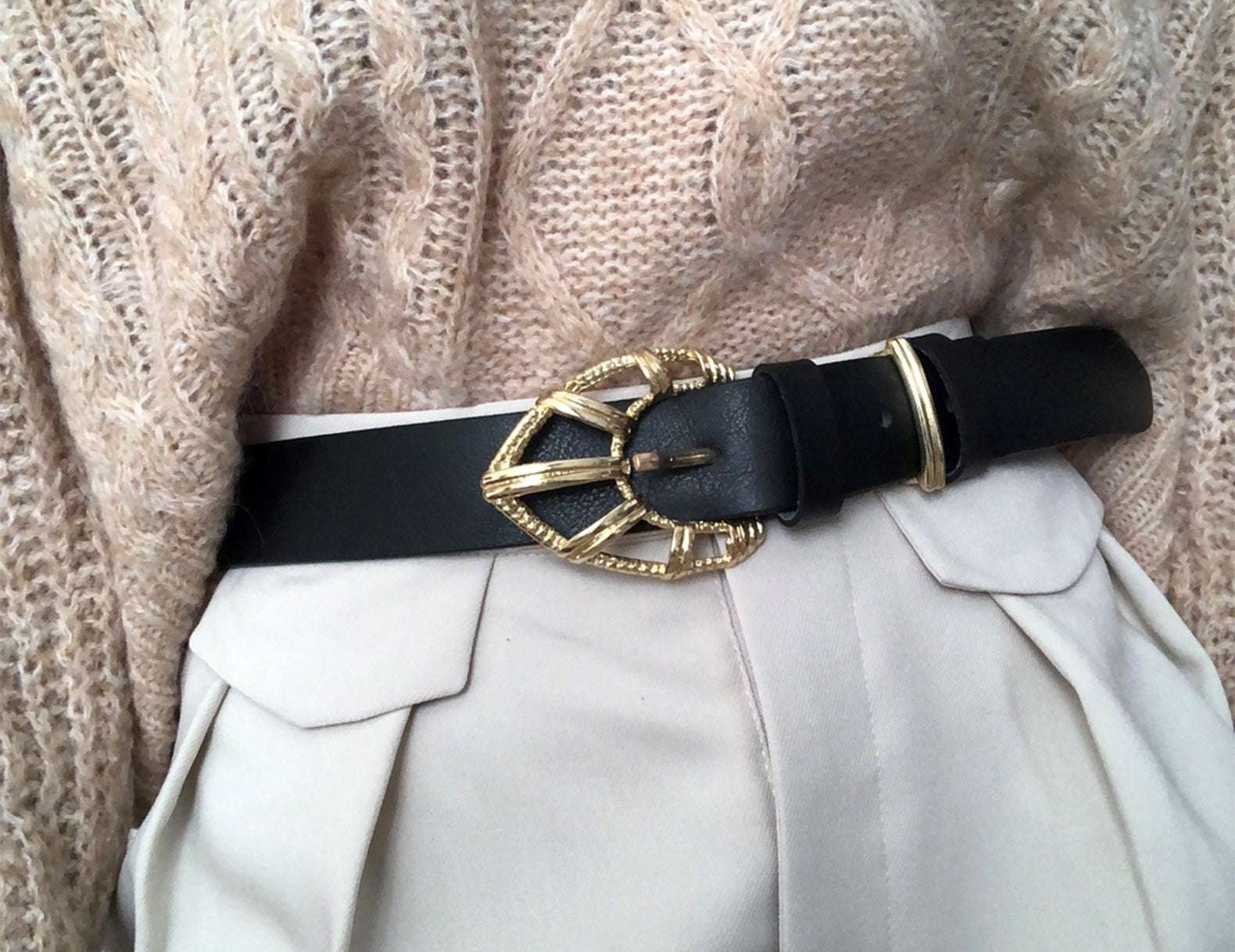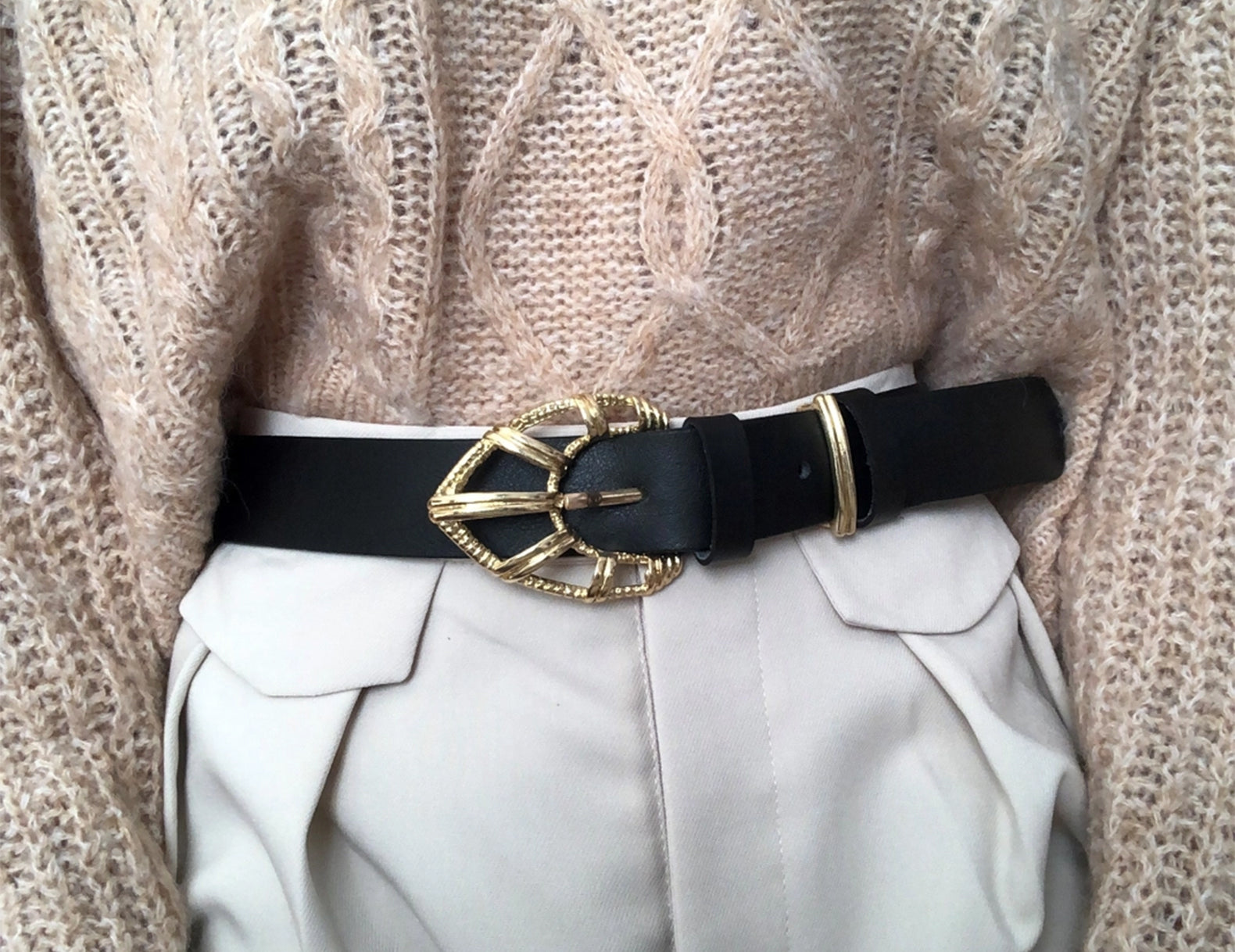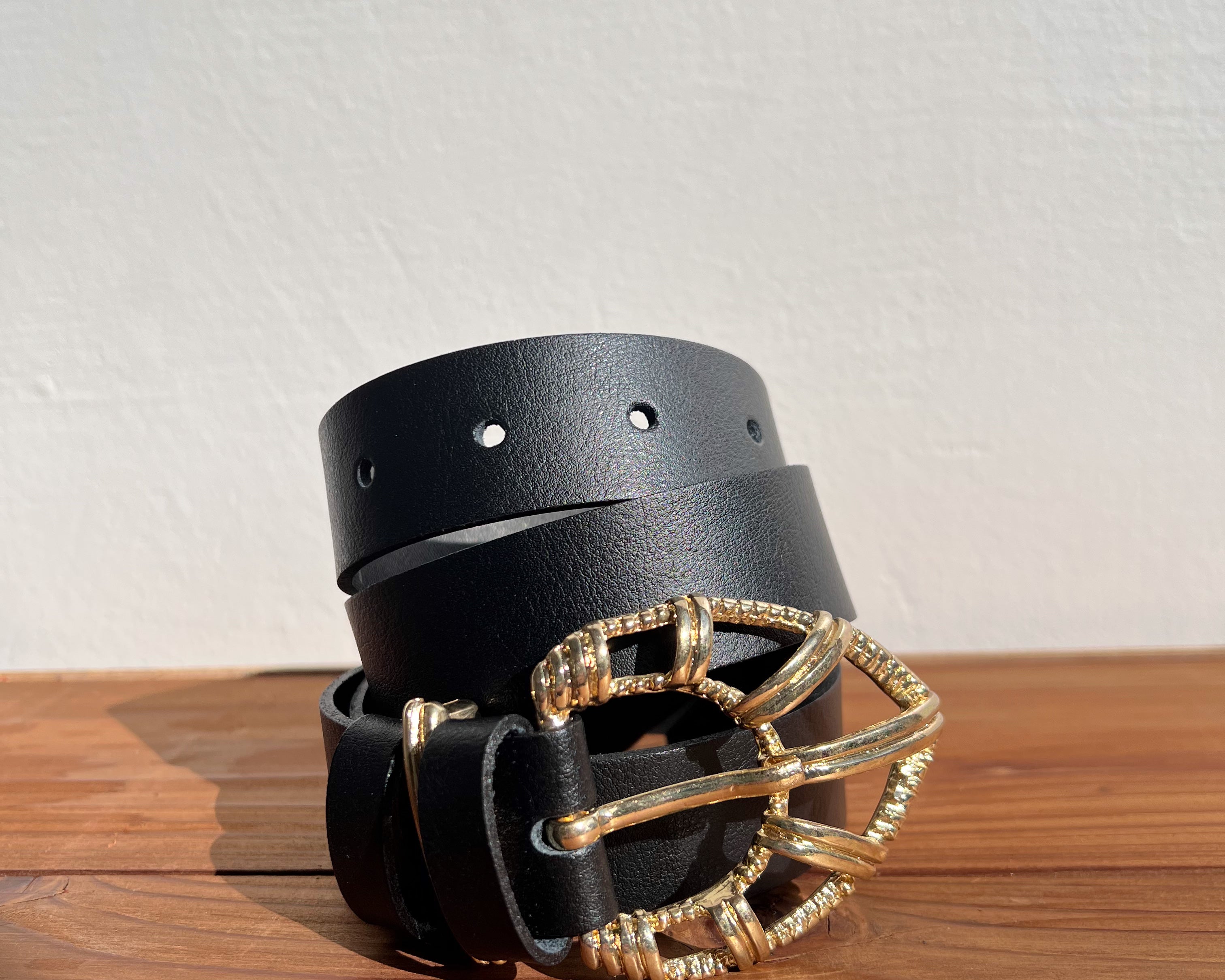 Adding both shape and texture to any outfit, the Venus belt is crafted in a heavy grain black leather with a gold-tone statement buckle and matching gold-tone loop. Wear it at the waist or hips paired your favorite printed dress or tweed trousers.