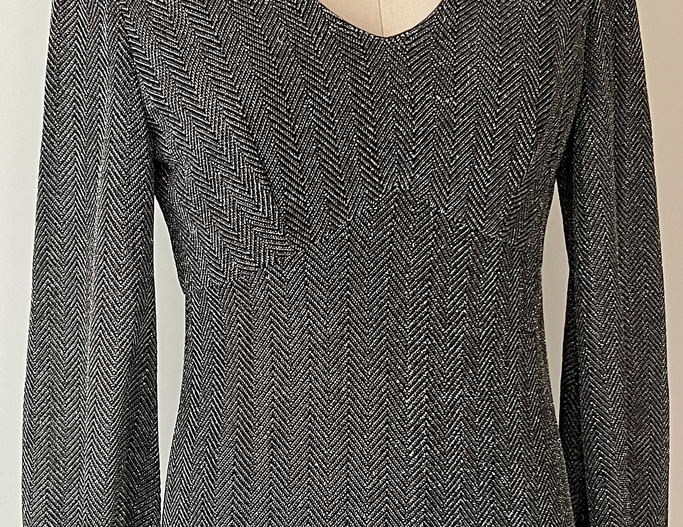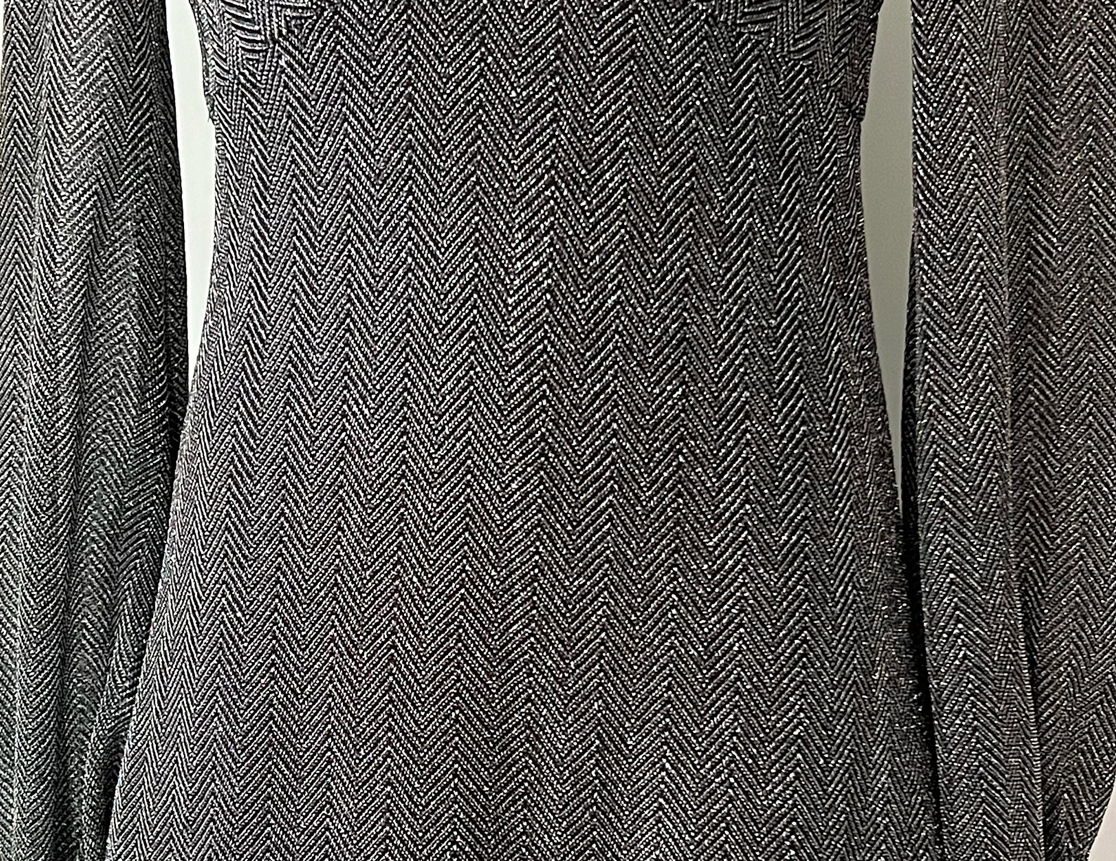 Glittery and texture-perfect in a silver herringbone fabrication that’s sheer at the billowy bishop sleeves