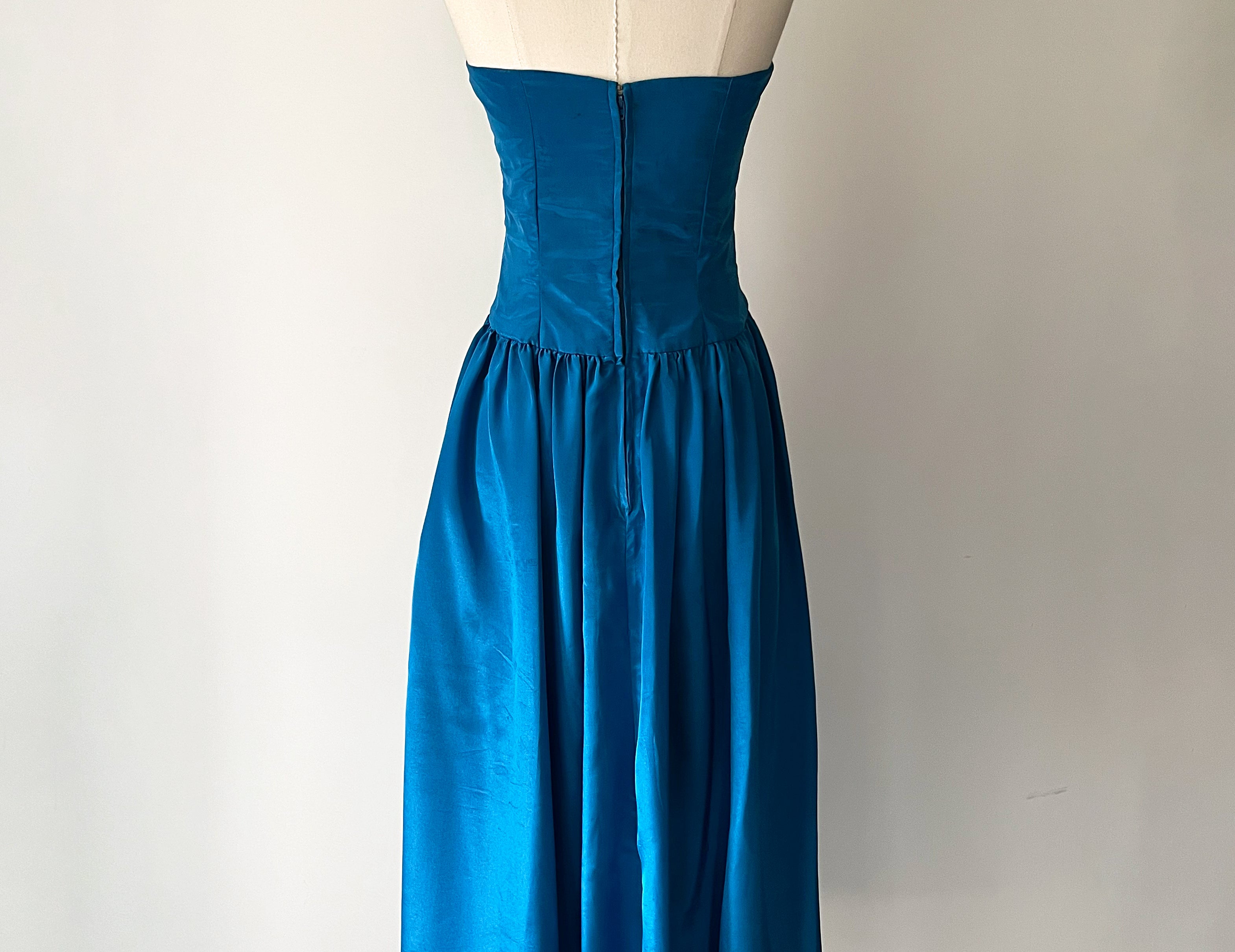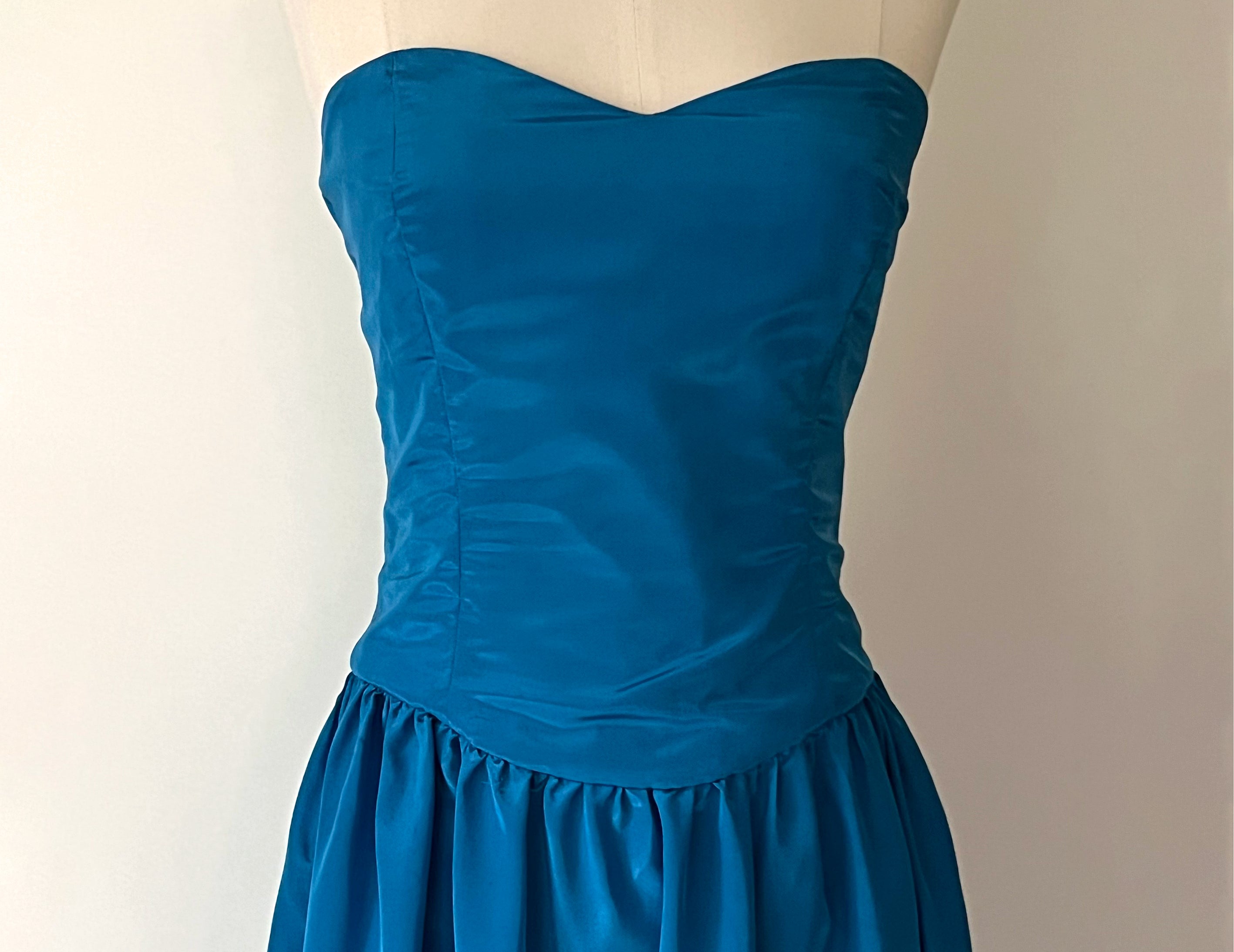 Vintage 1980s Cerulean Blue Satin Strapless Sweetheart Dress