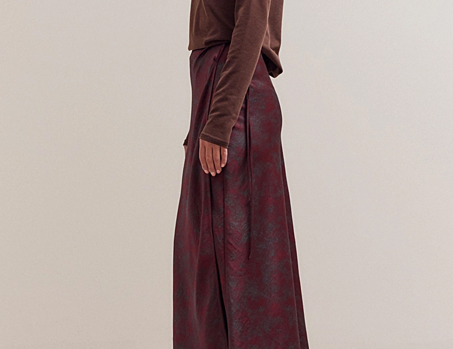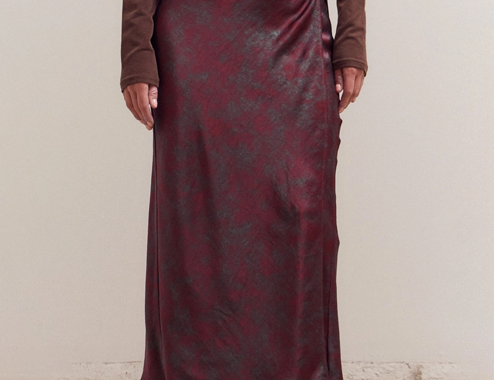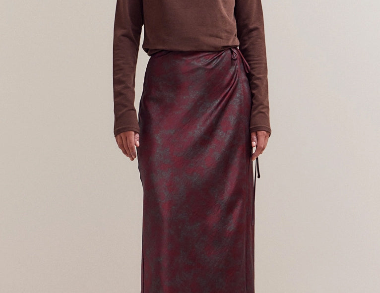 Wrapped in a timeless silhouette, the Yvonne skirt features a waist-hugging design that’s smooth, sweeping, and ties at the side. Cut from a weighted, silken burgundy satin that’s dappled in deep emerald throughout, try this elevated wrap skirt with heeled boots and sweaters, or give it a holiday finish with a lace top and pointed heels.